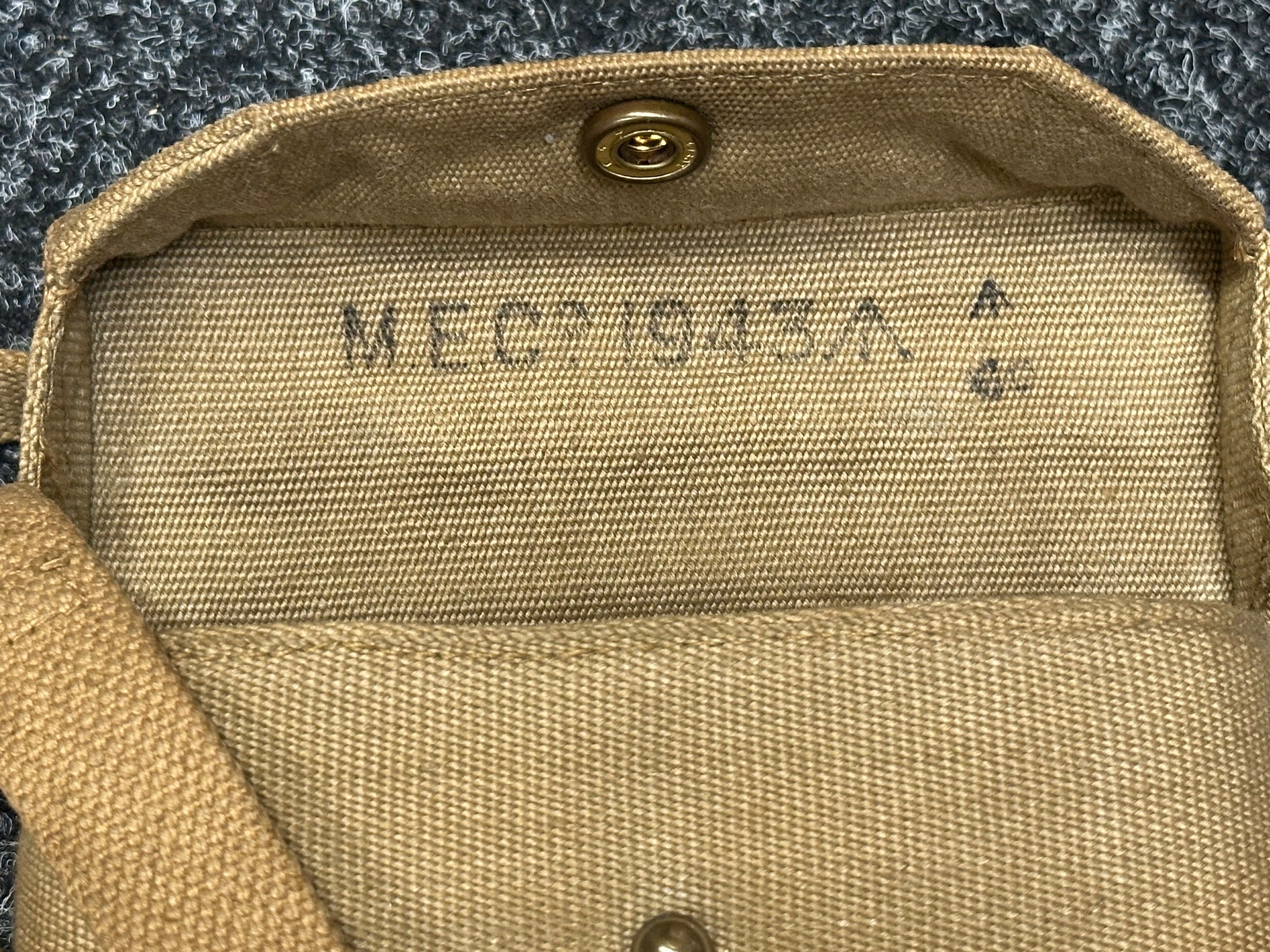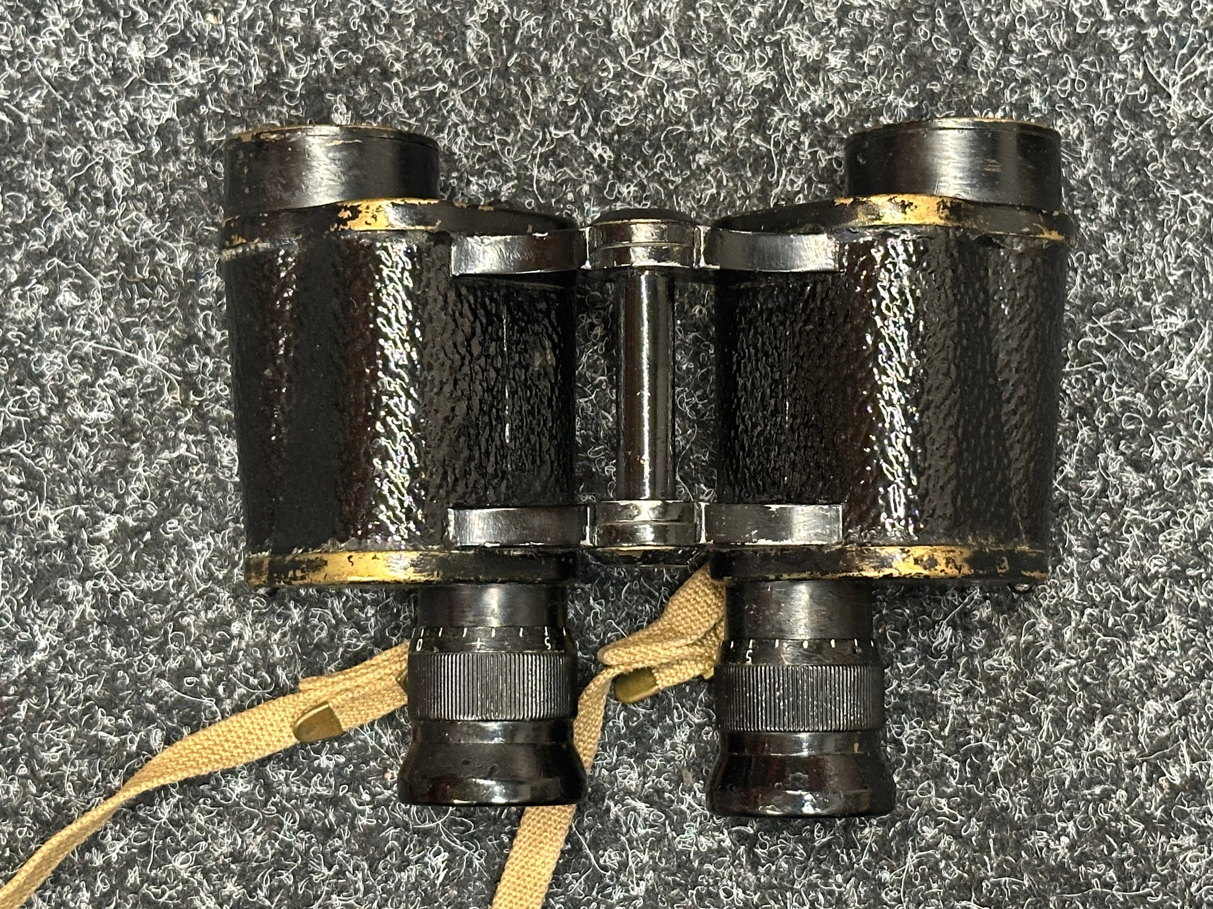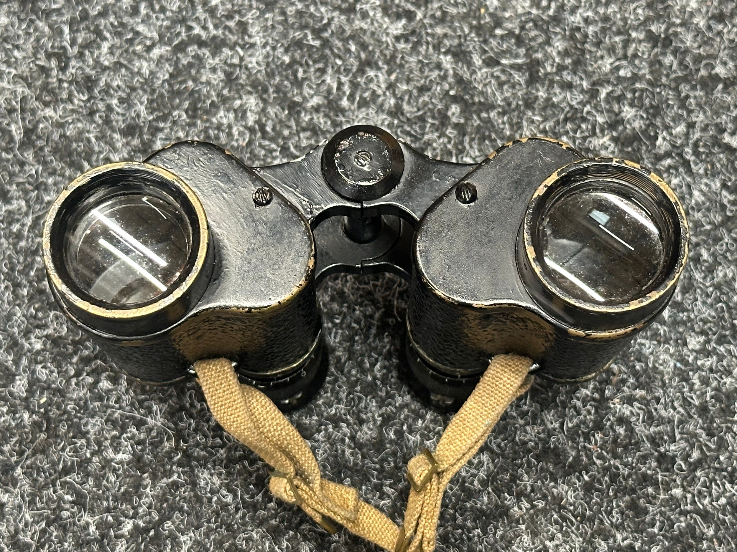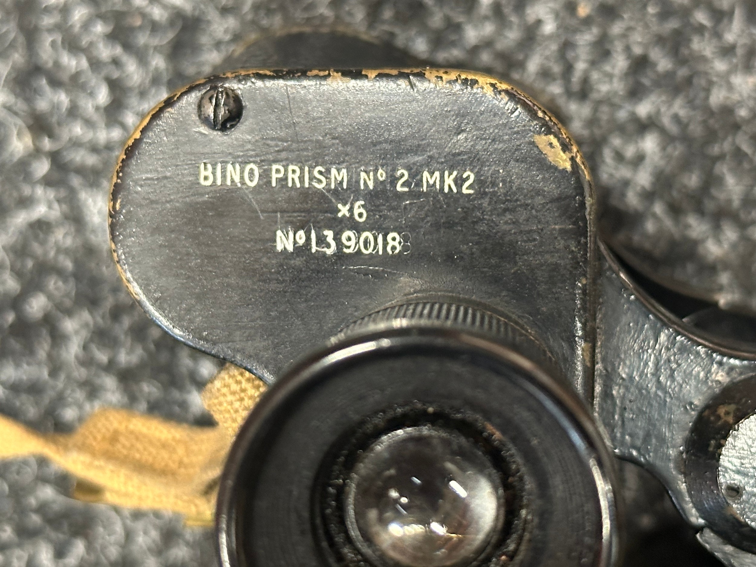 WW2 British Binoculars Prism No.2 MK2 x 6 serial number 139018. Maker marked and dated "Kershaw 1942". Complete with webbing neck strap and 1937 pattern webbing case maker marked and dated "MECo 1943" with sling.