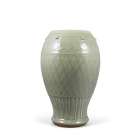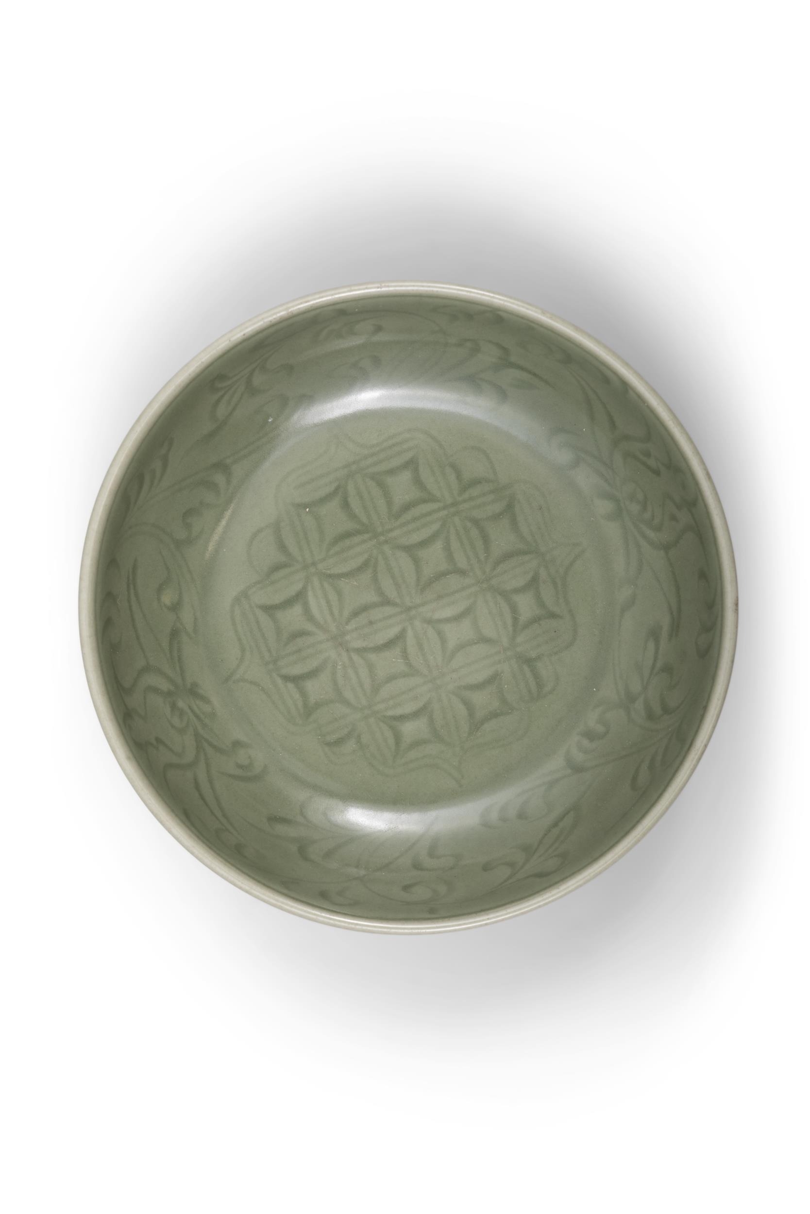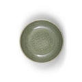 A LONGQUAN STYLE, CELADON-GLAZED CARVED 'FLORAL' DISH WITH INTERIOR CARVED WITH A TRELLIS DIAPER ?? ????? China, 20th century D: 14.5cm
