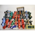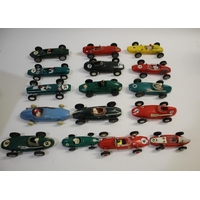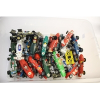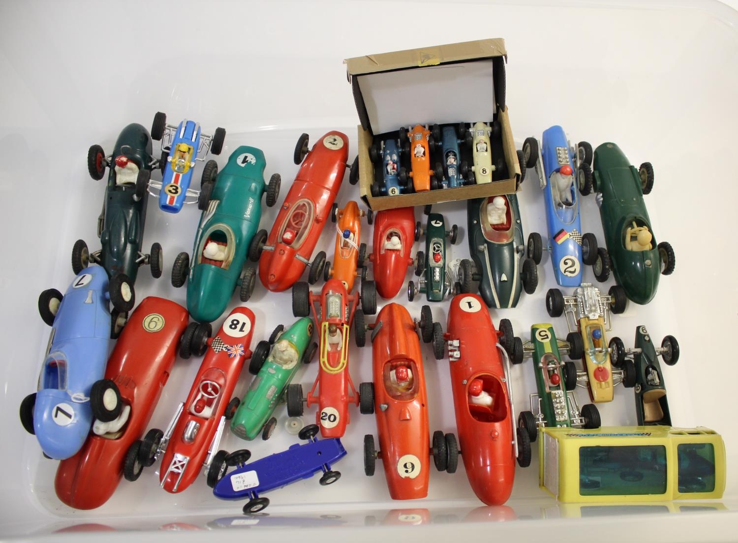 PLASTIC RACING CARS a qty of Hong Kong made racing cars by Marx, Lucky and others, some friction drive, includes Telsalda Telsa Racing Team Car Transporter and ELM friction drive Vanwall. (26)