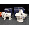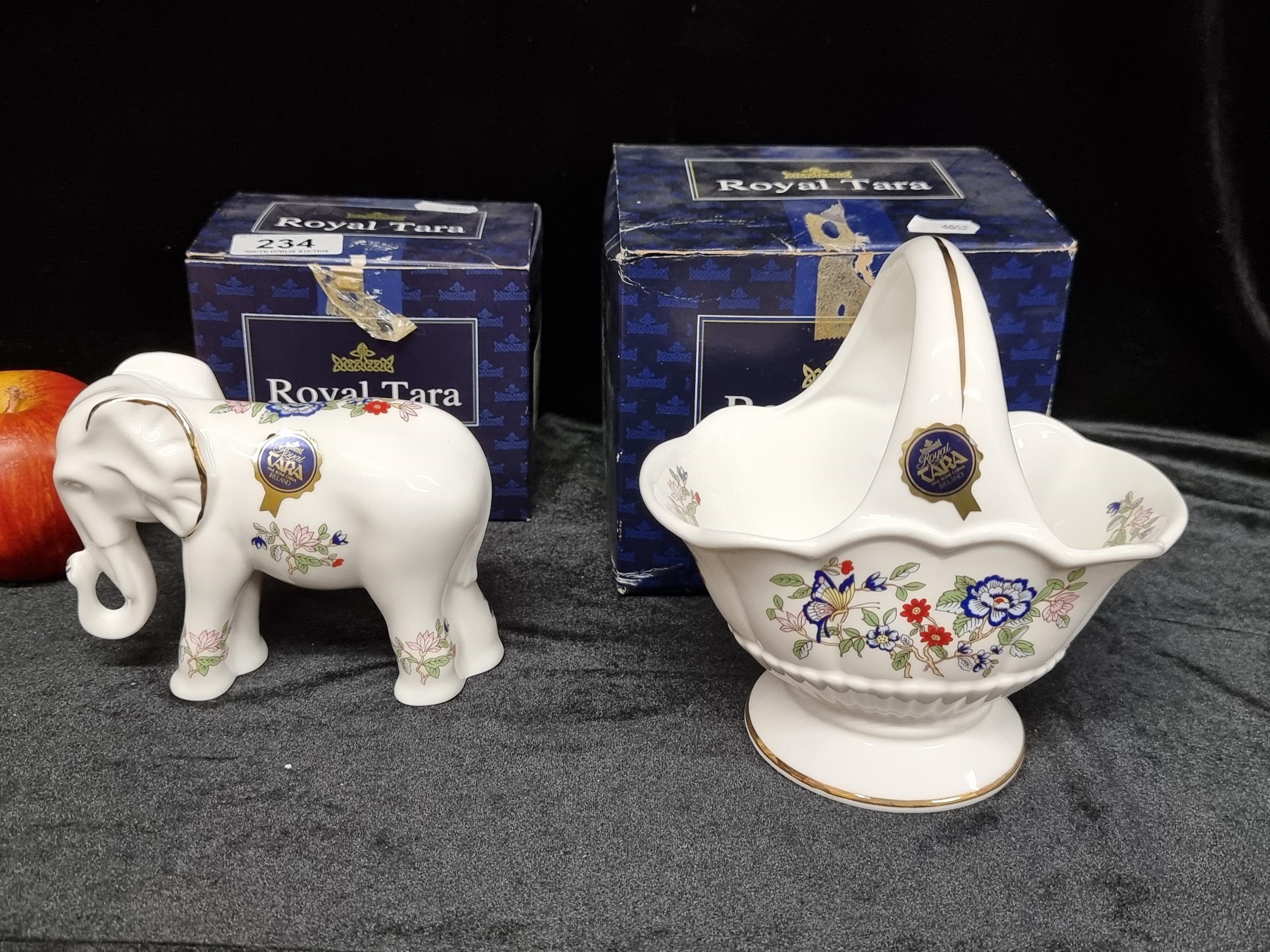 Two "Royal Tara" fine bone china items in the harmony pattern. Collectible pieces. Including an elephant (Model 449) and a candy basket (Model HAR 212). Both in original boxes and in excellent condition.