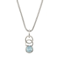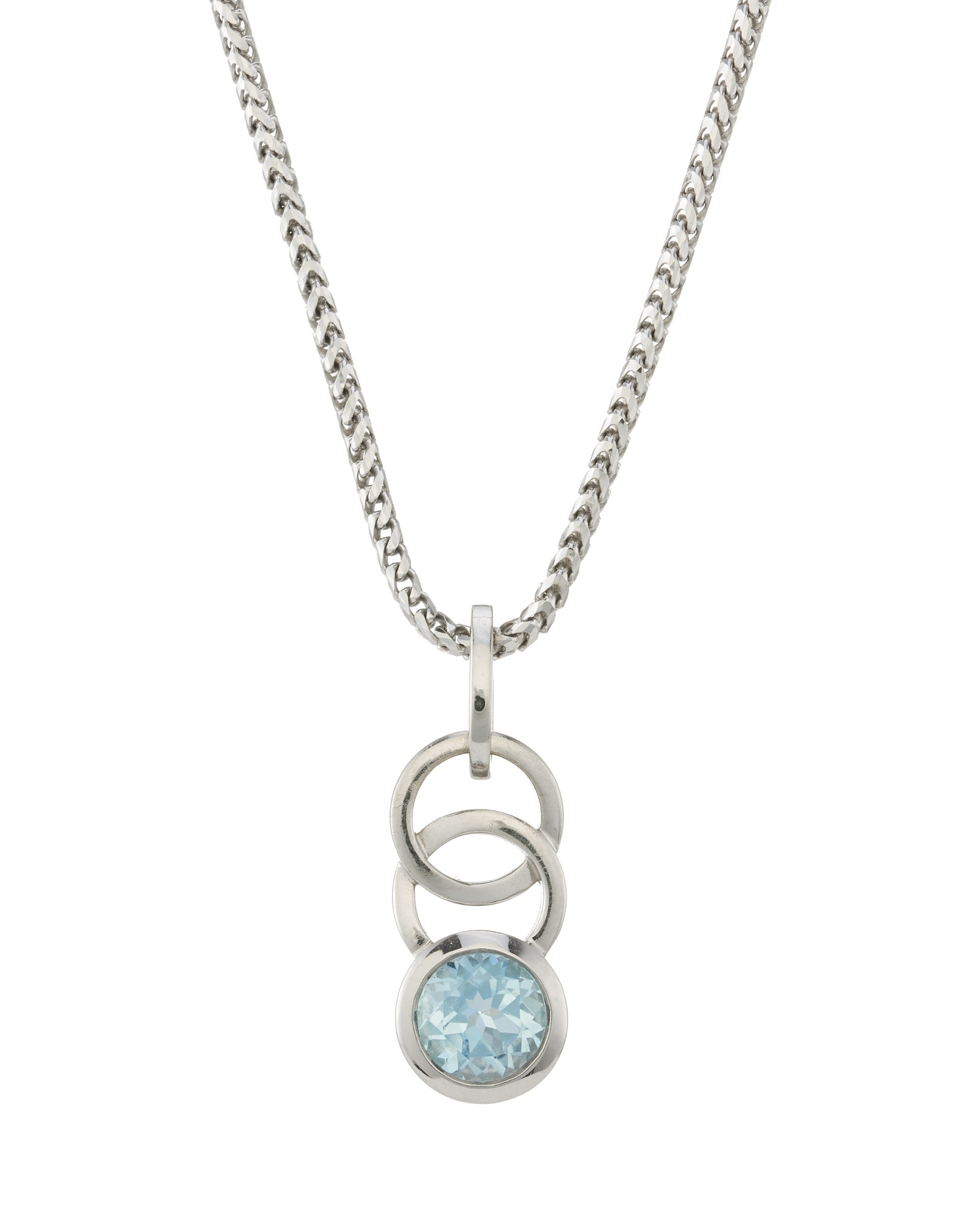 A 9ct gold blue topaz single-stone pendant, suspended from an 18ct gold spiga-link chain, pendant stamped 9k, chain with hallmarks for Birmingham, length of pendant 2.5cm, length of chain 39cm, total weight 9.6g