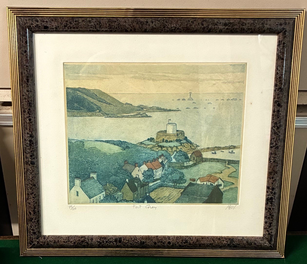 Maria Burgess Whinney (British 1914-1995) Fort Grey Guernsey, coloured etching, signed with initials and numbered 75/100 20 x 24cm.