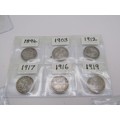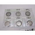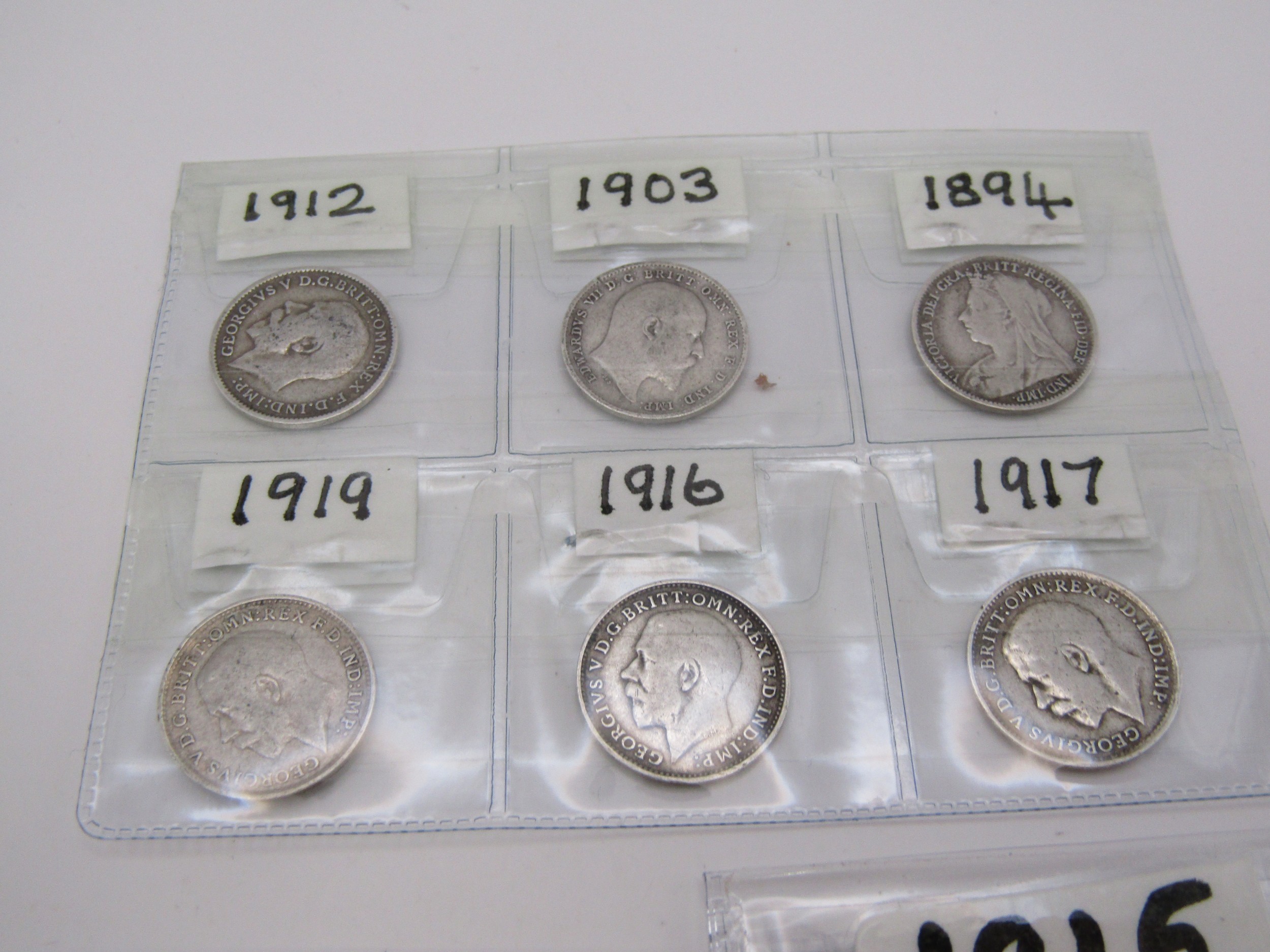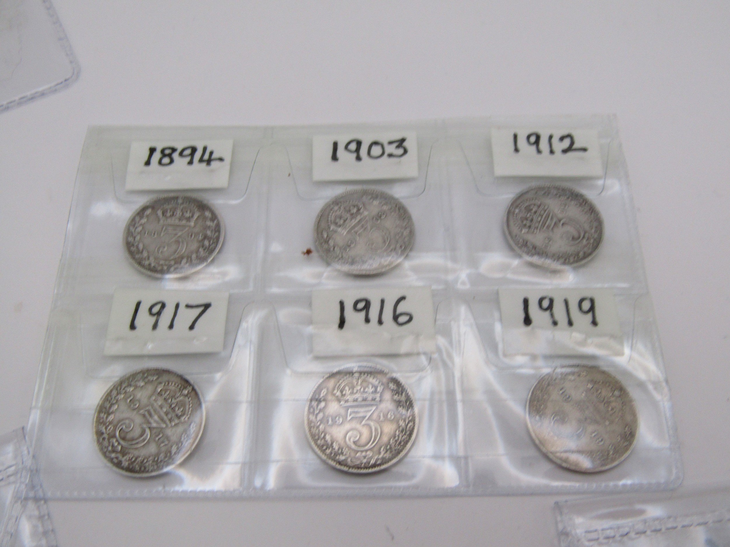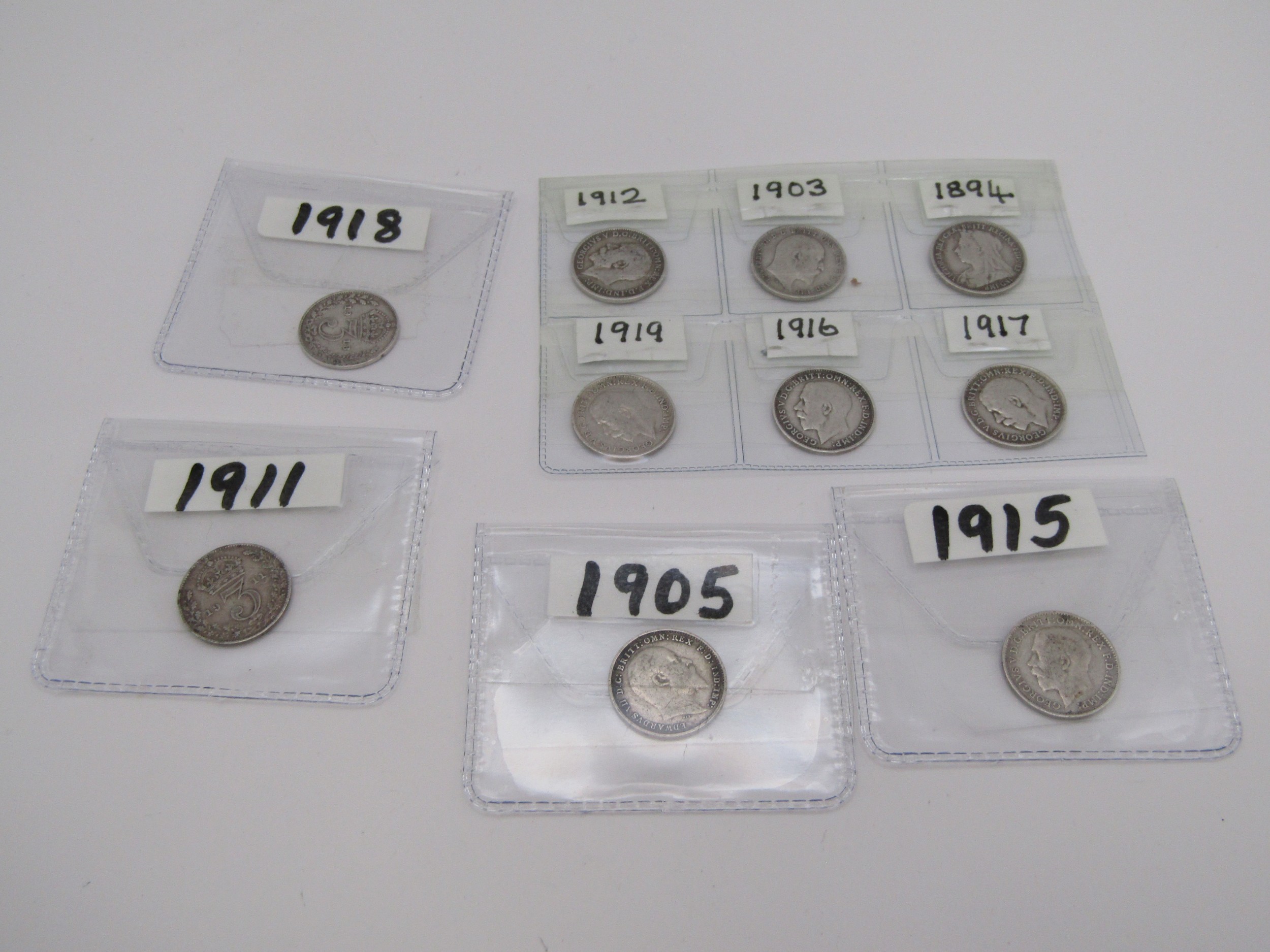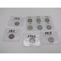 Ten pre 1920 silver Threepence coins.