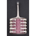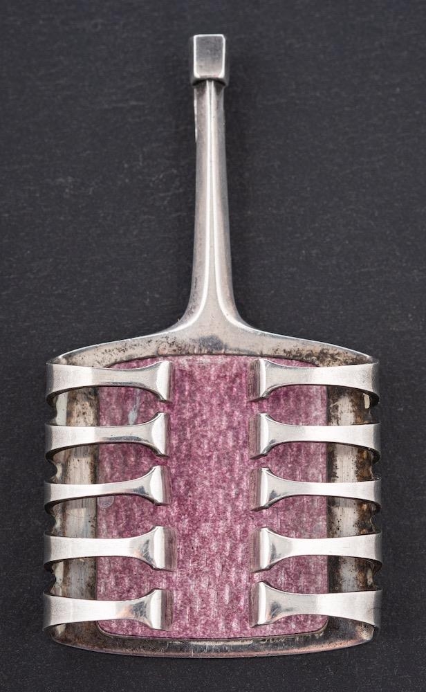 Bjørn Sigurd Østern for David Andersen, Oslo, Norway, a Modernist, silver and purple guilloche enamel pendant, post 1925 marks, total length ca. 6.5cm, total weight ca. 17.7gms.
