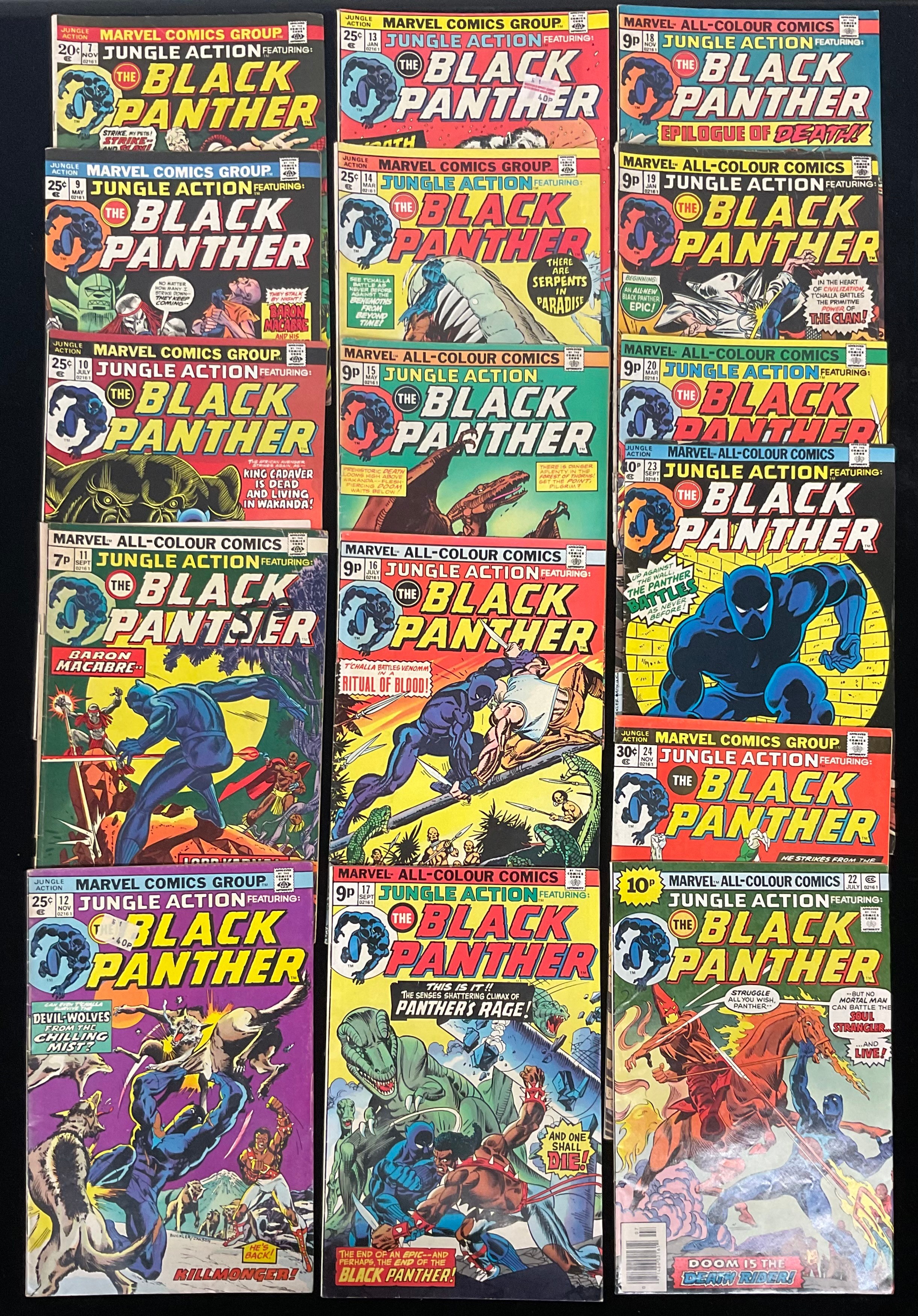 Jungle Action featuring Black Panther #7-22 (1973-76), missing issue #21. 2nd appearance of Killmonger, 1st appearance of King Cadaver, Lord Karnaj, Sombre, Salamander K’Ruel, Death of Killmonger, Black Panther vs the Klu Klux Klan, iconic cover art by John Byrne. Bronze Age Marvel Comics(16)