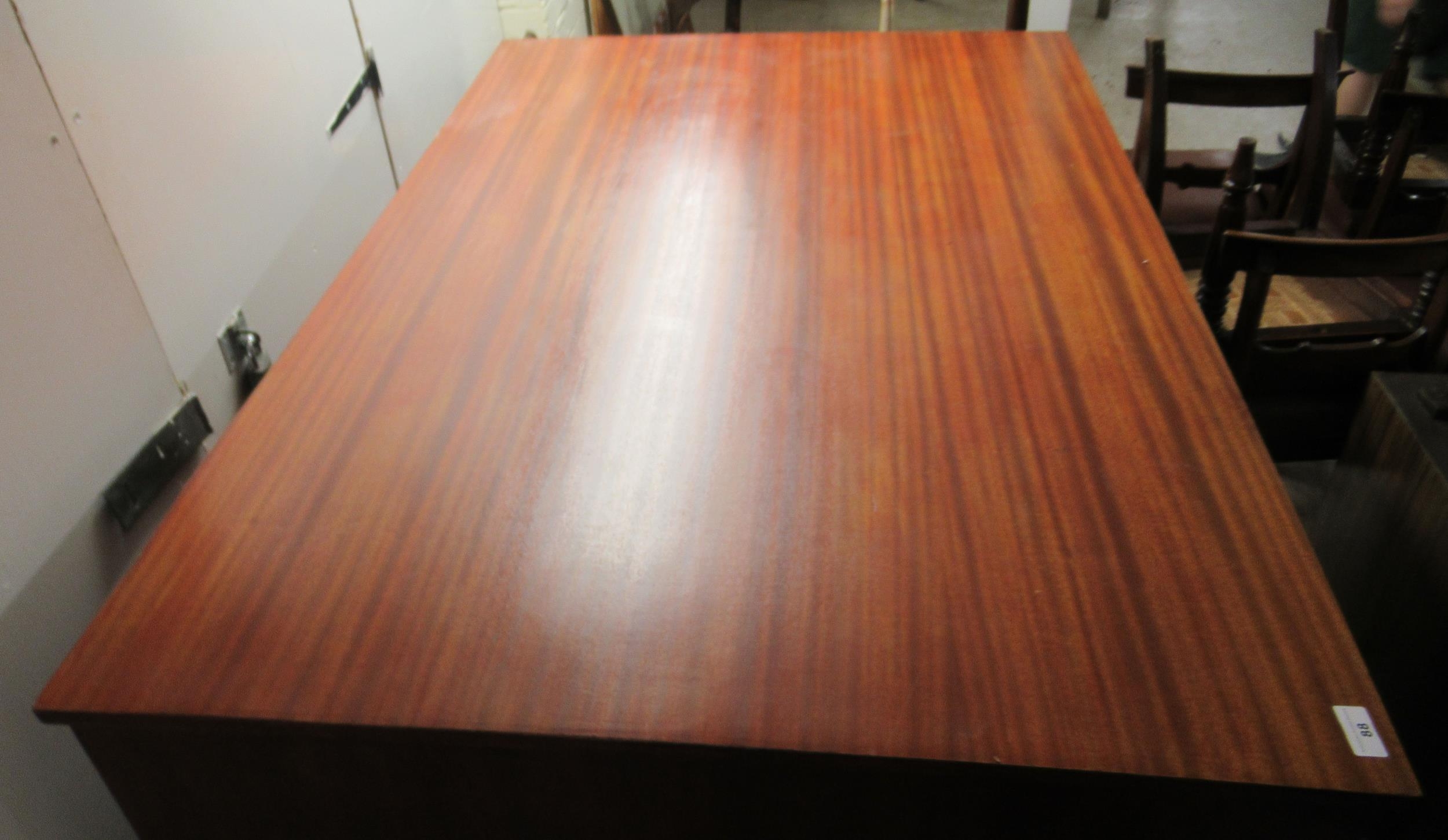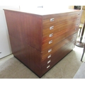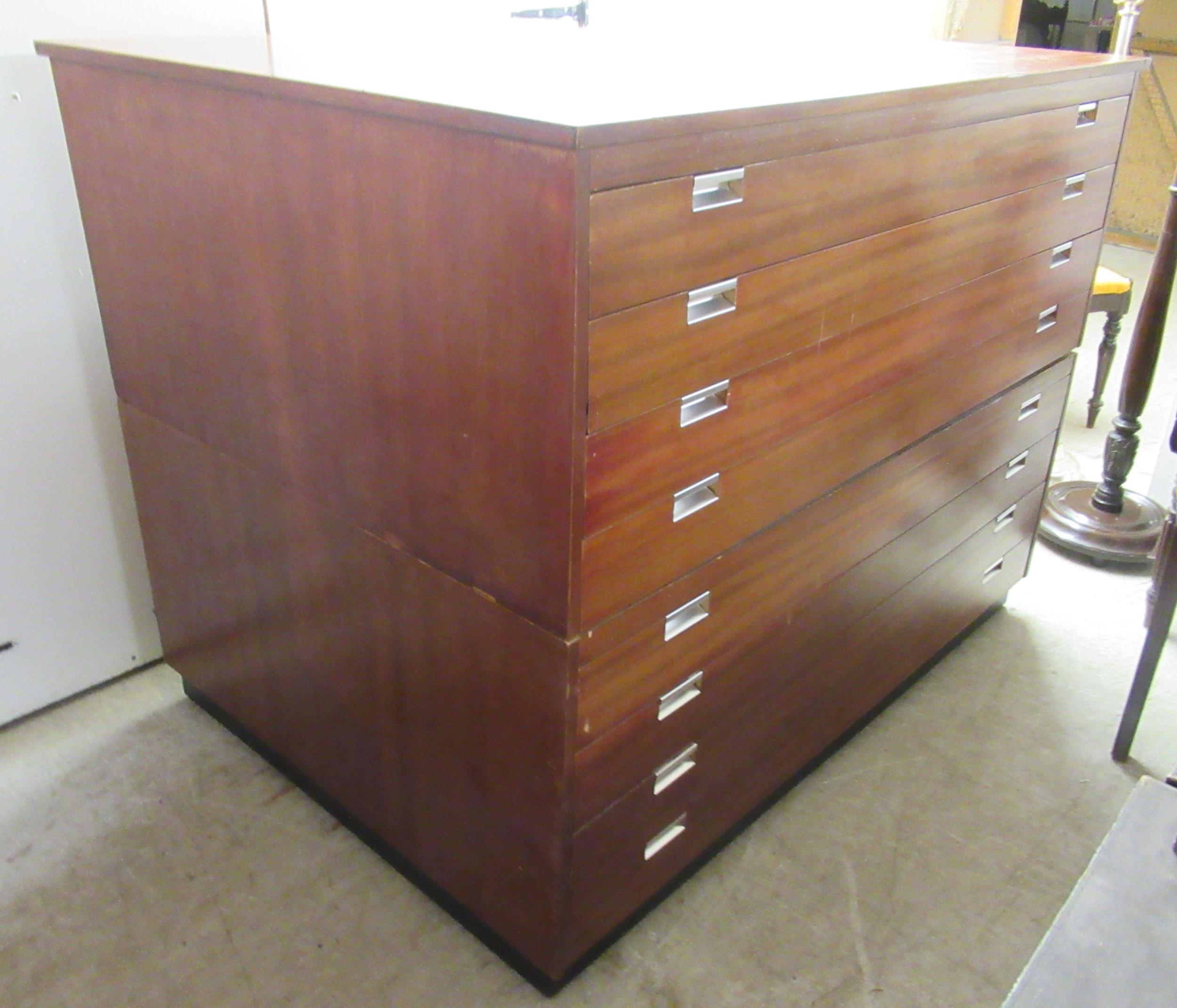 A mid 20thC teak finished two part plan chest, comprising eight equal drawers with recessed metal handles 41"h 53"w