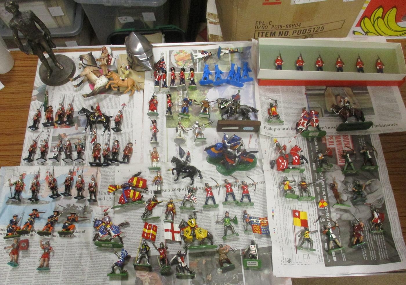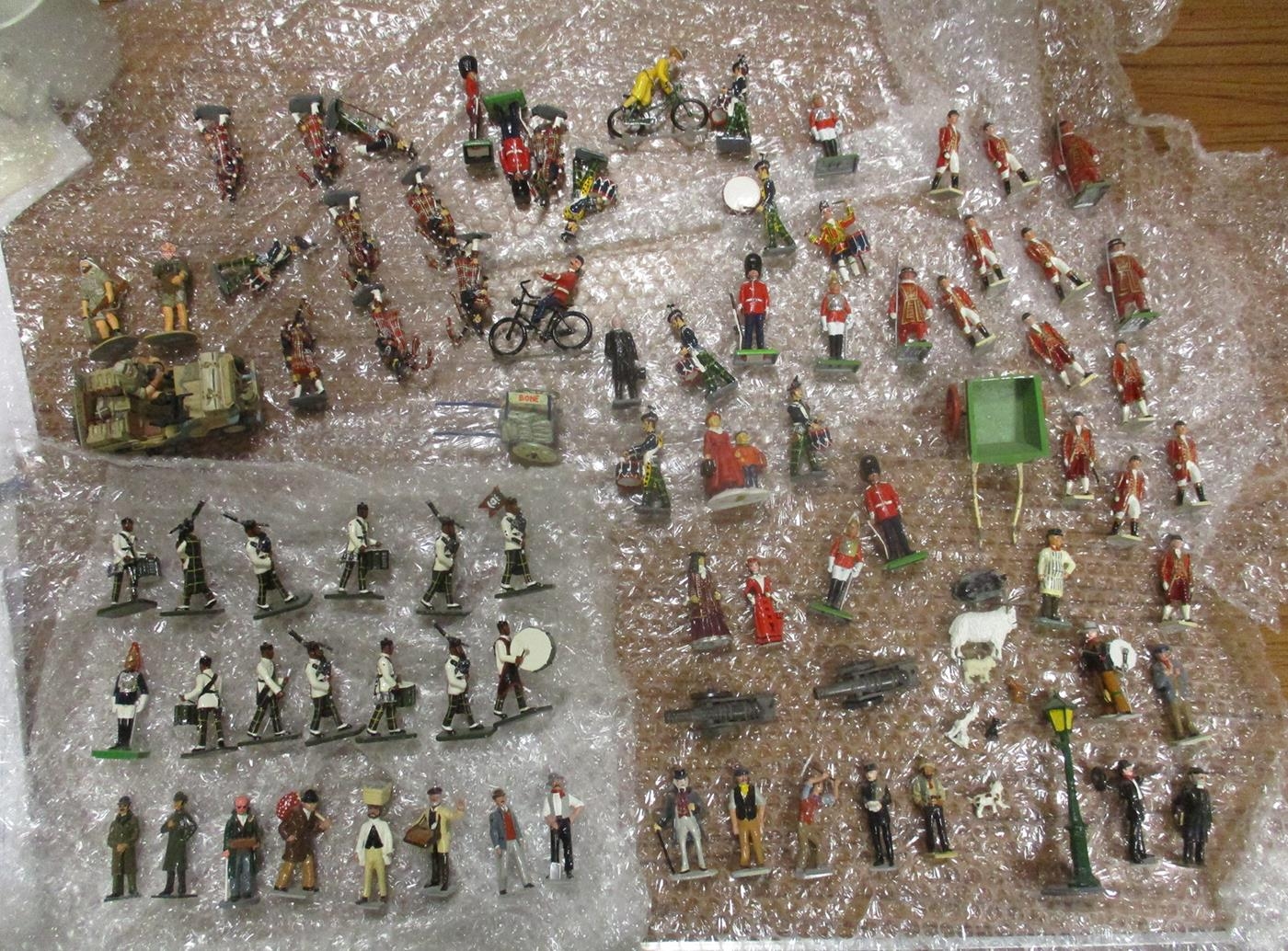 Unboxed collection in mixed condition, includes Beefeaters, Sherlock Holmes, Street Vendors, Medieval Knights and Archers, etc. Also includes Hornby Triang R651 unboxed, plus Lord Nelson statuette and Knight's Head paperweight. Qty 100+ (B)