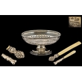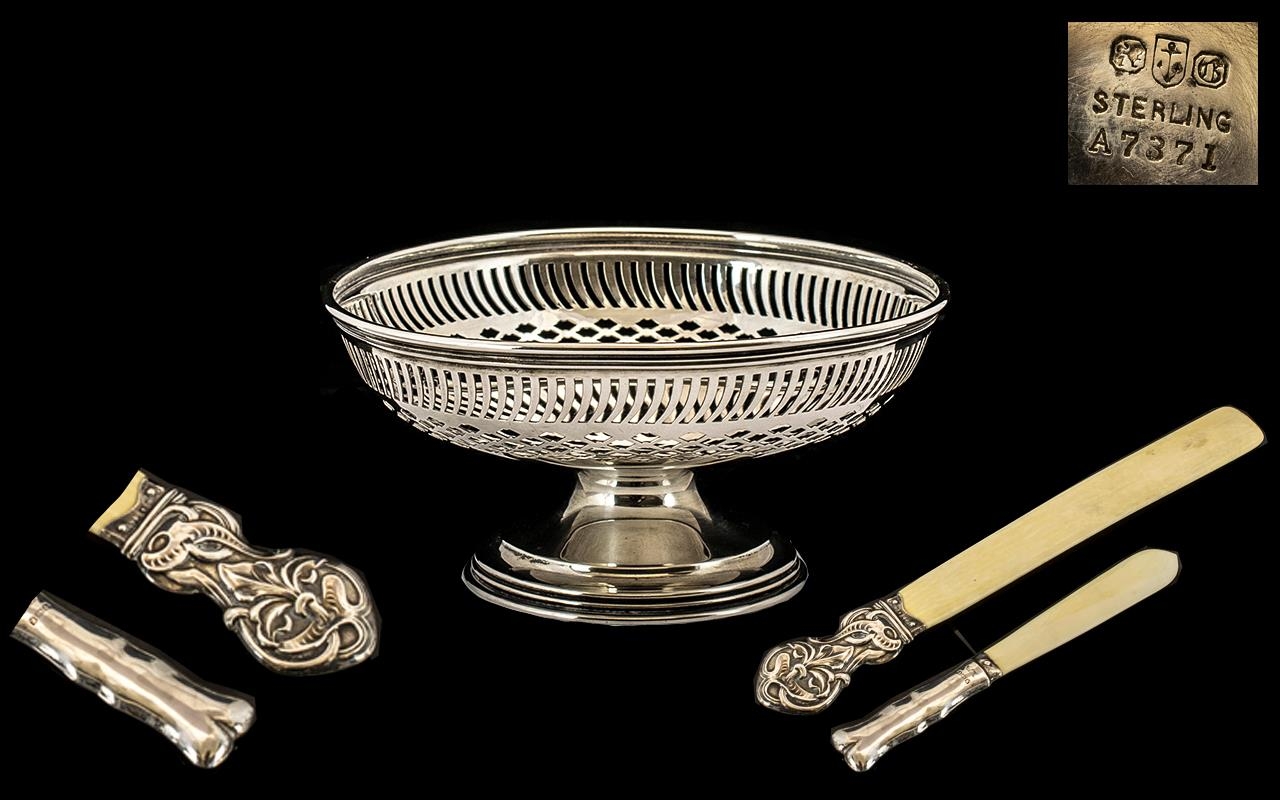 Sterling Silver Small Footed Bowl with Open-worked and Pierced Borders. Hallmark for Birmingham. Weight 93.5 grams. 4.75 Inches - 11.90 cm Diameter + Two Edwardian Period Ornate Silver Handle Letter Openers. Hallmark Birmingham 1904 & Birmingham 1907.
