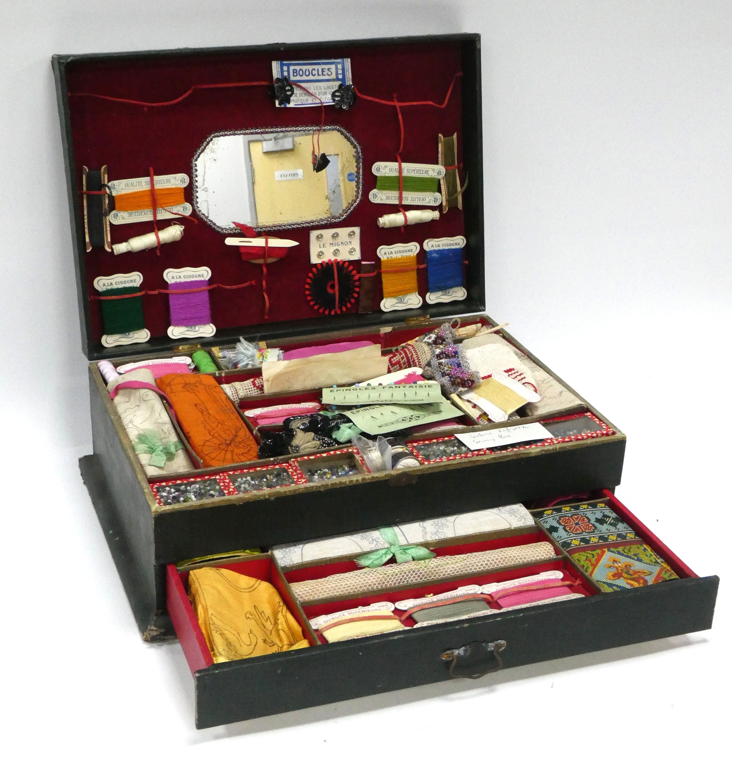 French Needlework Box Circa Early XX Century, housing sequins, beads, pins, etc, 40.5cm wide.