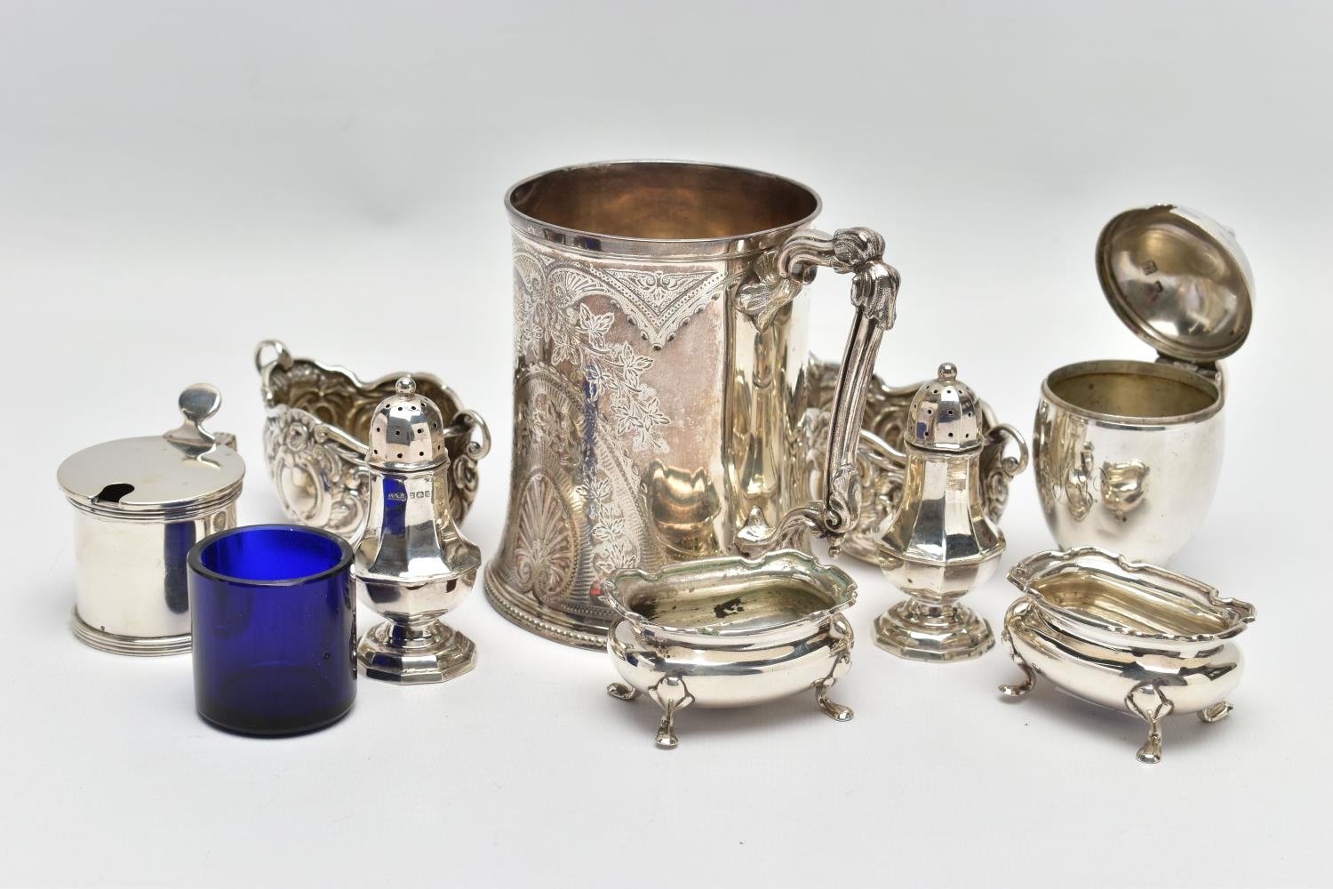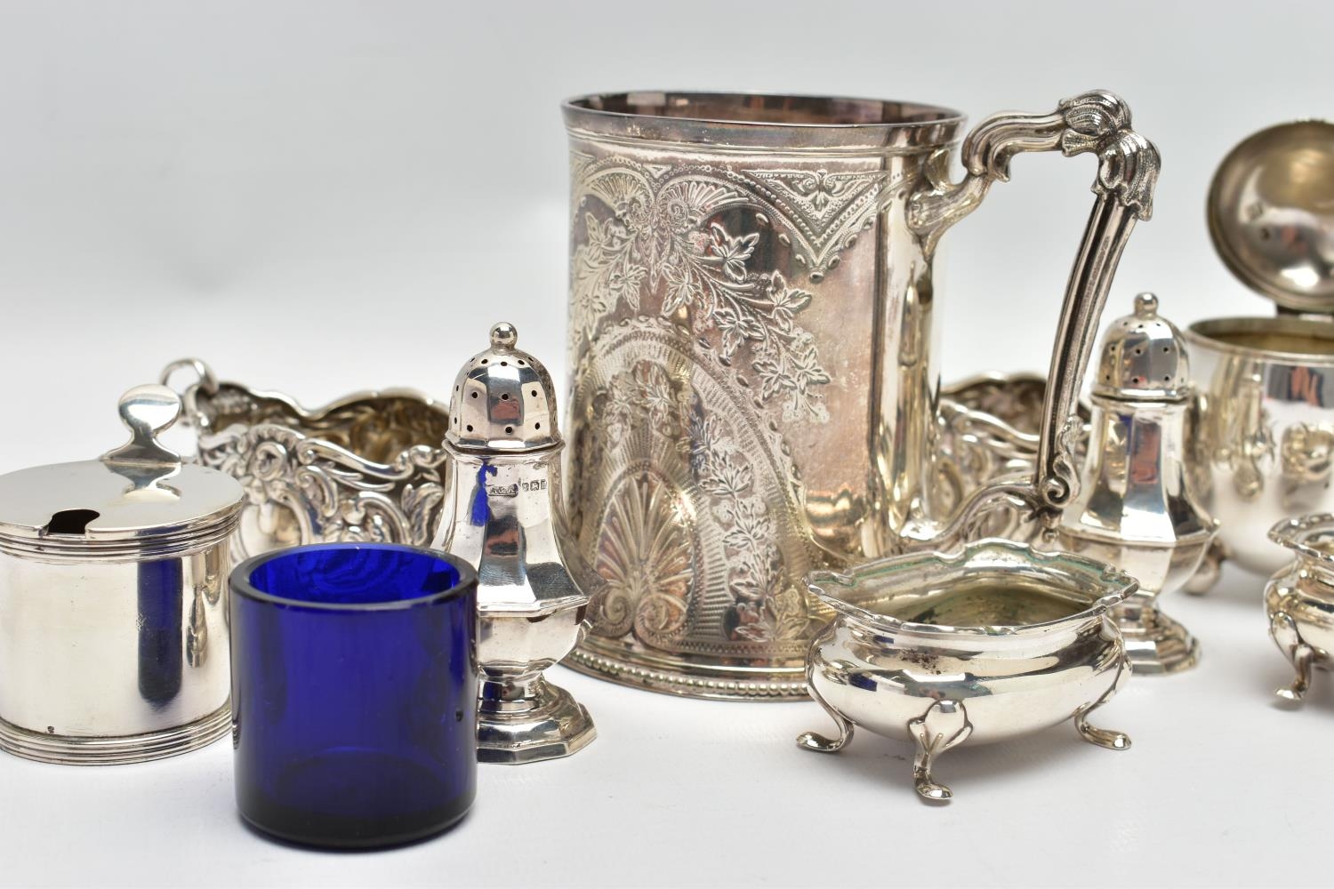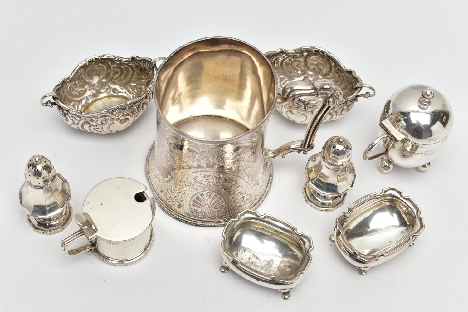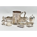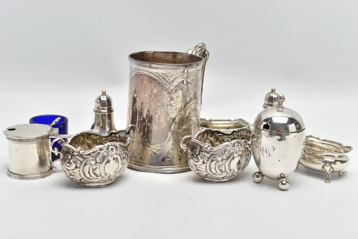 A GROUP OF SILVER, comprising a Victorian silver mug of conical form, cast foliate handle, the body engraved with foliate decoration, vacant cartouche, beaded foot rim, rubbed makers mark, probably Richards & Brown (Edward Charles Brown), London 1878, s.d., 6.71ozt, 208.6 grams, a pair of decagonal baluster pepperettes, a pair of late Victorian twin handled salts, repousse decorated with foliate scrolls and four other cruet items, gross weight of all nine items 15.50ozt, 482.1 grams (9) (Condition report: the mug has a heavily worn gilt interior, a patch of solder near the cartouche, the base is out of shape, the cruet items are generally in fair condition and usable order)