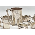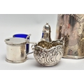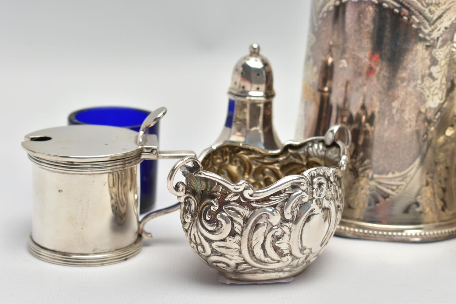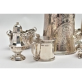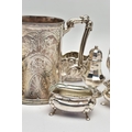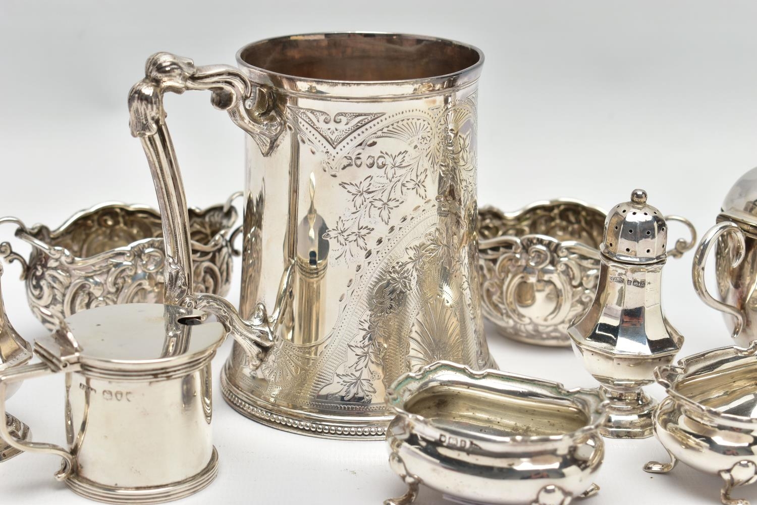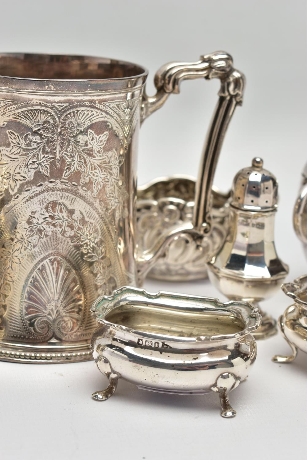 A GROUP OF SILVER, comprising a Victorian silver mug of conical form, cast foliate handle, the body engraved with foliate decoration, vacant cartouche, beaded foot rim, rubbed makers mark, probably Richards & Brown (Edward Charles Brown), London 1878, s.d., 6.71ozt, 208.6 grams, a pair of decagonal baluster pepperettes, a pair of late Victorian twin handled salts, repousse decorated with foliate scrolls and four other cruet items, gross weight of all nine items 15.50ozt, 482.1 grams (9) (Condition report: the mug has a heavily worn gilt interior, a patch of solder near the cartouche, the base is out of shape, the cruet items are generally in fair condition and usable order)