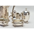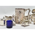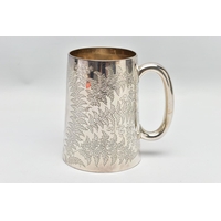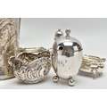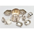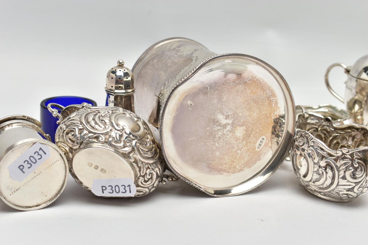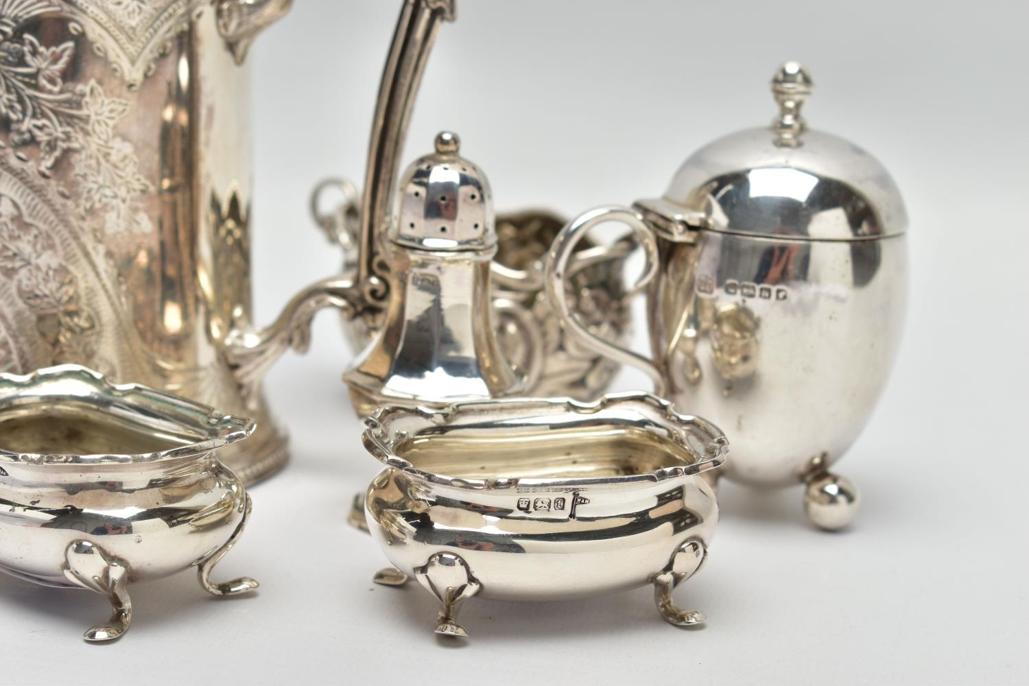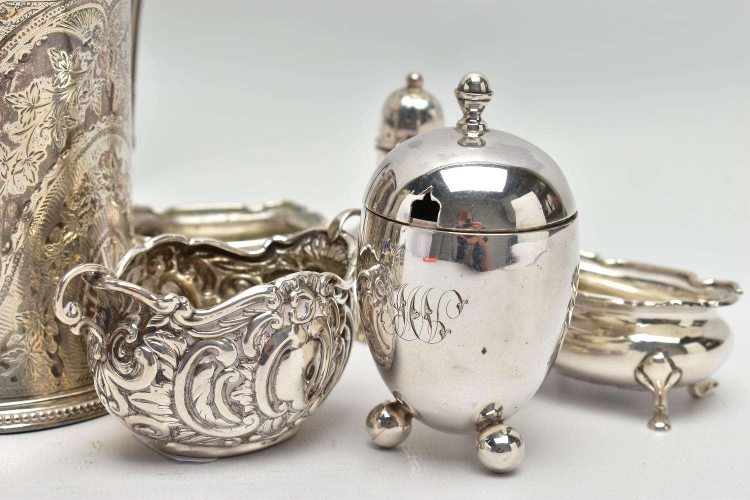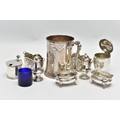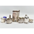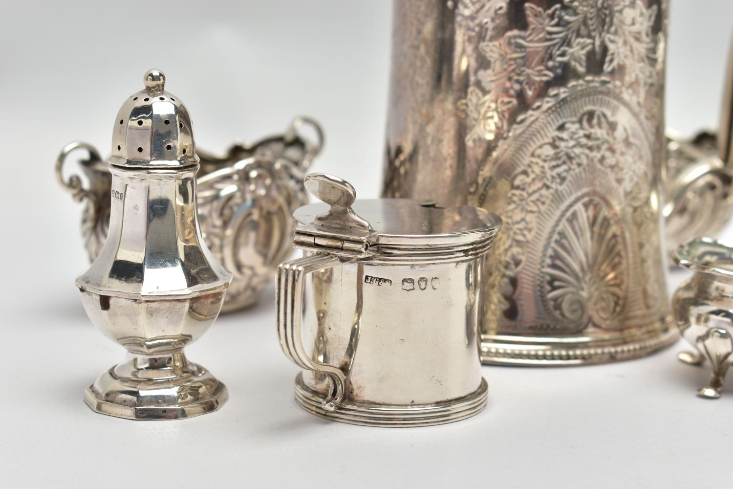 A GROUP OF SILVER, comprising a Victorian silver mug of conical form, cast foliate handle, the body engraved with foliate decoration, vacant cartouche, beaded foot rim, rubbed makers mark, probably Richards & Brown (Edward Charles Brown), London 1878, s.d., 6.71ozt, 208.6 grams, a pair of decagonal baluster pepperettes, a pair of late Victorian twin handled salts, repousse decorated with foliate scrolls and four other cruet items, gross weight of all nine items 15.50ozt, 482.1 grams (9) (Condition report: the mug has a heavily worn gilt interior, a patch of solder near the cartouche, the base is out of shape, the cruet items are generally in fair condition and usable order)