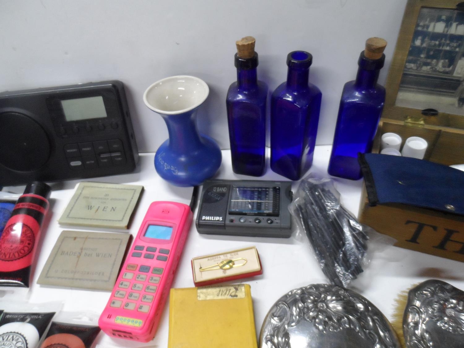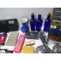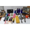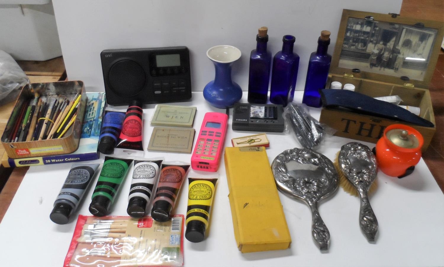 Collection of misc items to include paint and brushes, blue bottles etc (Qty)