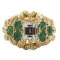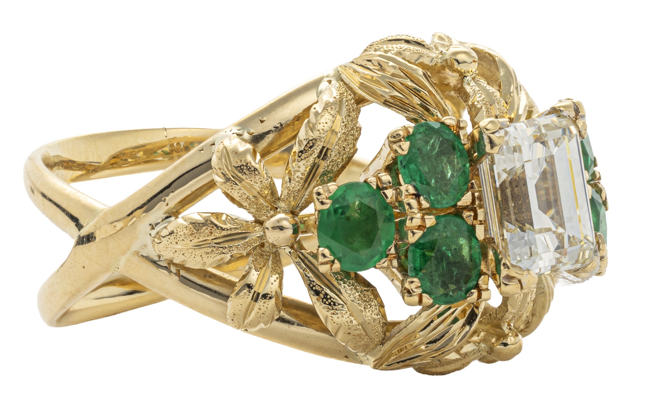 The ring claw set to the centre with an emerald cut diamond, 1.680 carats, colour L, clarity VVS2, accompanied by a DIA certificate number 25100129 flanked to the sides with 6 round brilliant cut emeralds weighing 0.70 carats, in 18ct yellow gold, with a pair of daisy style earrings, claw set to the centre with a pair of oval brilliant cut emeralds weighing 1.20 carats embellished by 0.35 carats of claw set round brilliant cut diamonds, colour H, clarity VS, in 18ct yellow gold, 7,7g all in