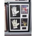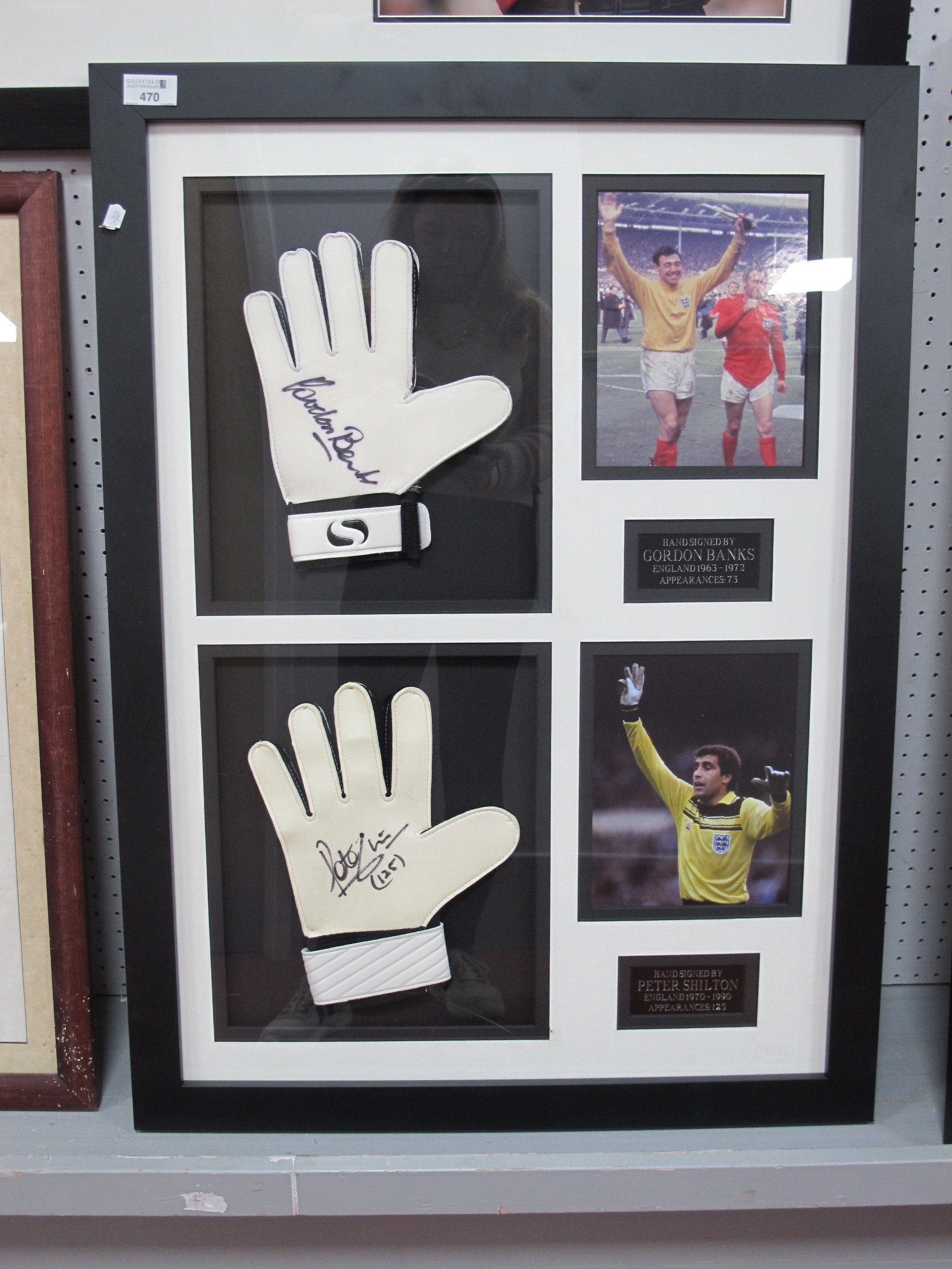 Gordon Banks & Peter Shilton Autographs, each black pen signed (unverified) on a glove, with images as a framed montage, Wonderland certificate of authenticity to back, overall 82 x 59.5cm [460754]