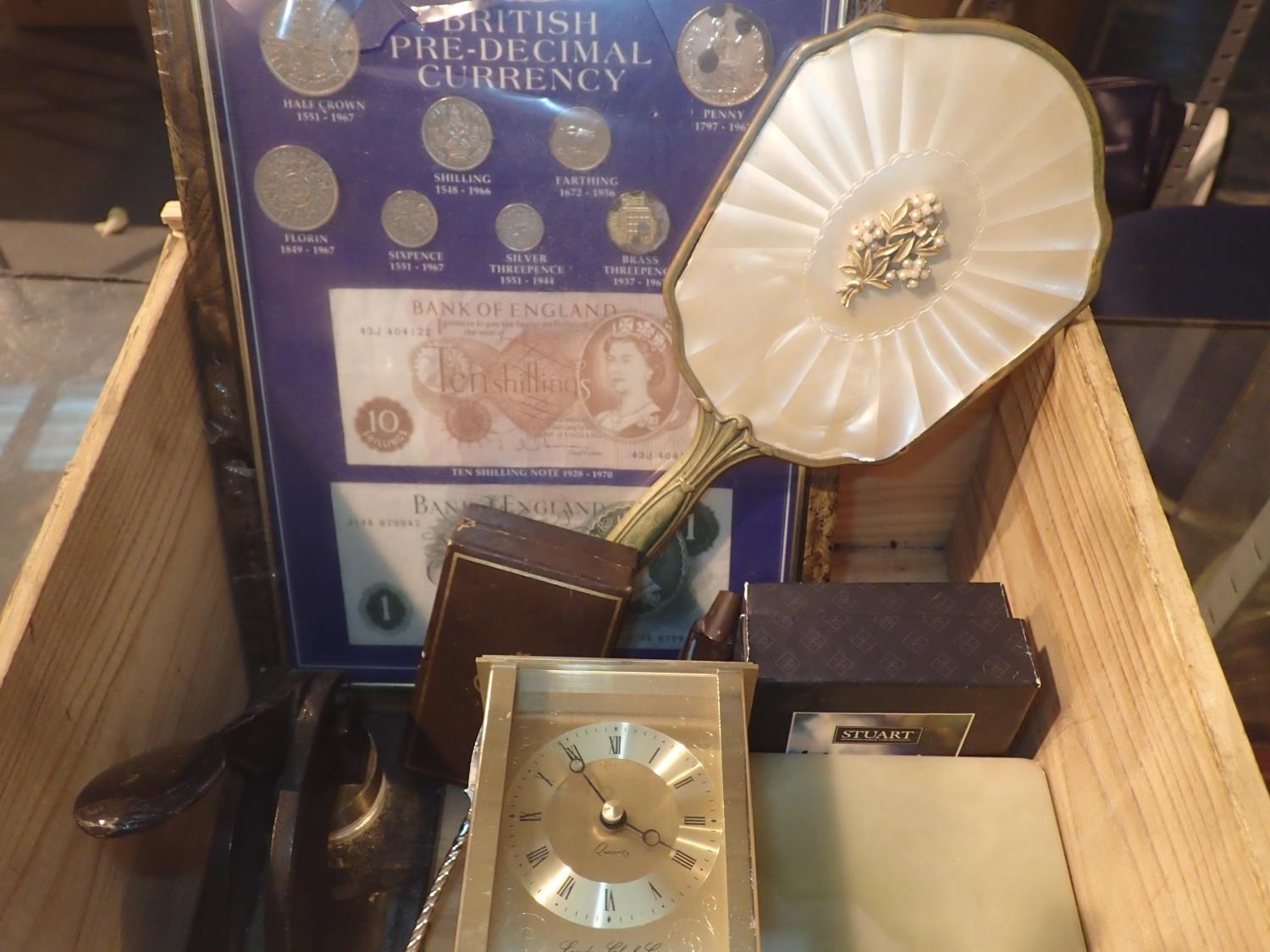 Collectables to include a framed pre decimal currency display, boxed Colibri lighter, paper embossing stamp etc. P&P Group 3 (£25+VAT for the first lot and £5+VAT for subsequent lots)