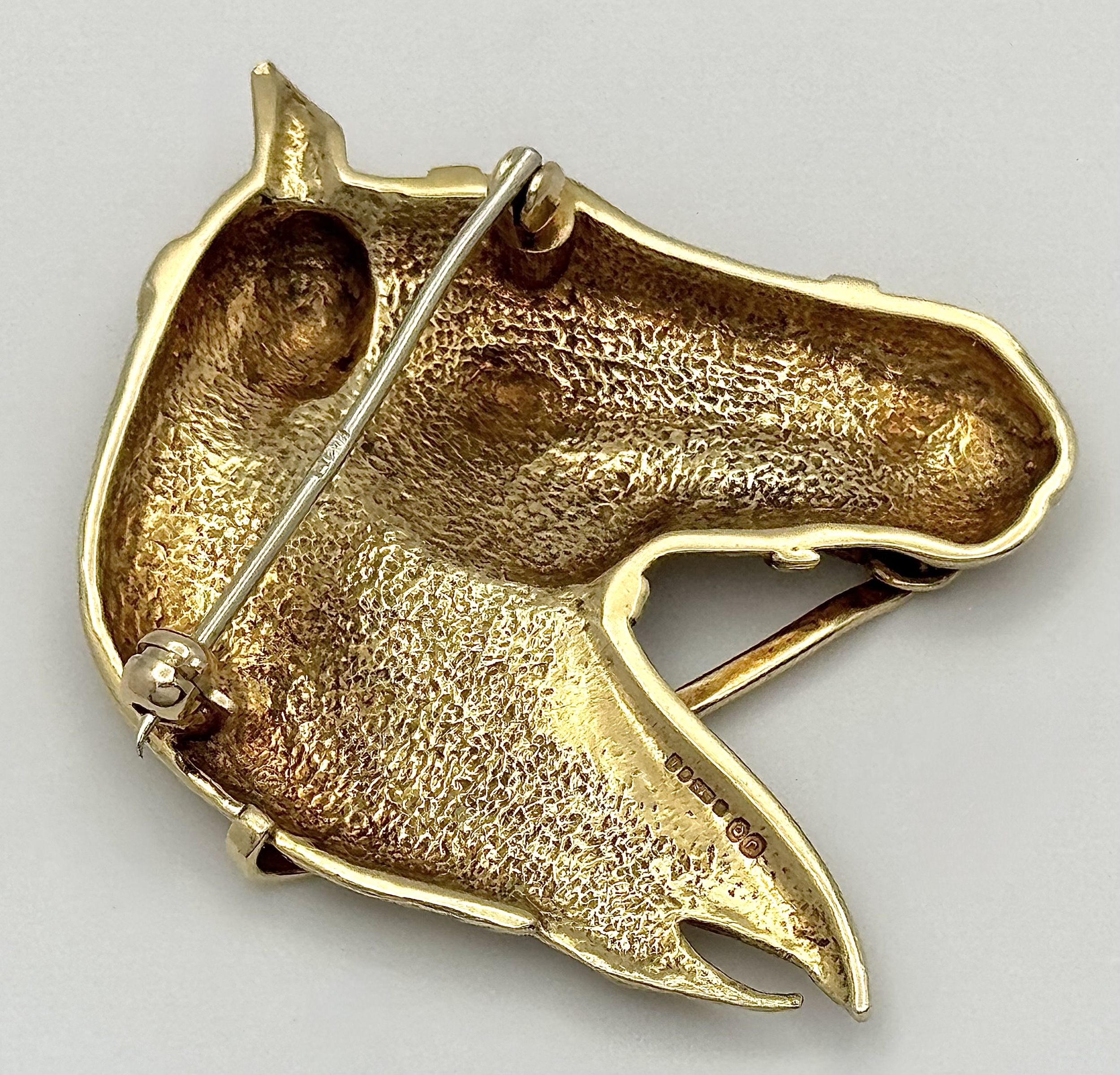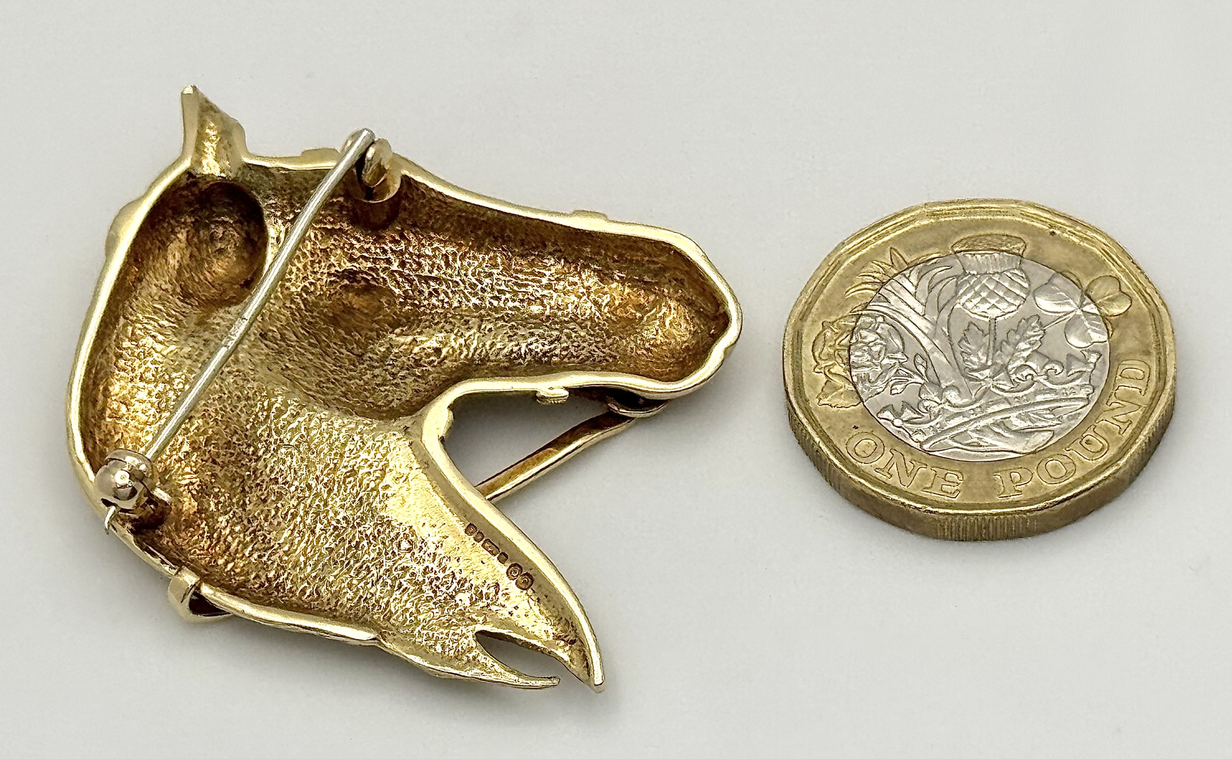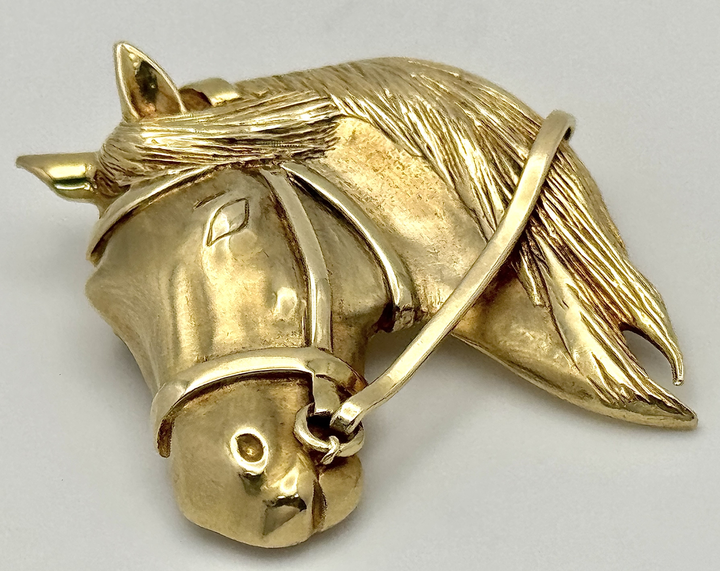 A 9K Yellow Gold Thoroughbred Horse Head Brooch. 4 x 5cm. 13g.