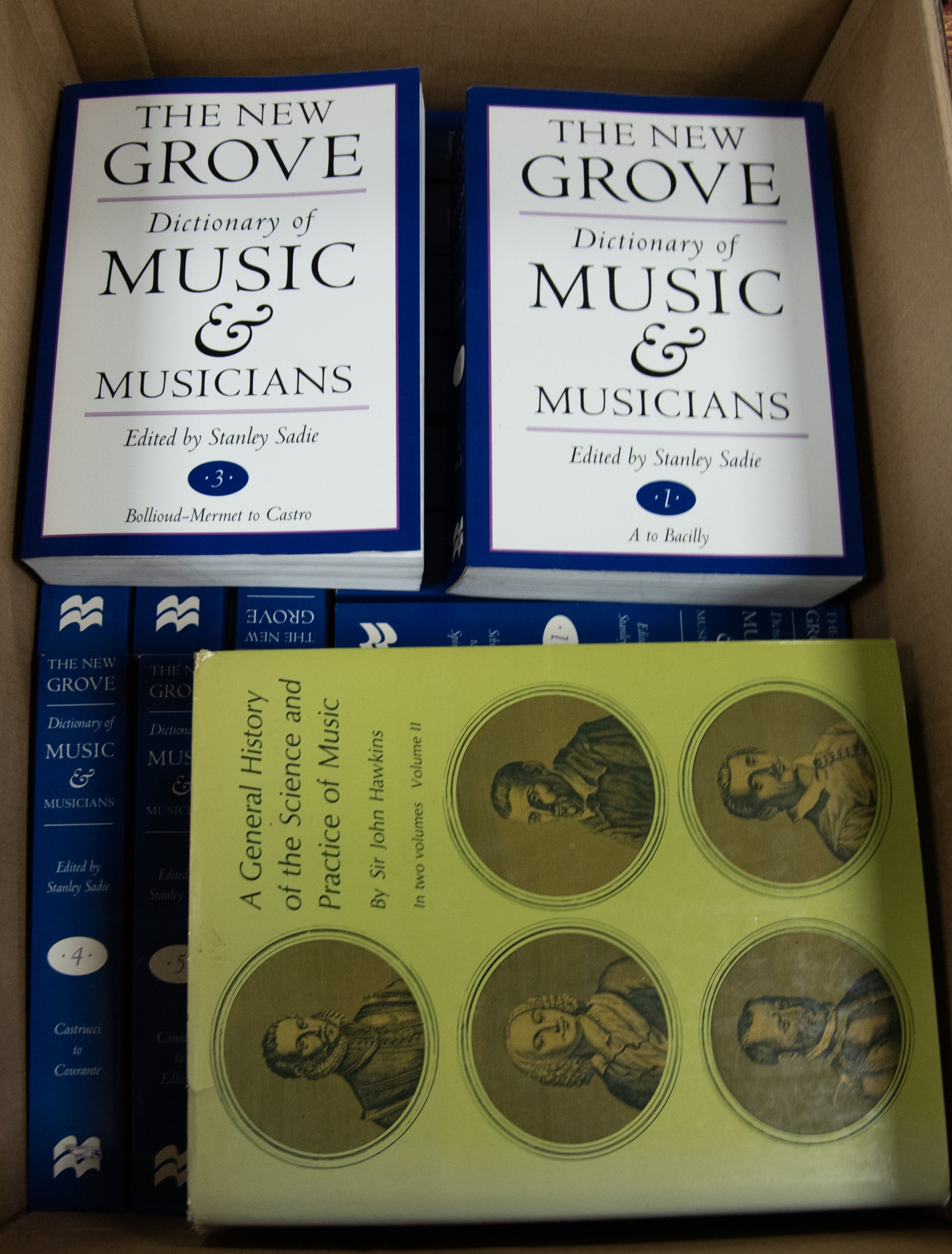 Sir John Hawkins - A General History of the Science and Practise of Music, 2 vol, pub Dover, 1963 facsimile of the J ALFRED NOVELLO edition 1853. Together with Stanley Sadie- The New Grove Dictionary of Music and Musicians, in 20 vol, pub GROVE, 1980, pb