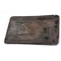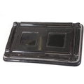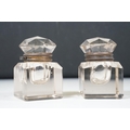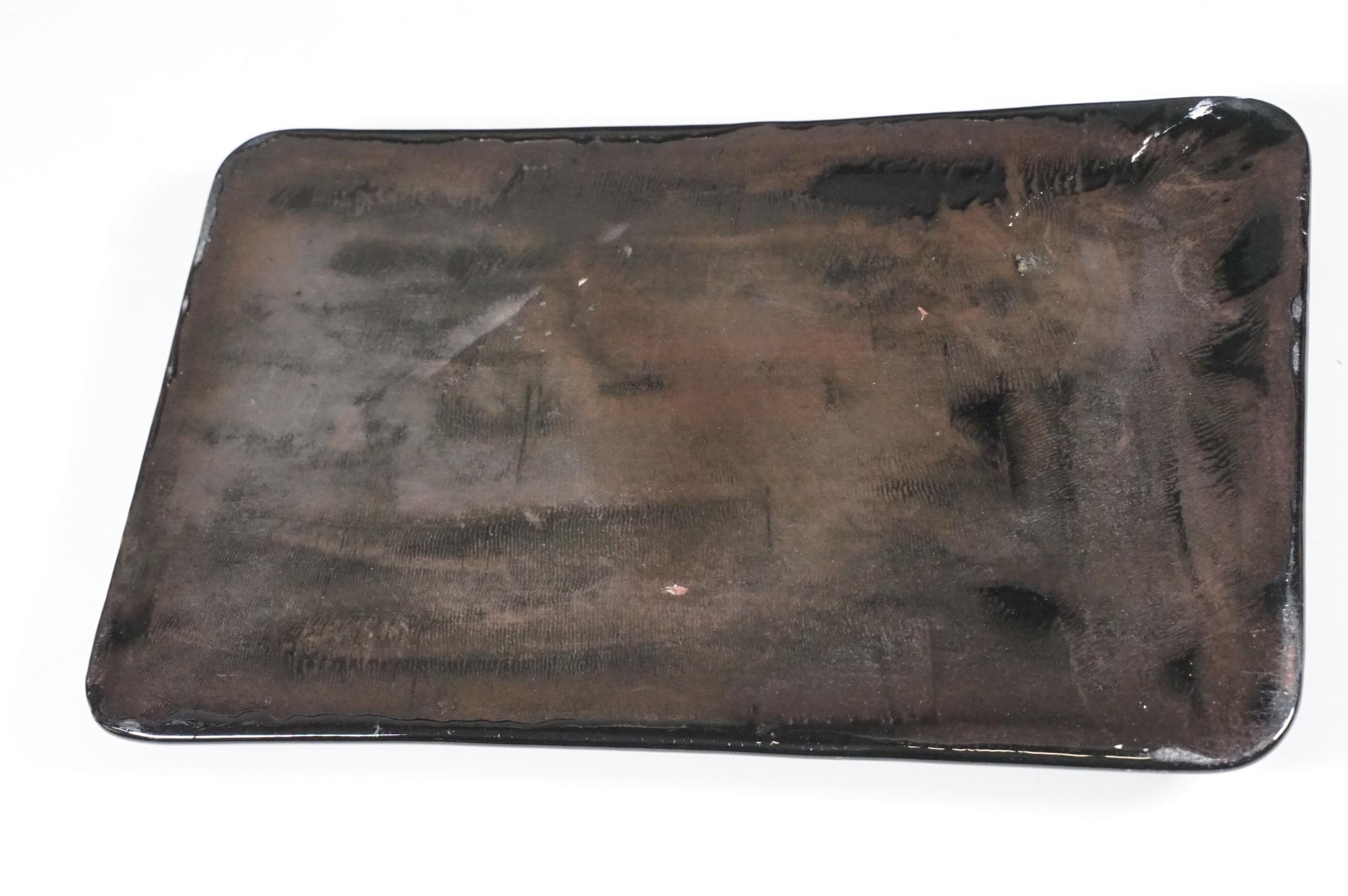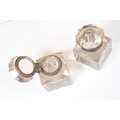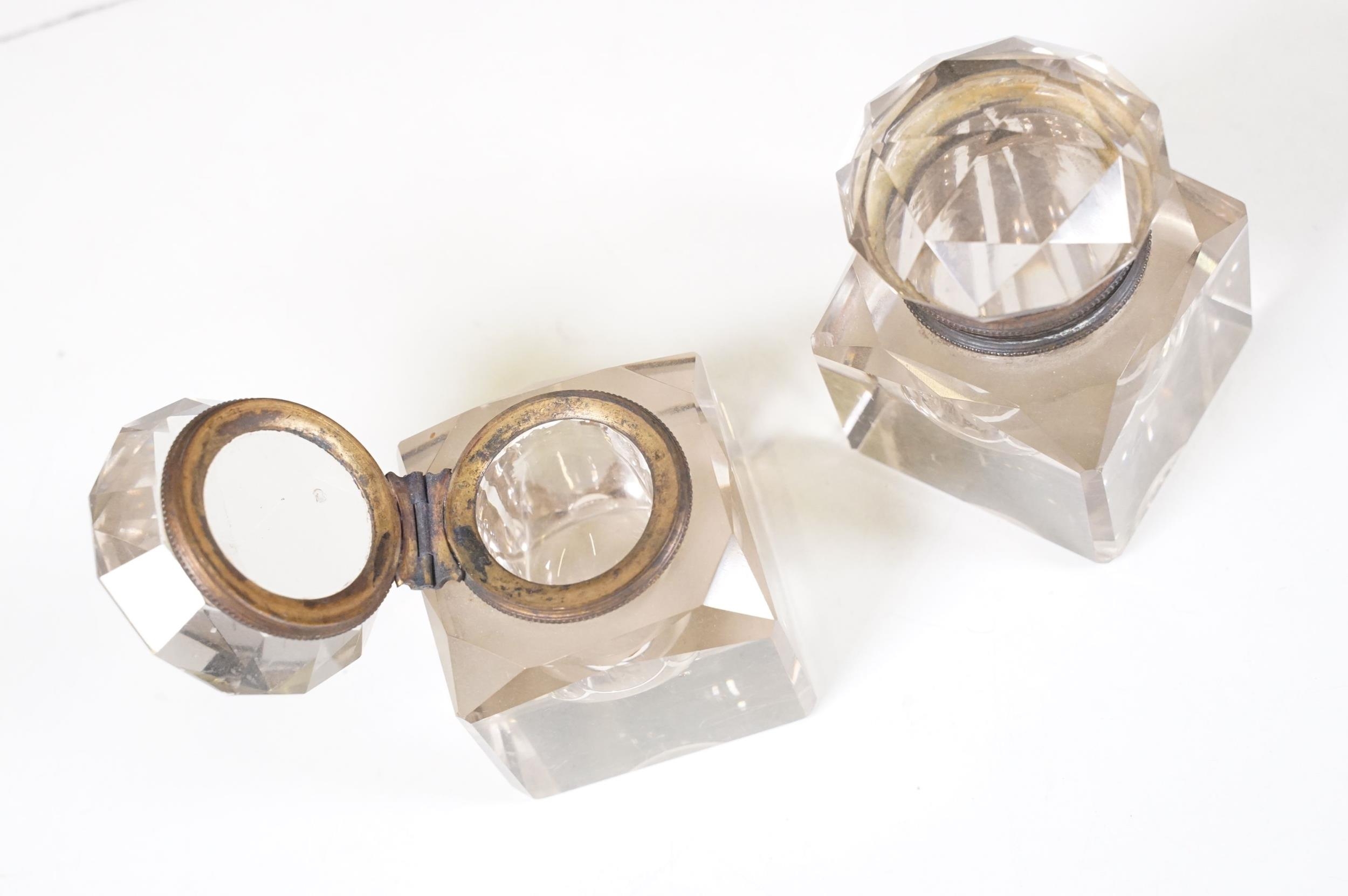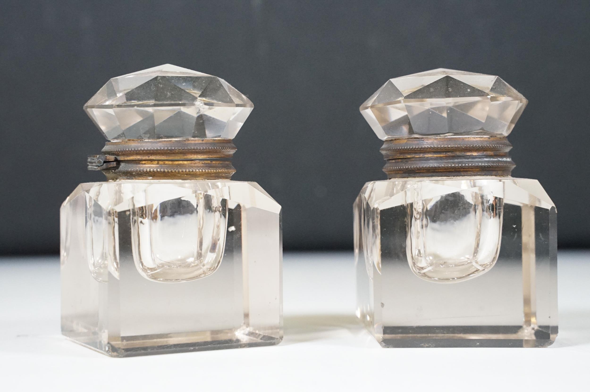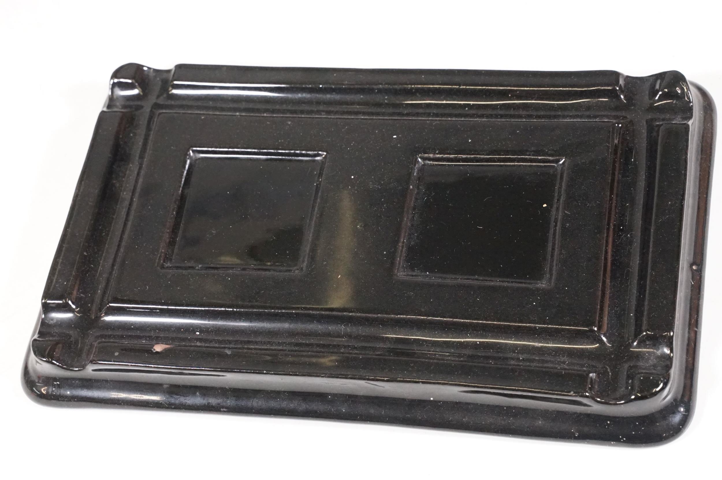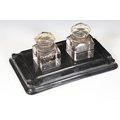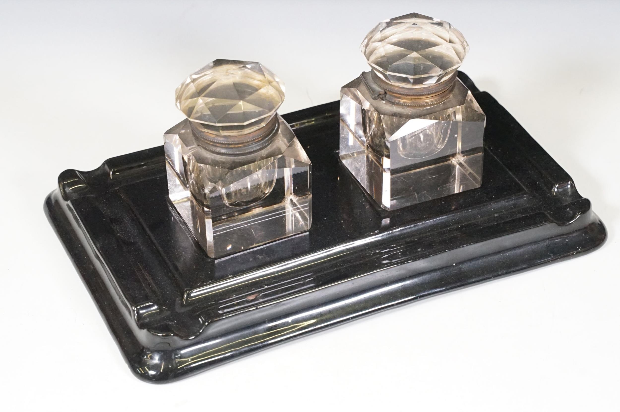 Victorian desk stand comprising two square glass inkwells with hinged faceted lids held on a black glazed ceramic base with pen recessed, 28cm long