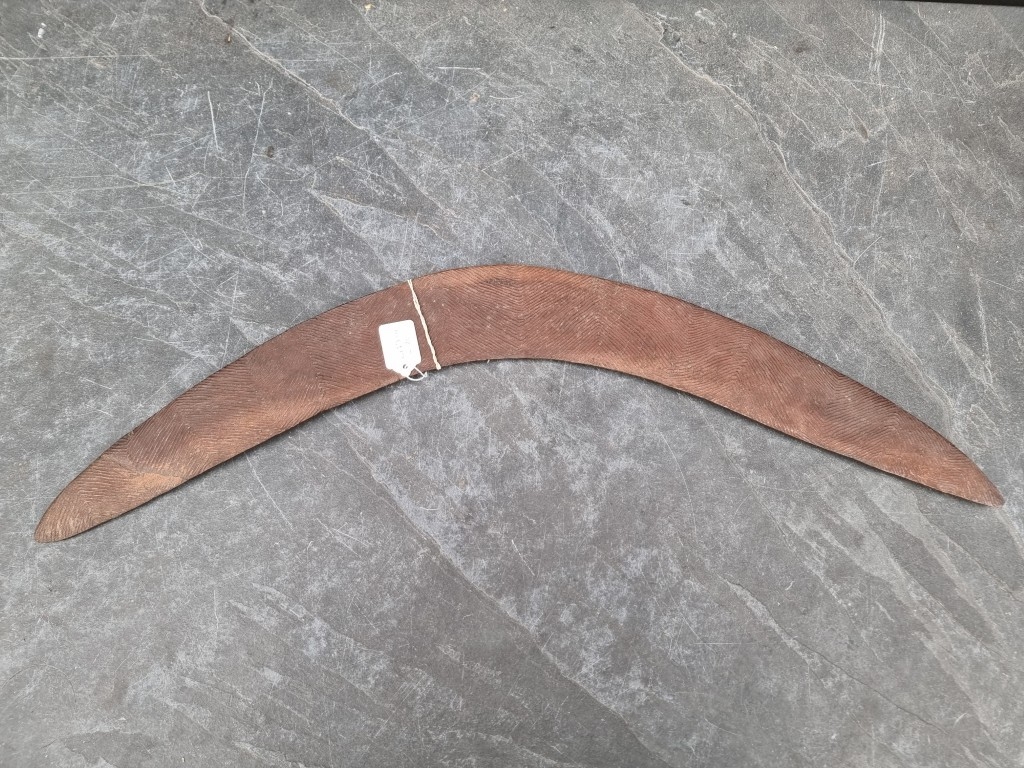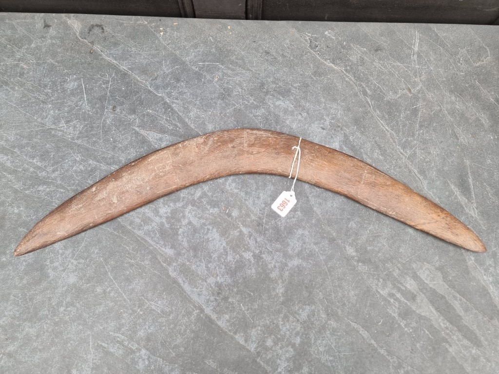 Ethnographica: a 19th century Australian Aboriginal hardwood boomerang, the upper convex side with faint carved decoration, the underside with repeat design, 72.5cm long.