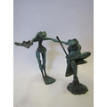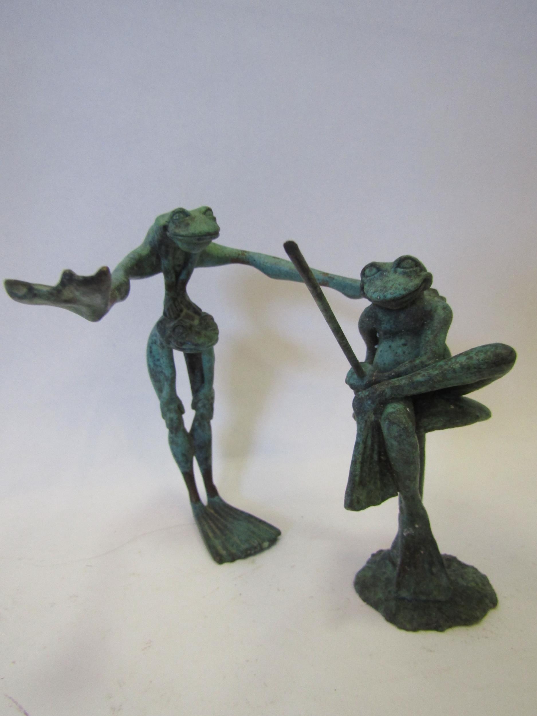 Two verdigris bronze frog figures by David Meredith, frog fishing and leapfrogging, 11cm and 14cm tall