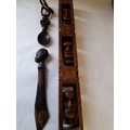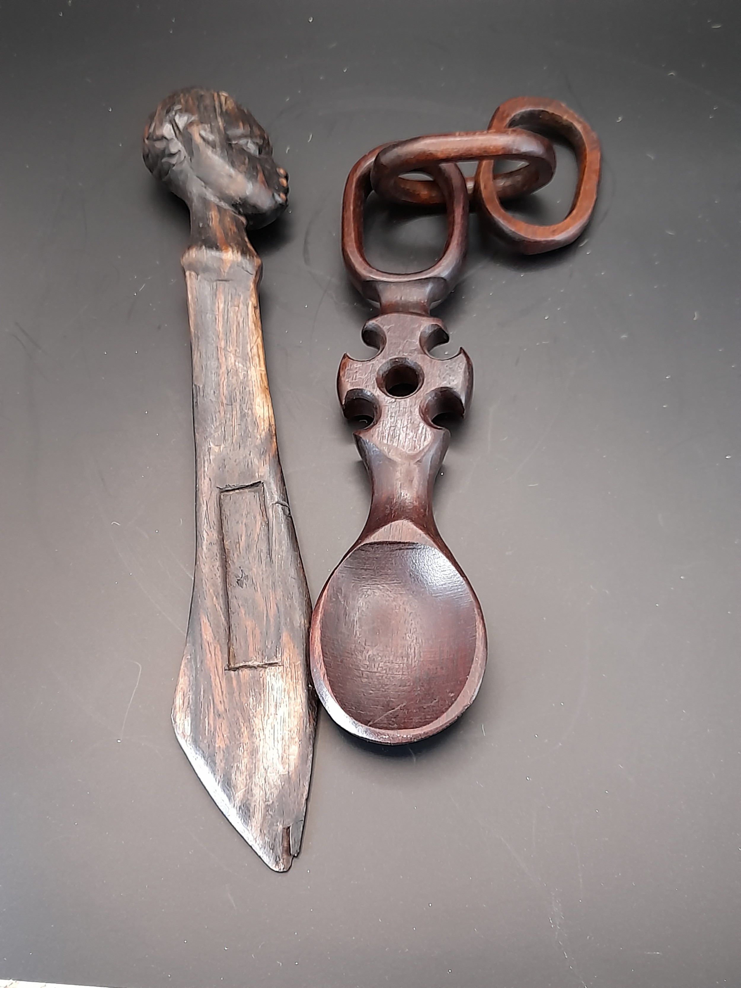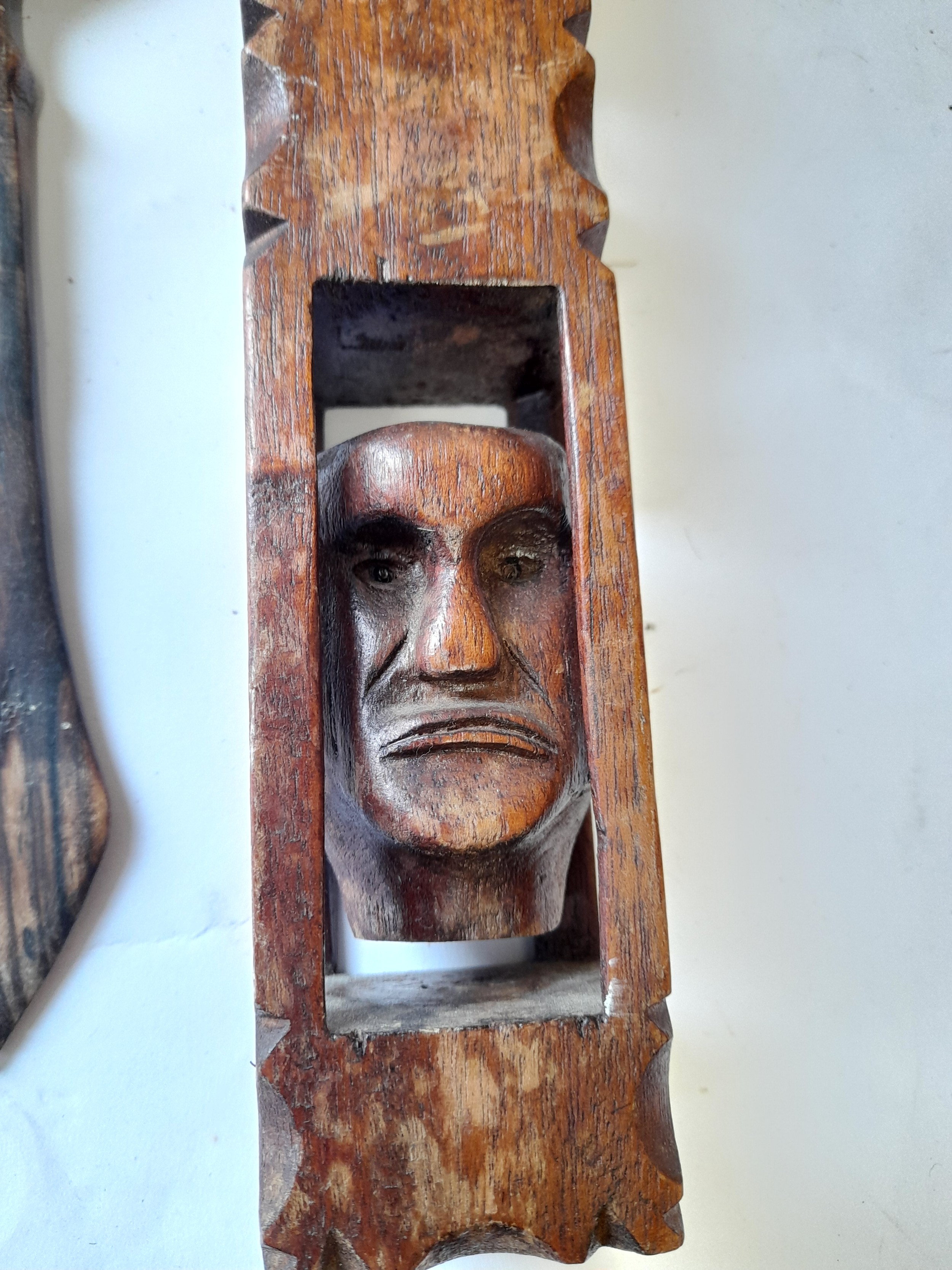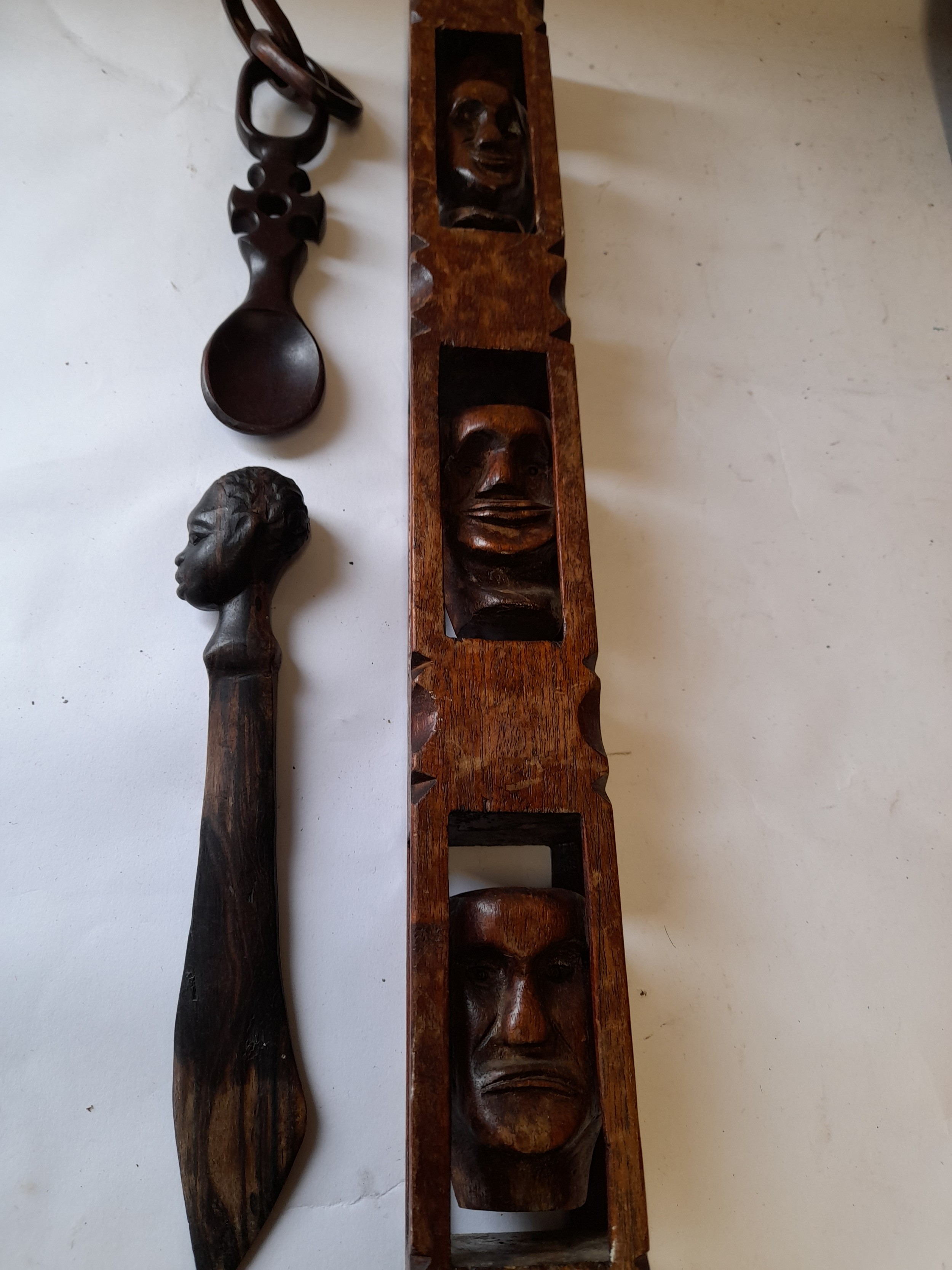 3 x Treen items to include long 3 x carved wood heads in cage from one piece of wood 47cm long along with a Spoon with carved linkd and letter opener with native head