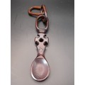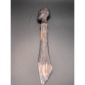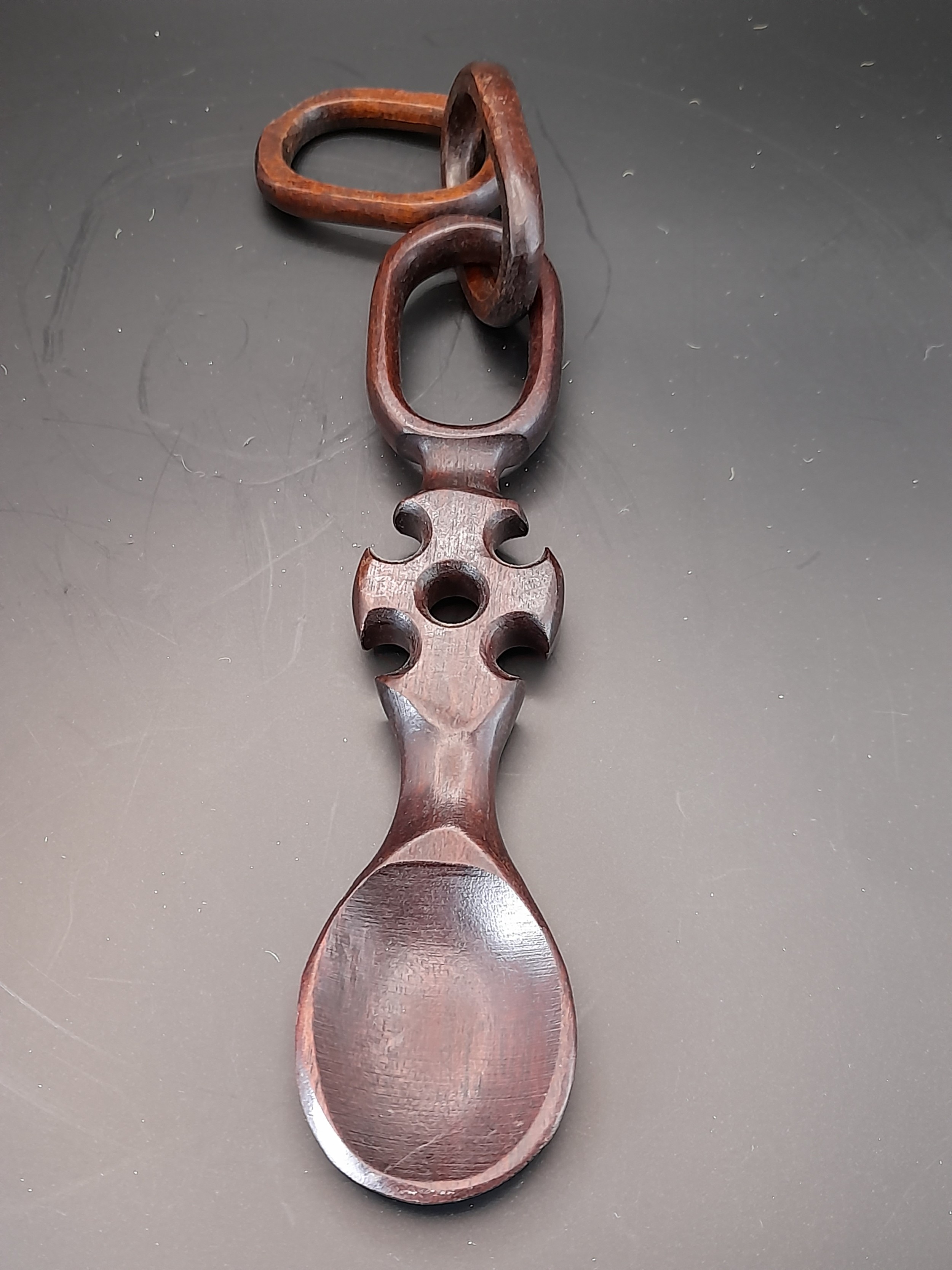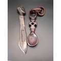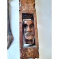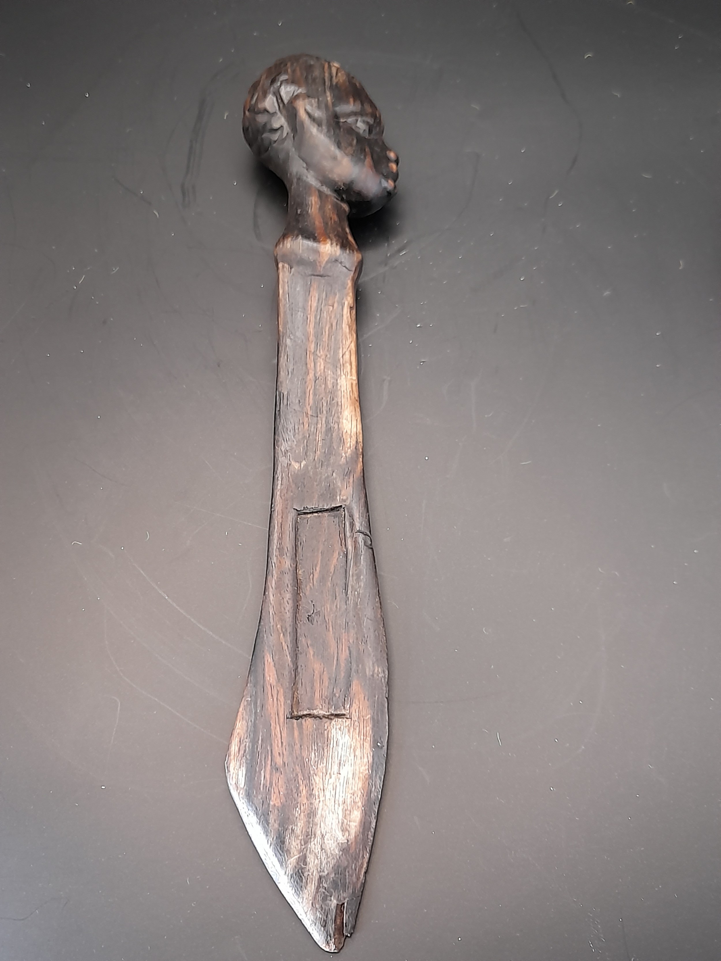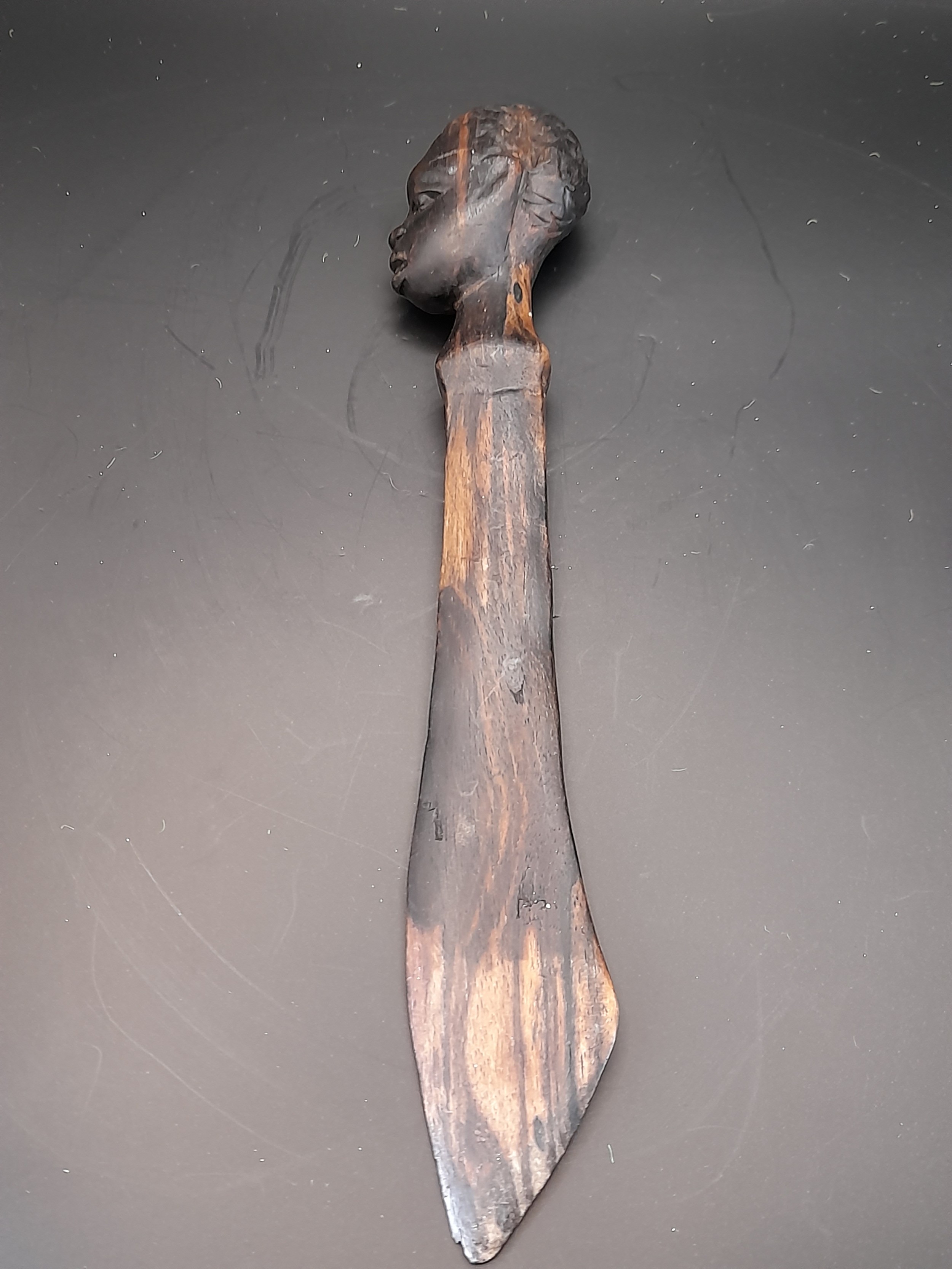 3 x Treen items to include long 3 x carved wood heads in cage from one piece of wood 47cm long along with a Spoon with carved linkd and letter opener with native head