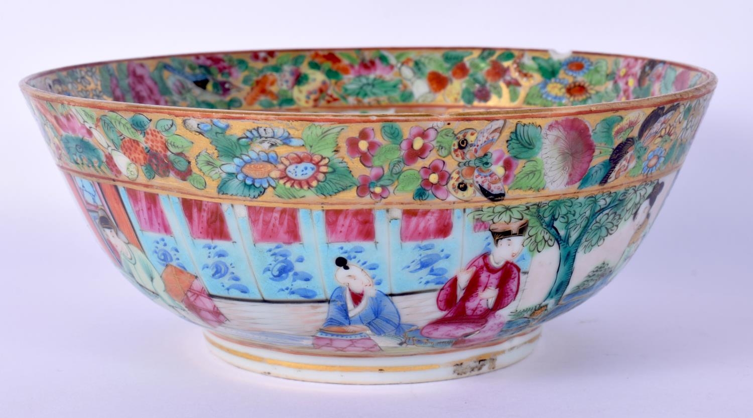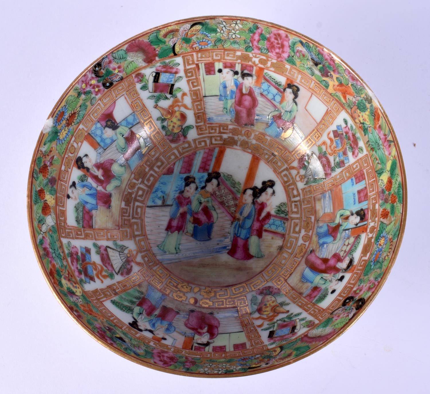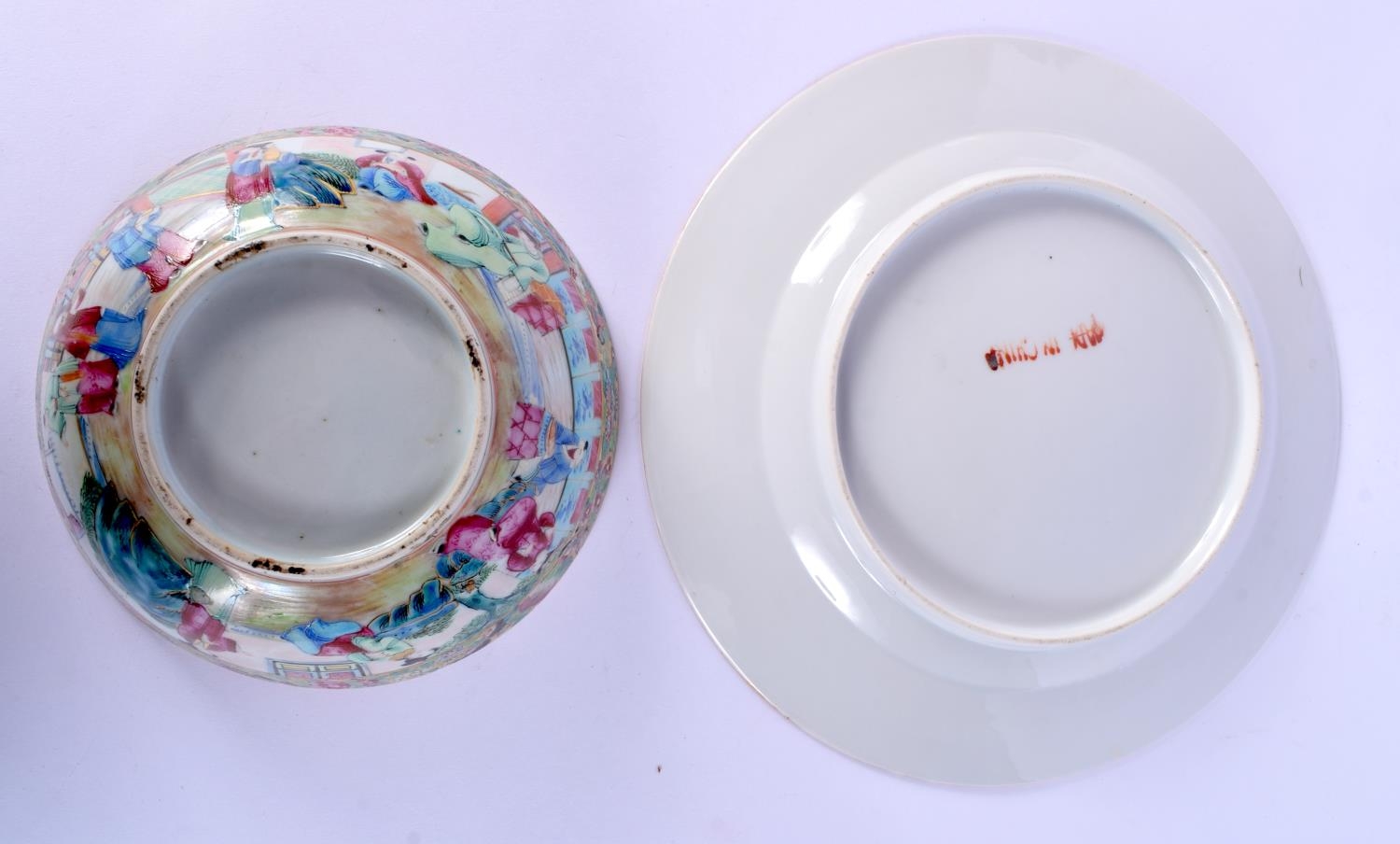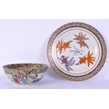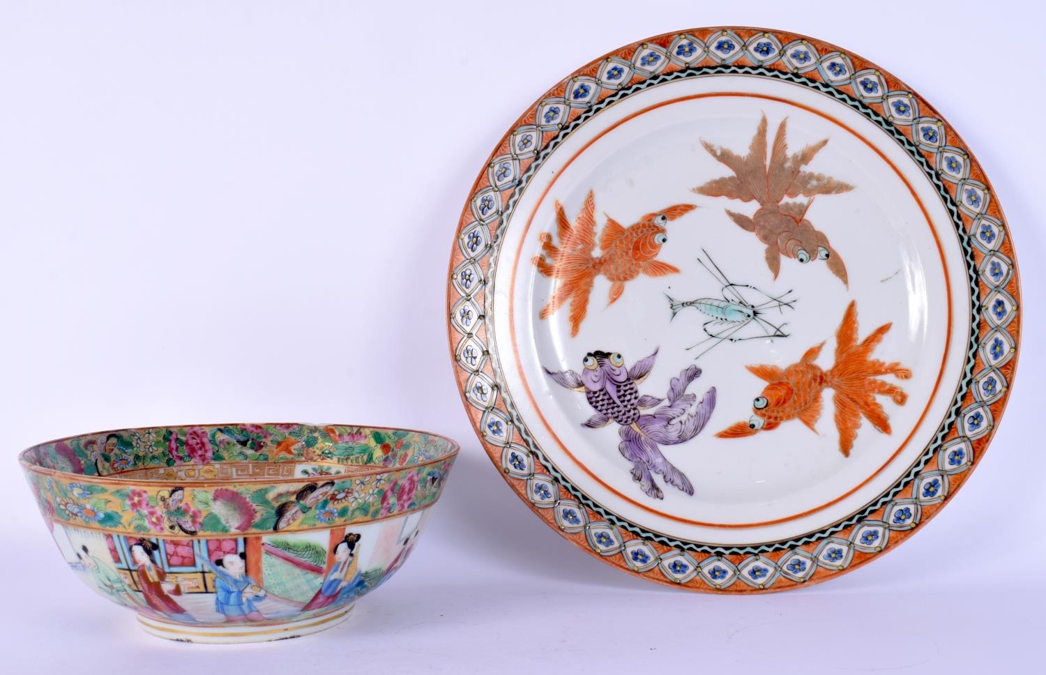 A 19TH CENTURY CHINESE CANTON FAMILLE ROSE BOWL together with a fish plate. Largest 23 cm diameter. (2)
