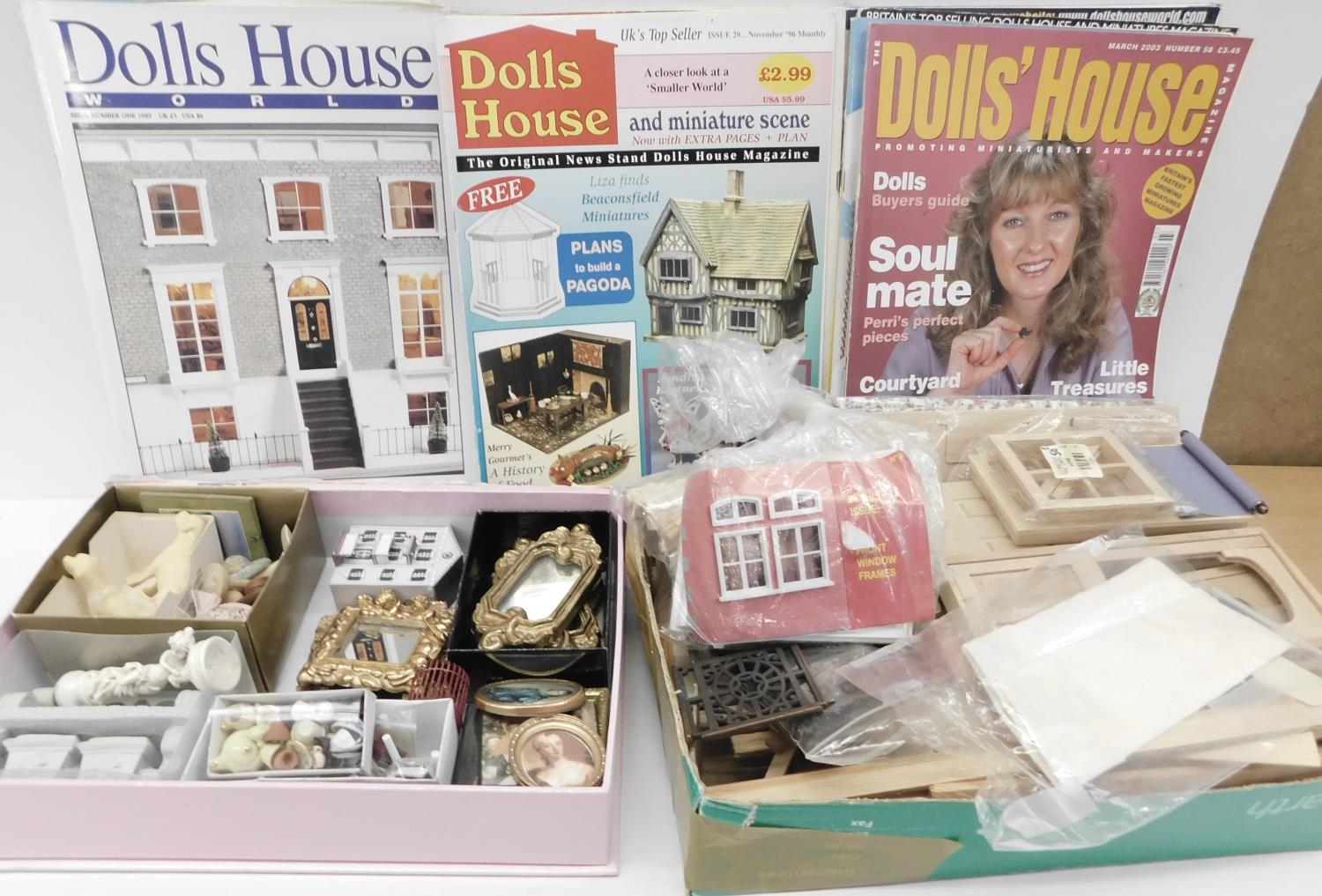 Large collection of dolls house furniture + dolls house world magazines