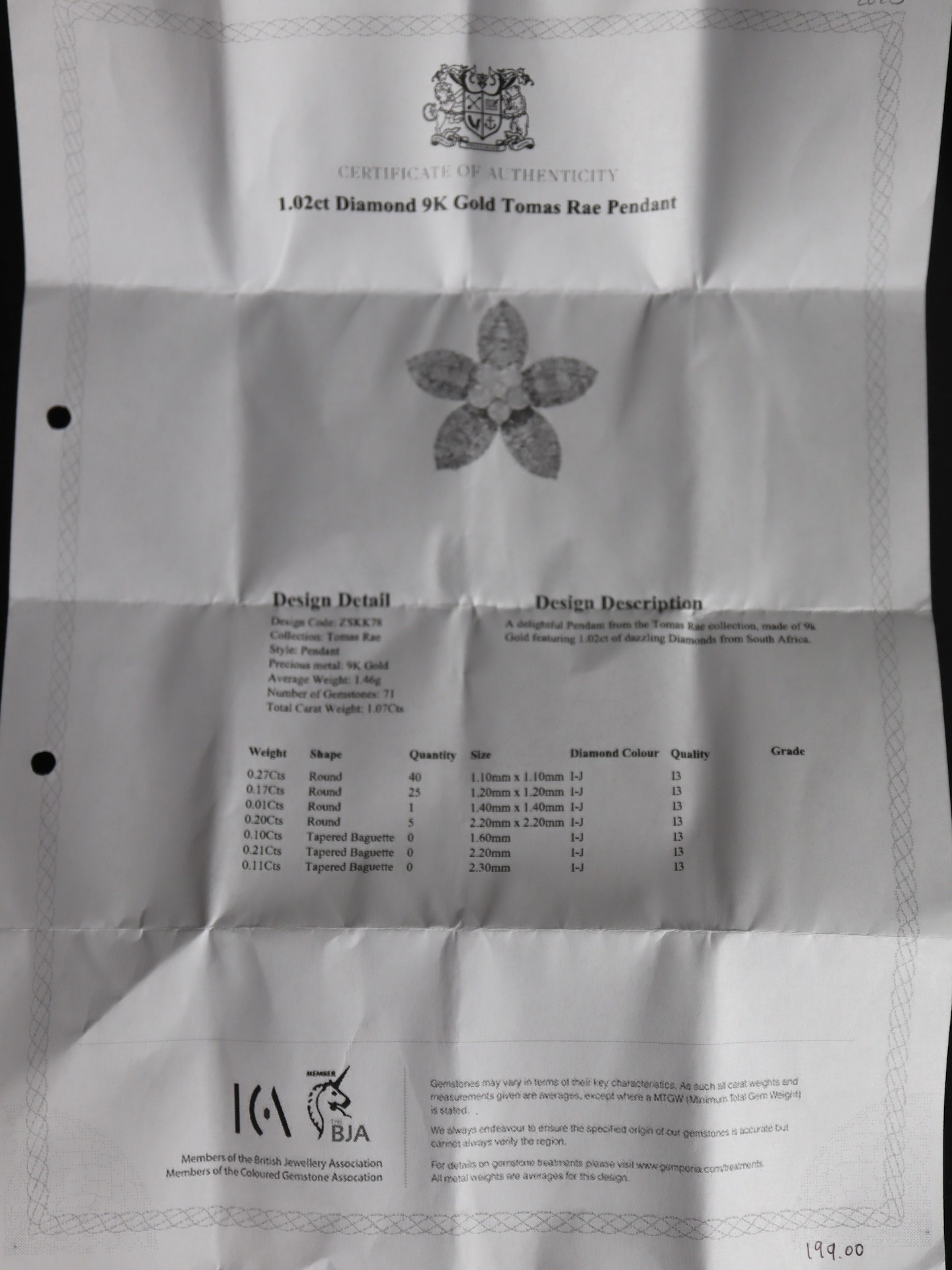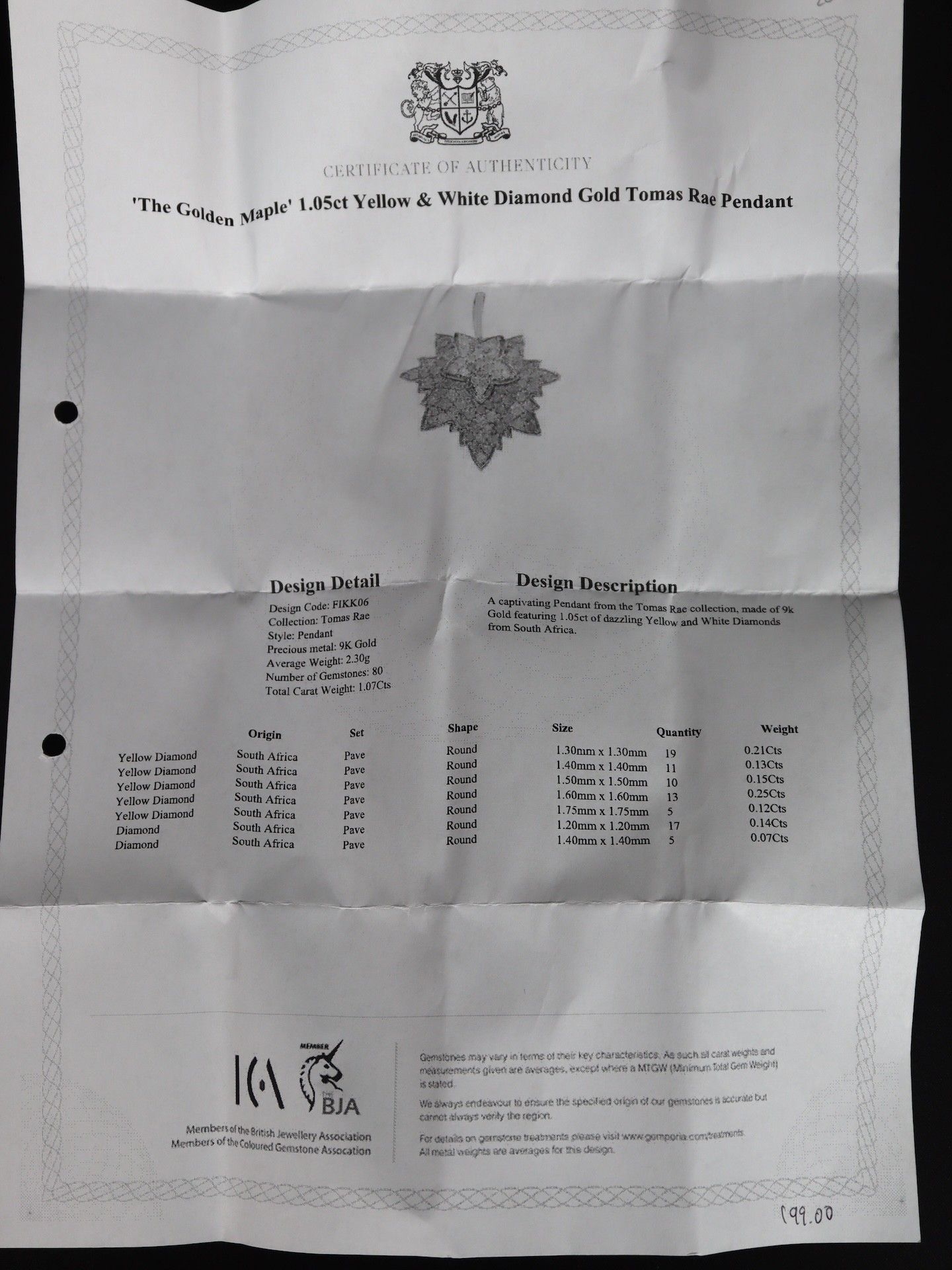 1.02ct Diamond 9K Gold Tomas Rae Pendant + 'The Golden Maple' 1.05ct Yellow & White Diamond 9K Gold Tomas Rae Pendant with COA - 4.2g