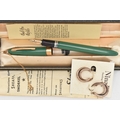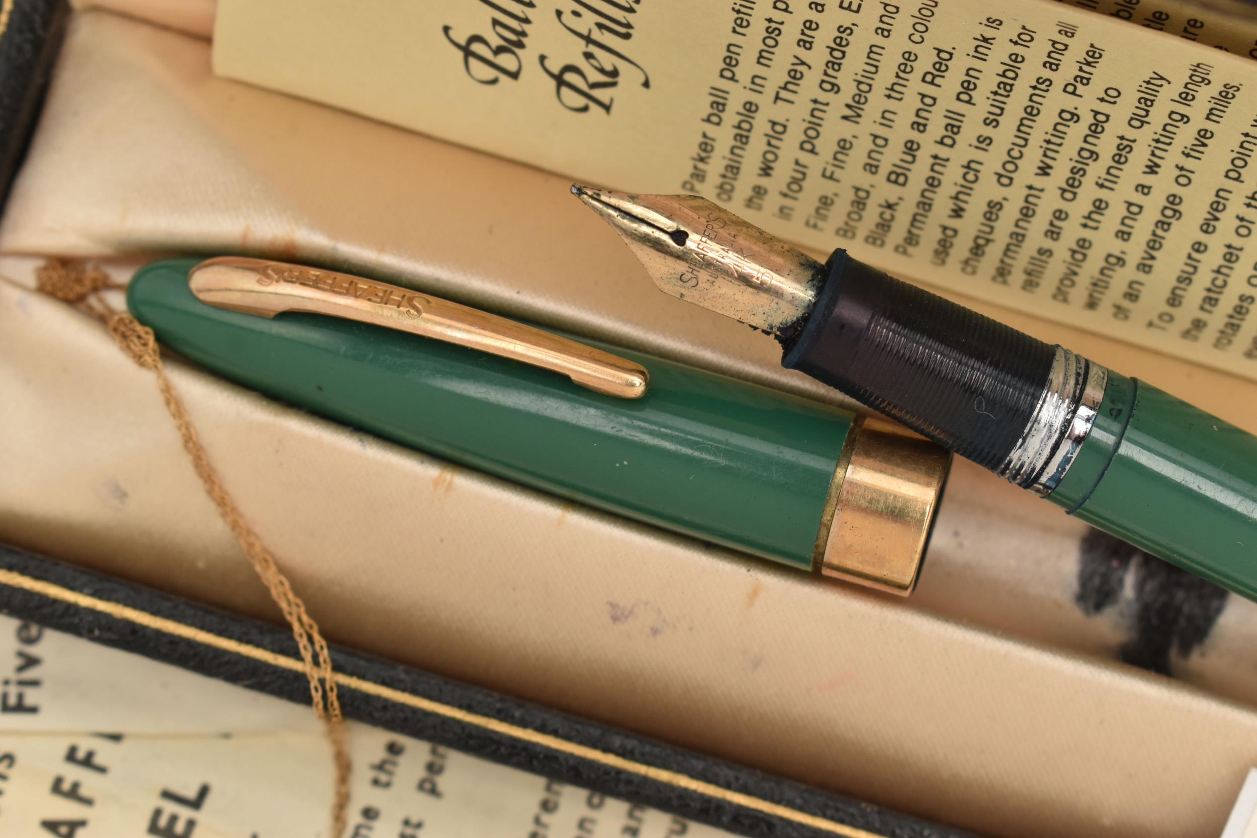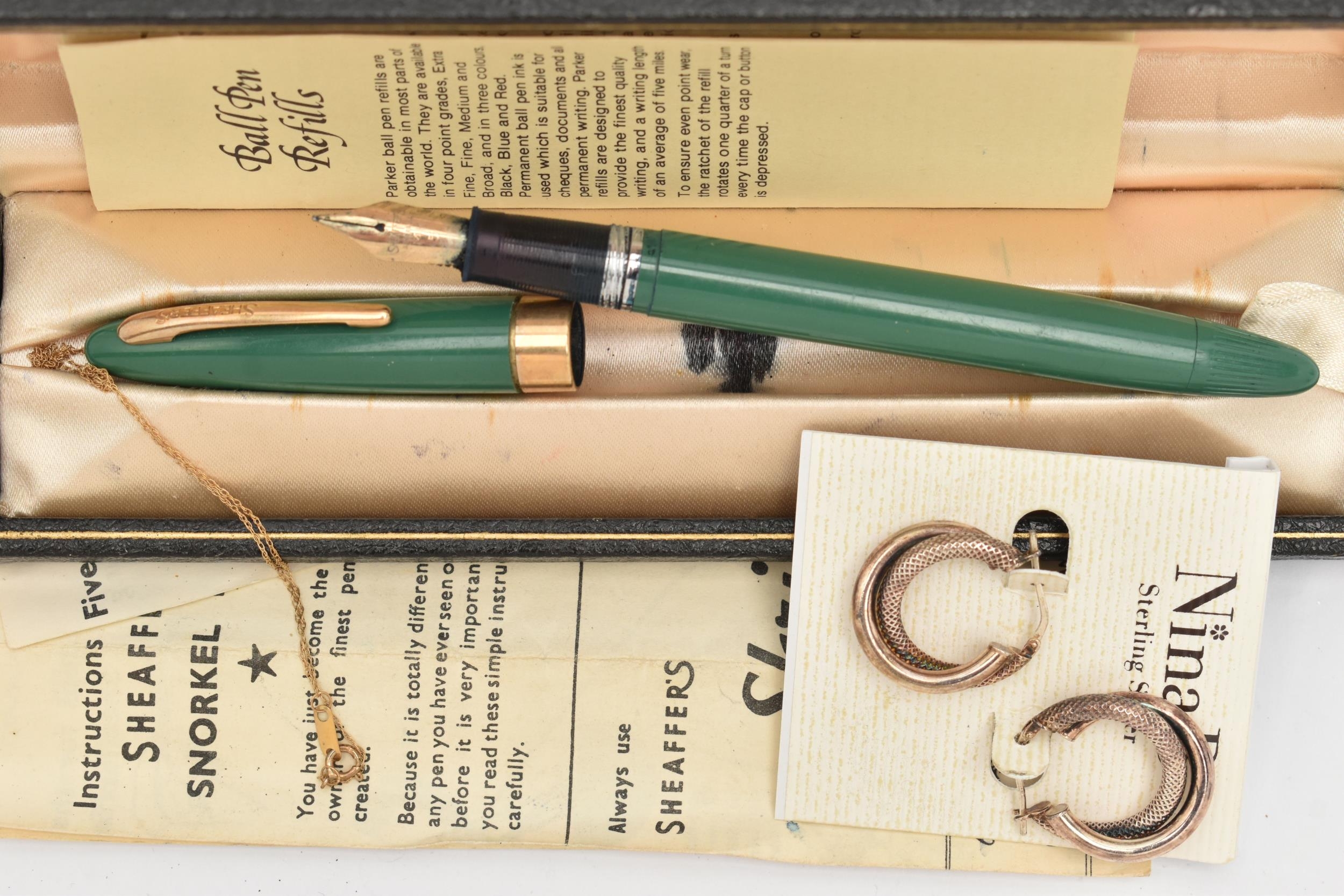 A SMALL ASSORTMENT OF ITEMS, to include a 'Sheaffer' fountain pen, nib stamped 14k, together with signed box, a fine yellow metal trace chain, stamped 9k, approximate gross weight 0.3 grams, and a pair of white metal hoop earrings, stamped 925, approximate gross weight 4.4 grams, (condition report: pen lid is broken, chain is knotted)