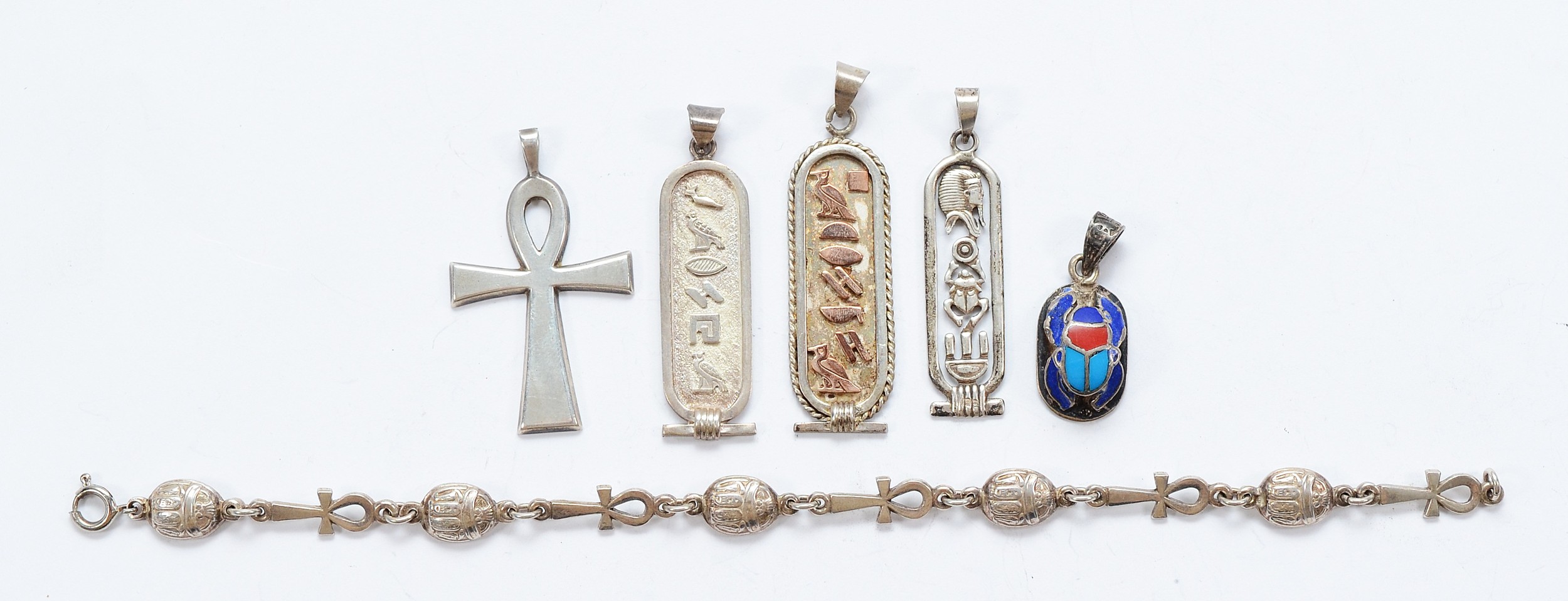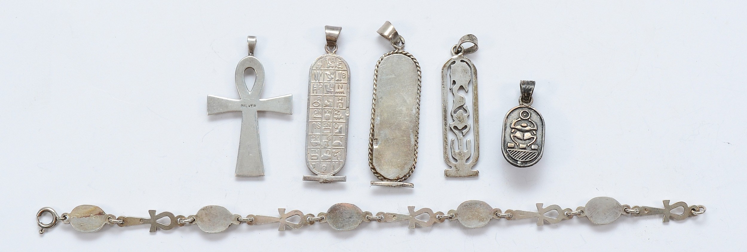 Four Egyptian silver pendants, an Egyptian silver bracelet and a silver pendant, 40g
