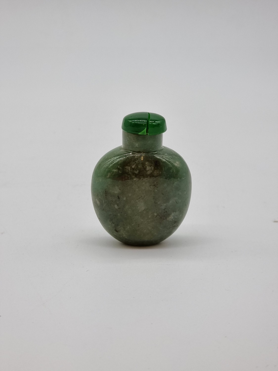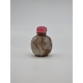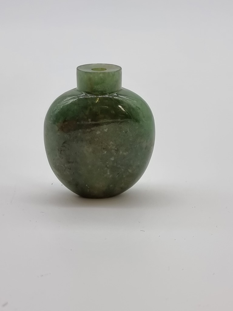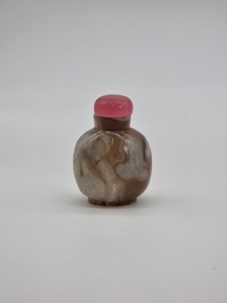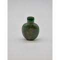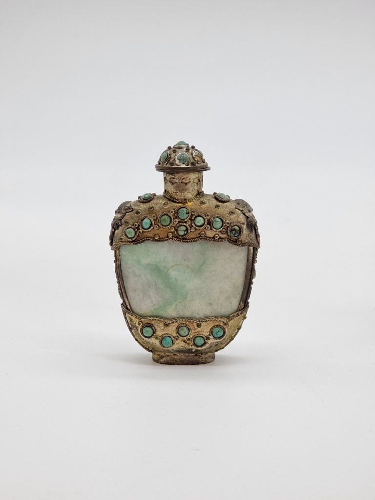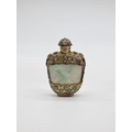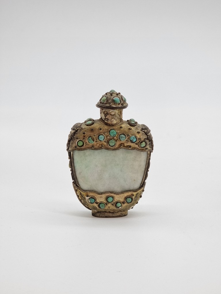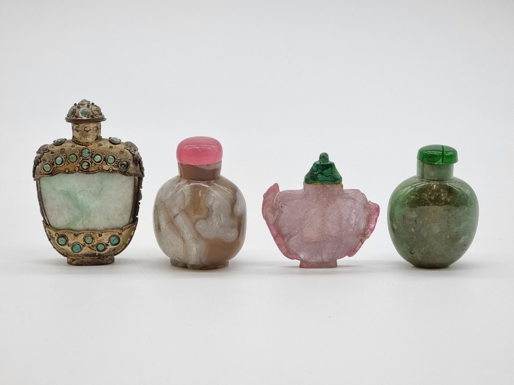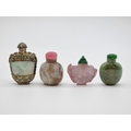 Four Chinese snuff bottles and stoppers, comprising: an agate example, (polished flaw), 5.3cm high, with pink glass stopper; a green jade example, 5.4cm high, (jade stopper broken); a rose quartz example, (a.f.), with malachite stopper, total height 5.8cm high; and another metal and turquoise mounted jade example, 8.2cm high. (4)