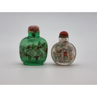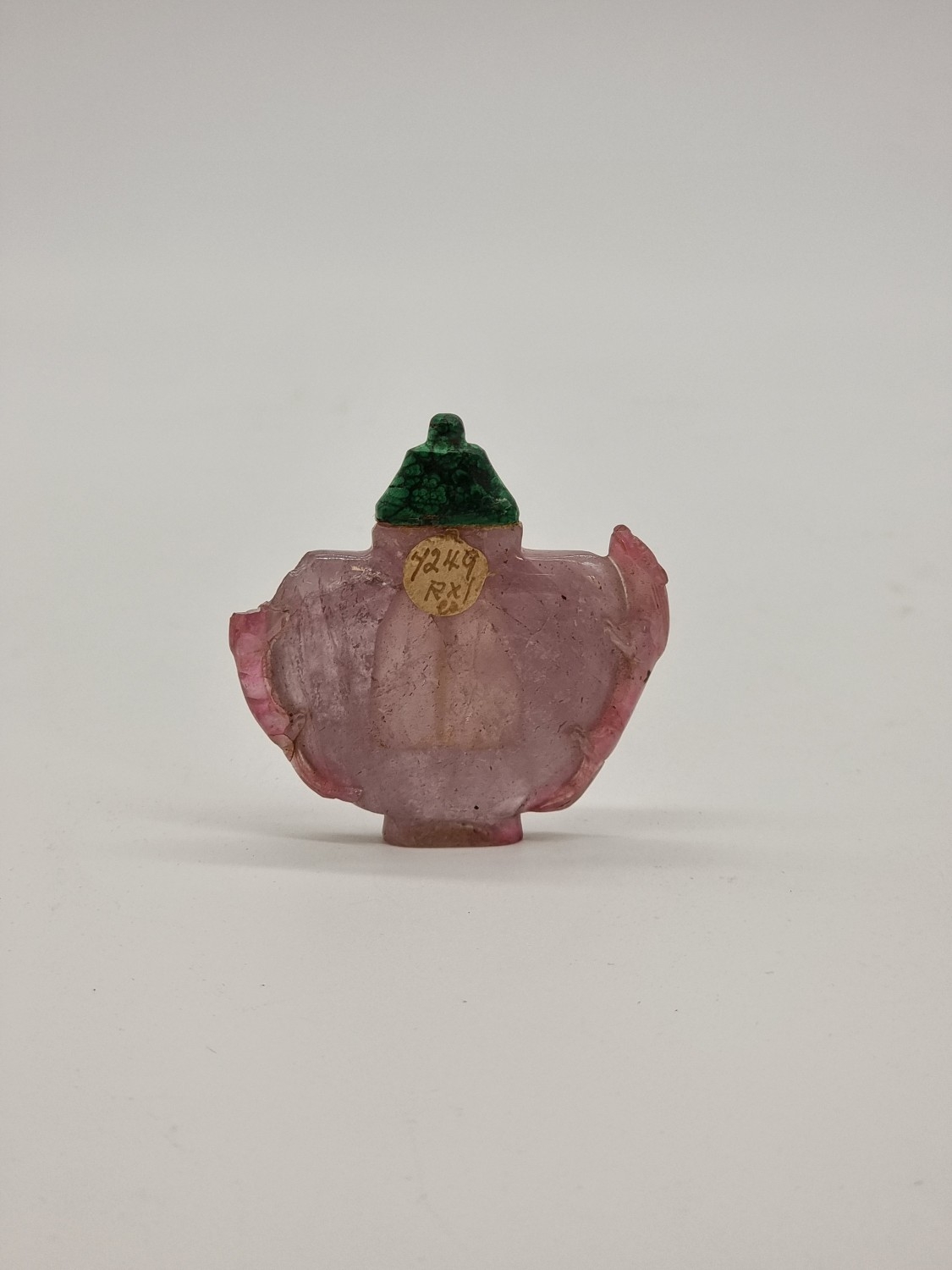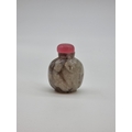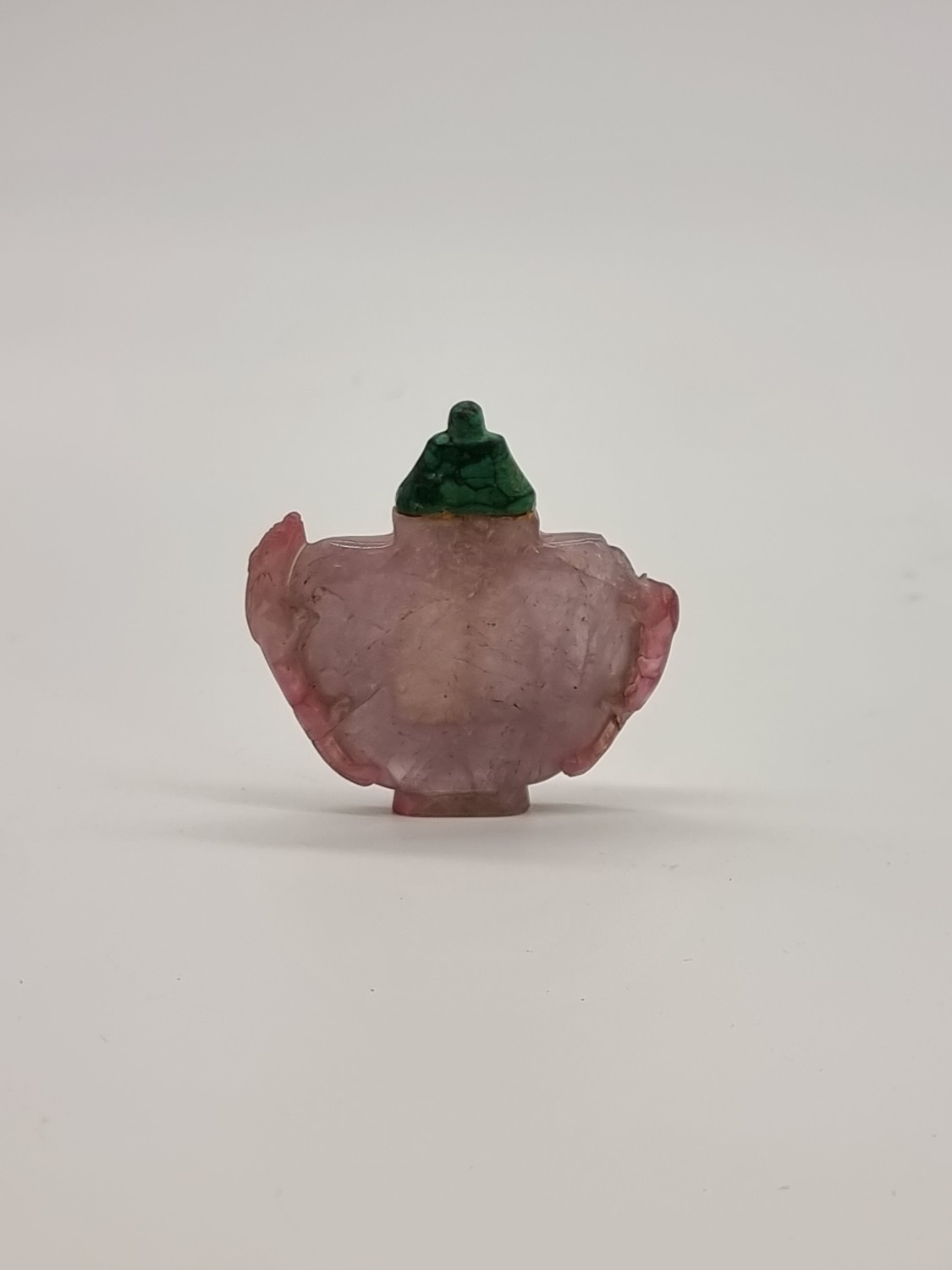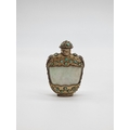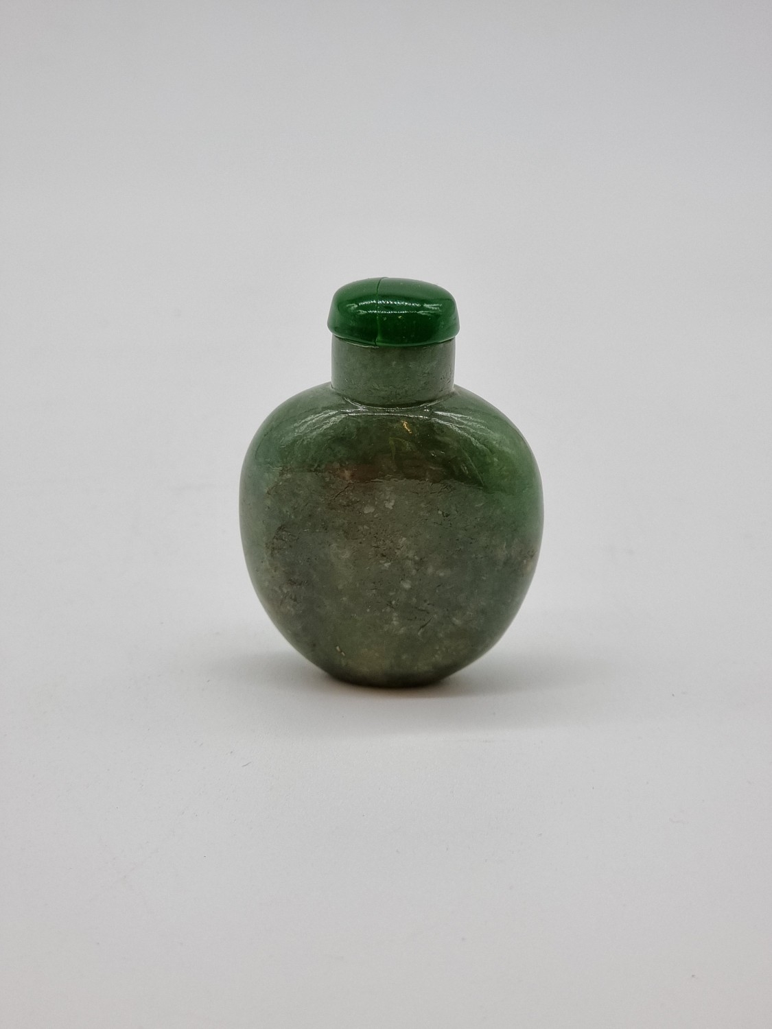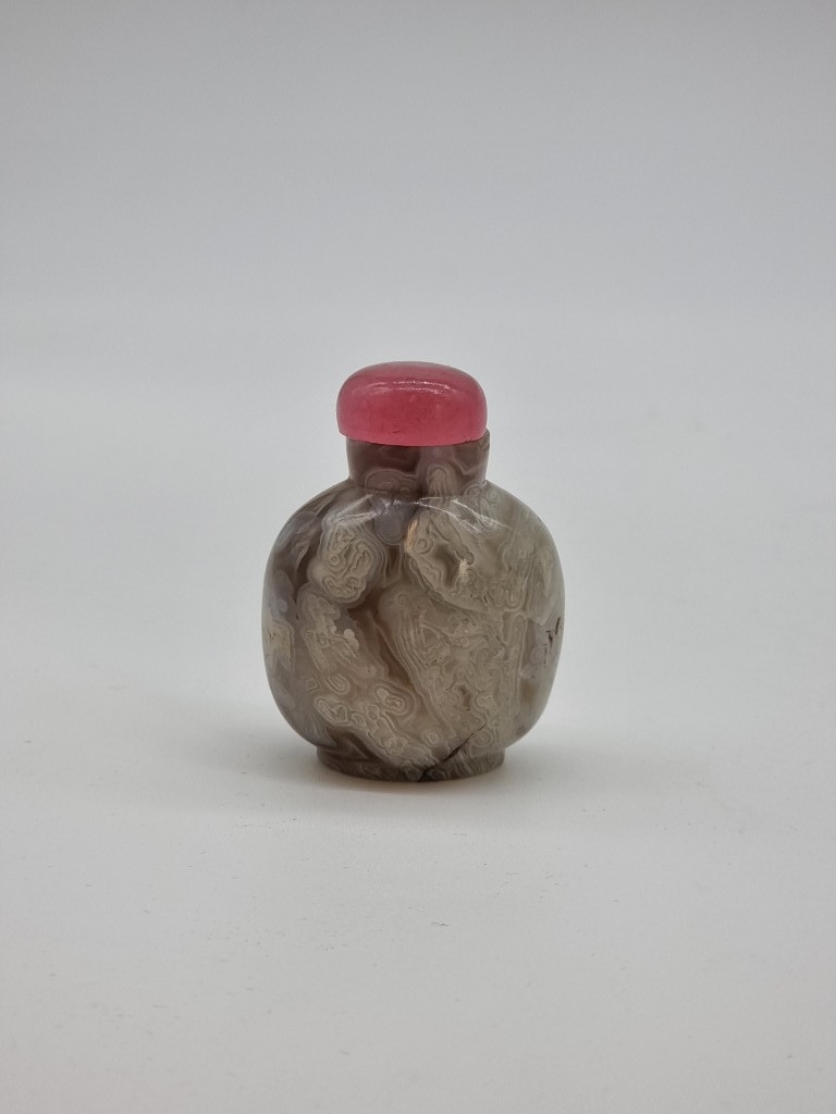 Four Chinese snuff bottles and stoppers, comprising: an agate example, (polished flaw), 5.3cm high, with pink glass stopper; a green jade example, 5.4cm high, (jade stopper broken); a rose quartz example, (a.f.), with malachite stopper, total height 5.8cm high; and another metal and turquoise mounted jade example, 8.2cm high. (4)