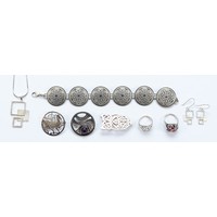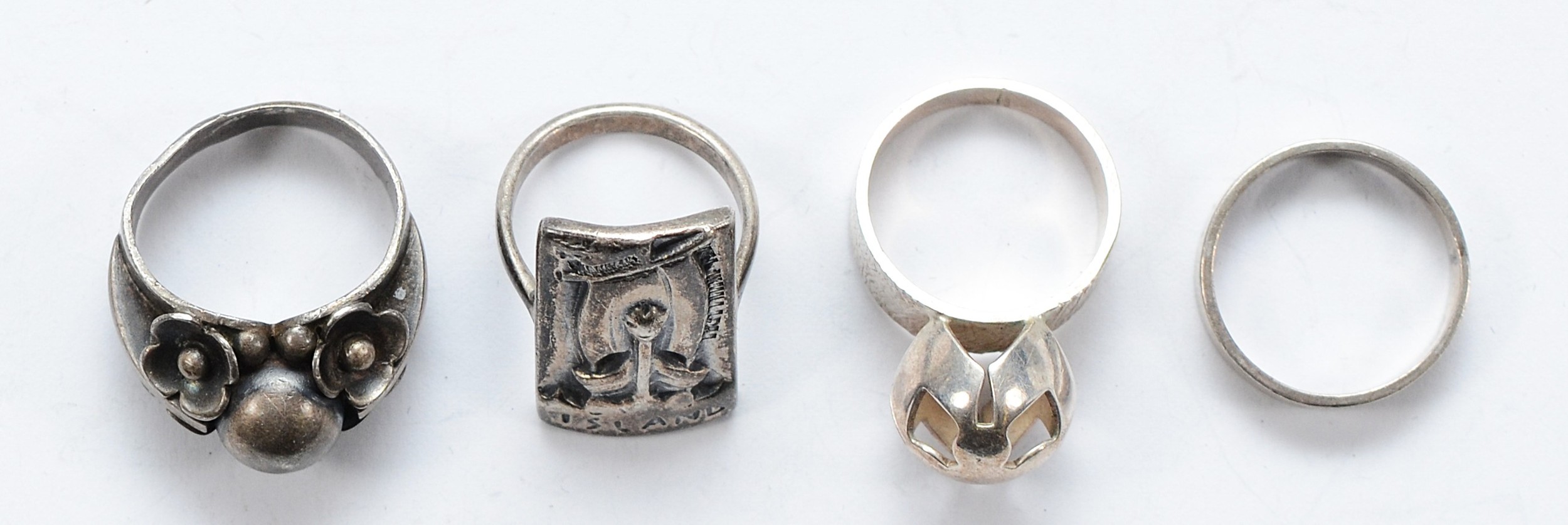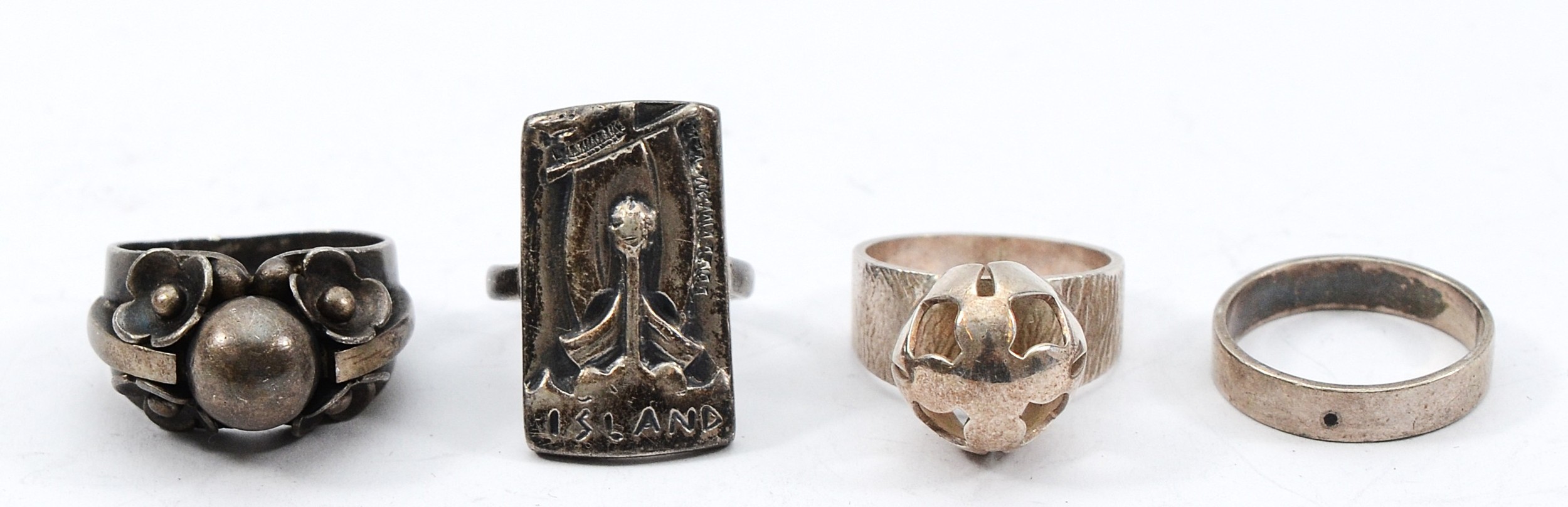 Atelje Stigbert, a Swedish silver ring, L, FROM, a 925 silver band ring, M, an 830 silver ring, J 1/2, and a Grethe Drescher 830 silver floral ring, J, 24g