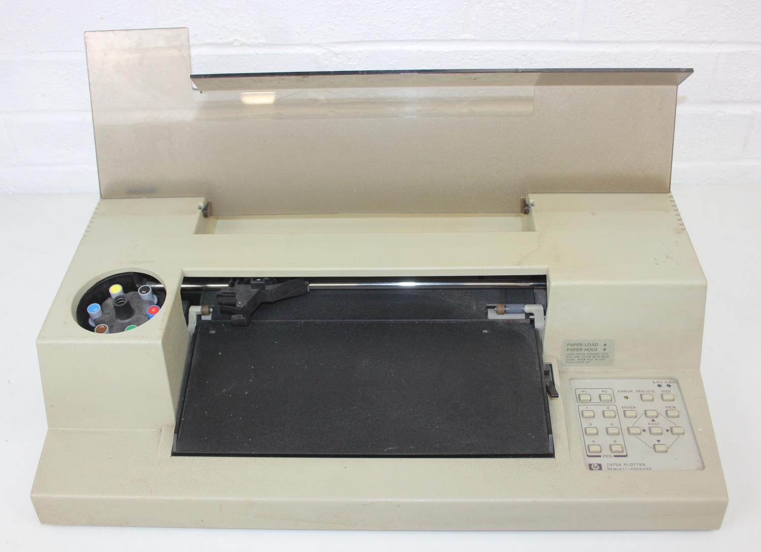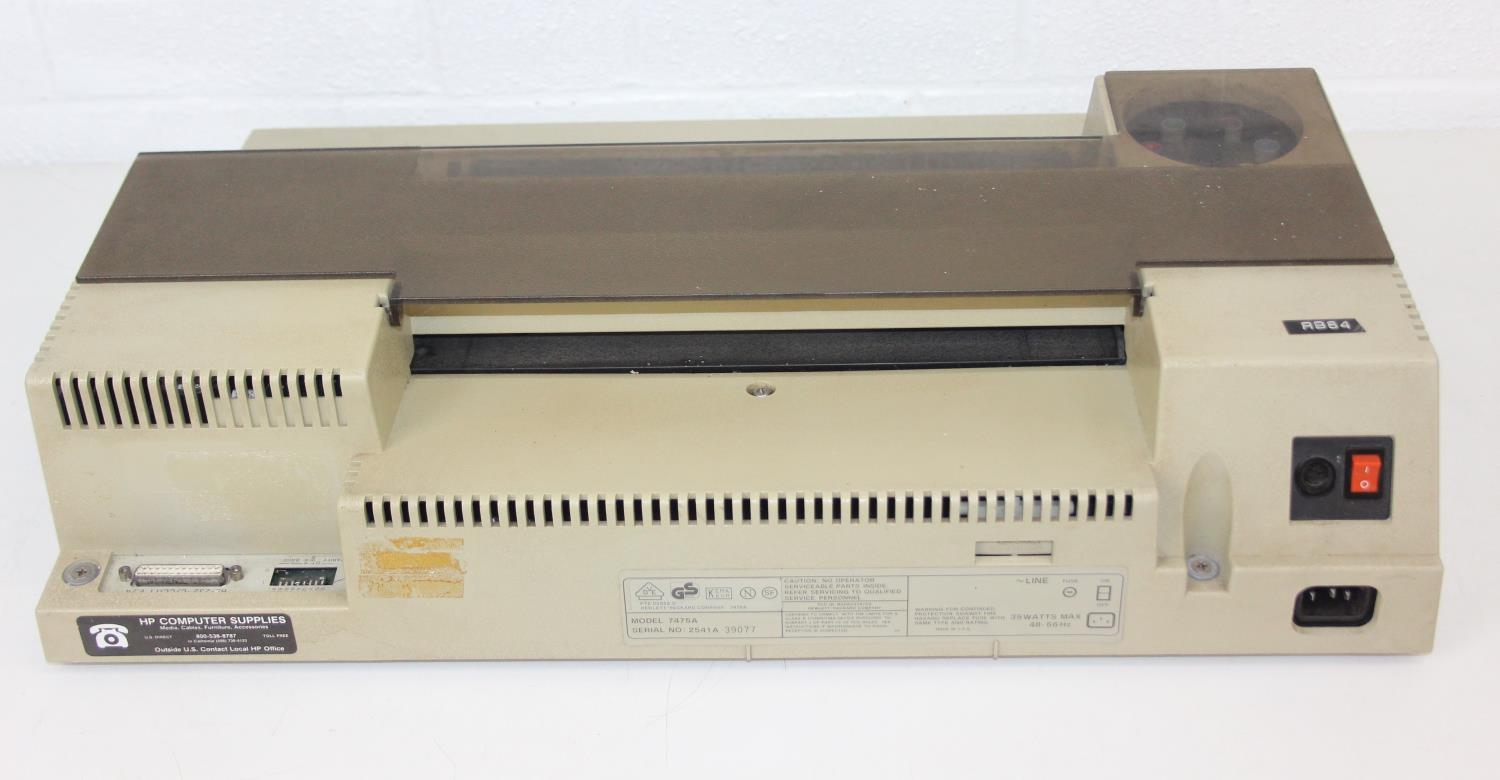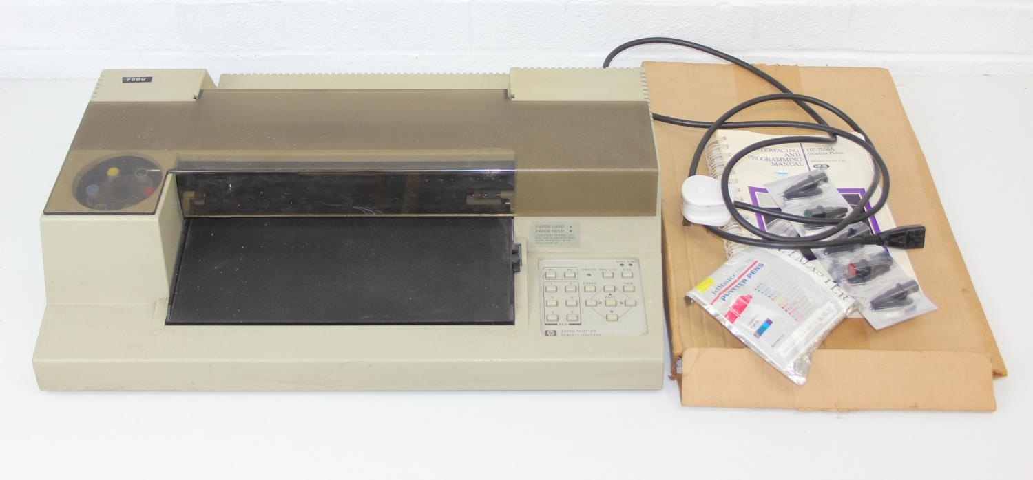 A vintage HP 7475a Desktop Pen Plotter or printer with a number of consumables to inc paper, and a manual