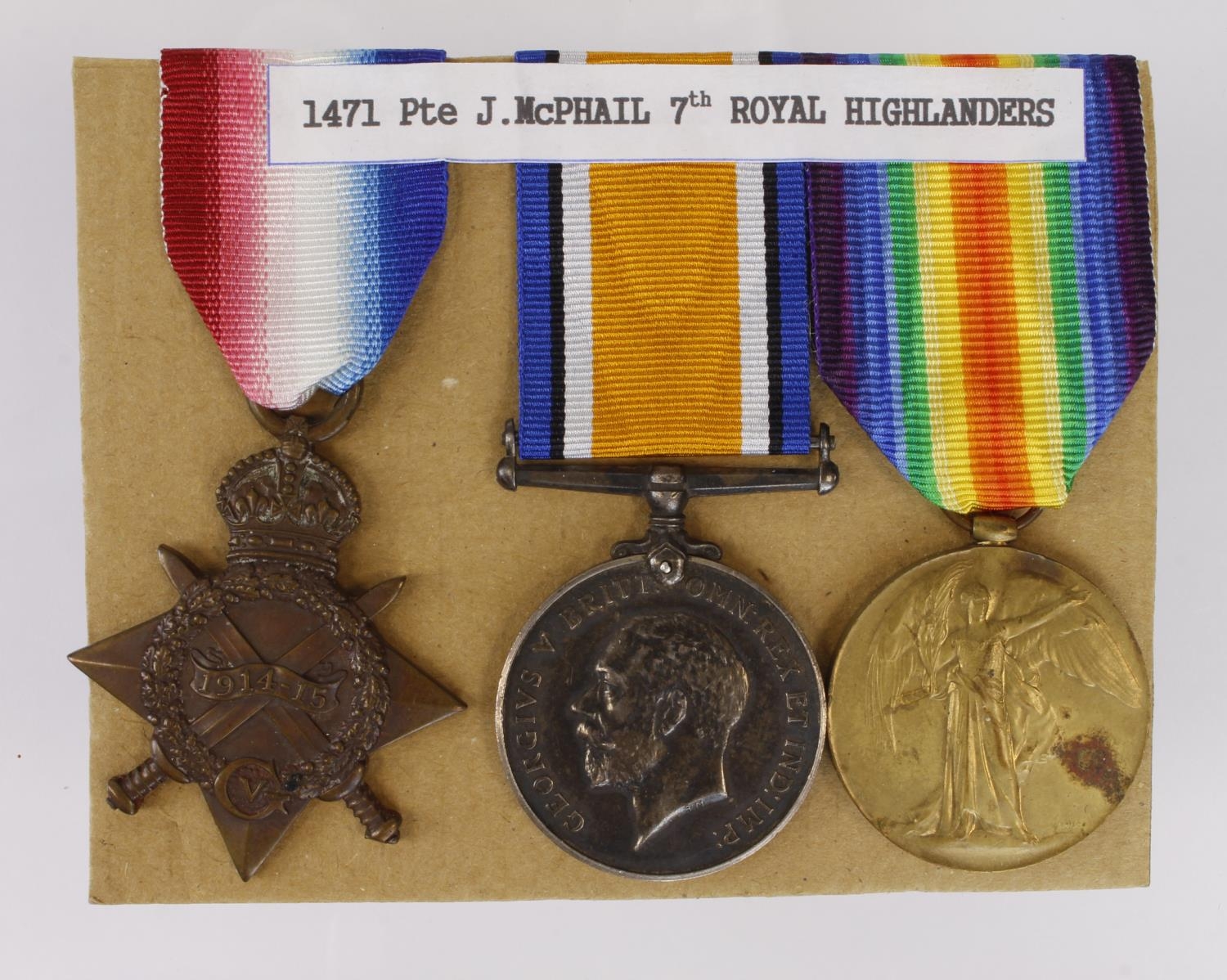 1915 Star Trio to 1471 Pte J McPhail R.Highlanders. Born Ballingry. Served with 7th Bn. (3)