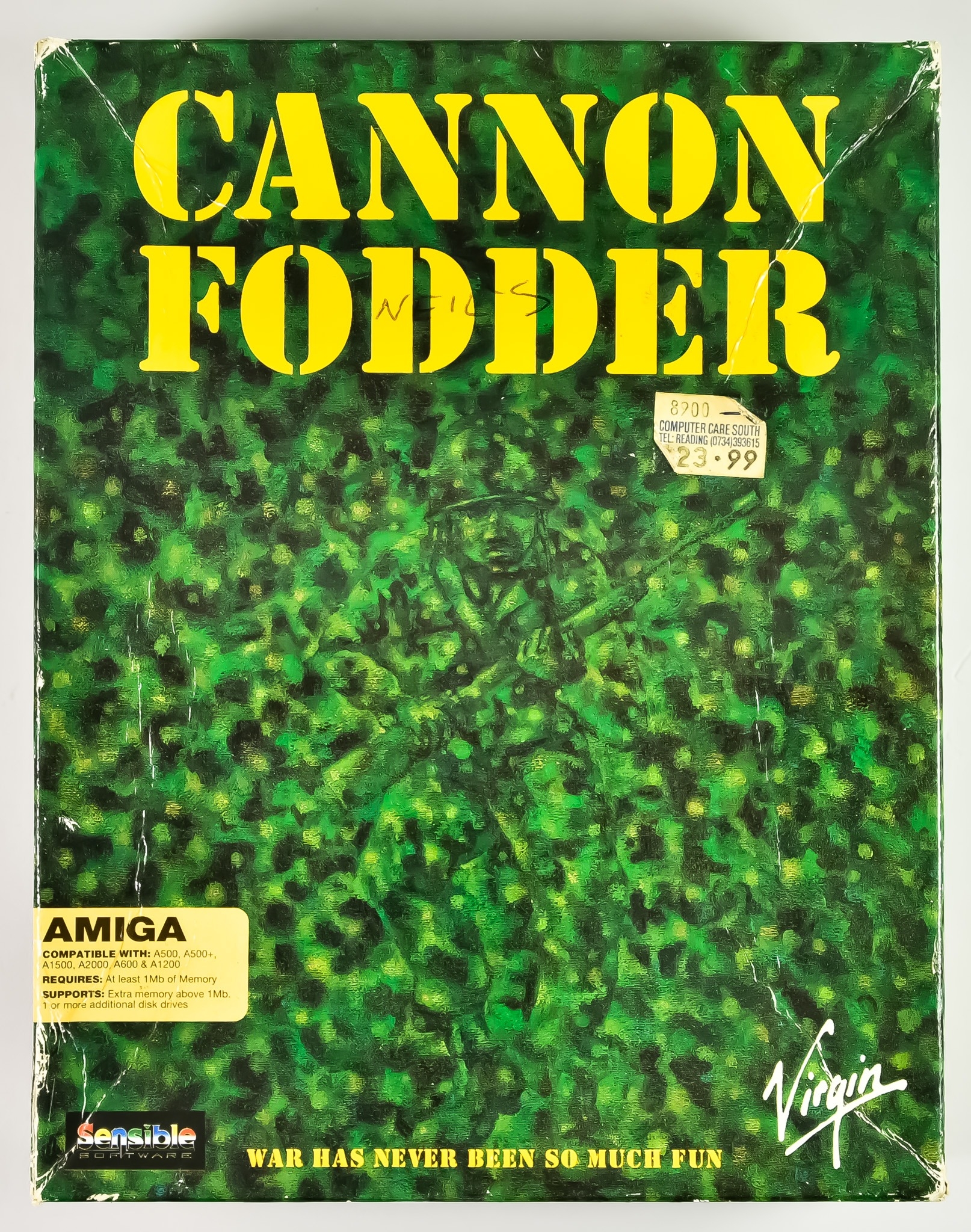 1993 Commodore Amiga - Cannon Fodder - English big box, including three disks, instruction manual and bonus Cannon Fodder Soccer floppy disk