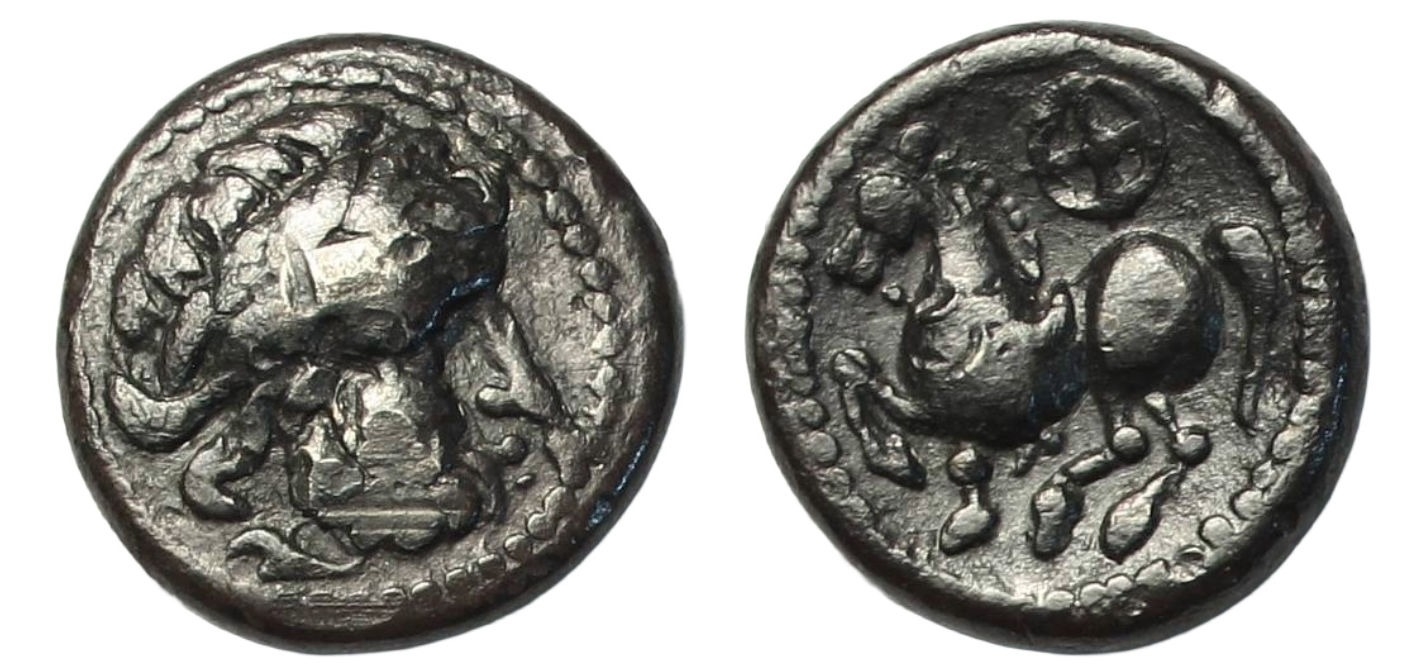 † Celtic, Danube, Imitations of Philip II of Macedon (c.200-100 BC) Drachm, "Kugelwange" type Stylized laureate head of Zeus right, rev. stylized horse prancing left, wheel above, 2.59g, (Lanz 507). Extremely fine