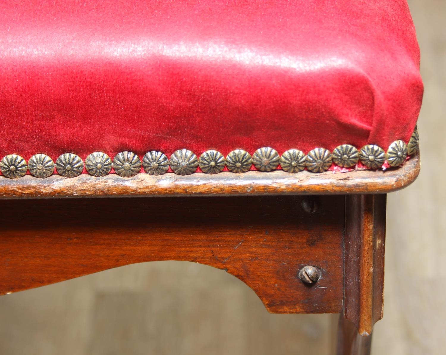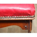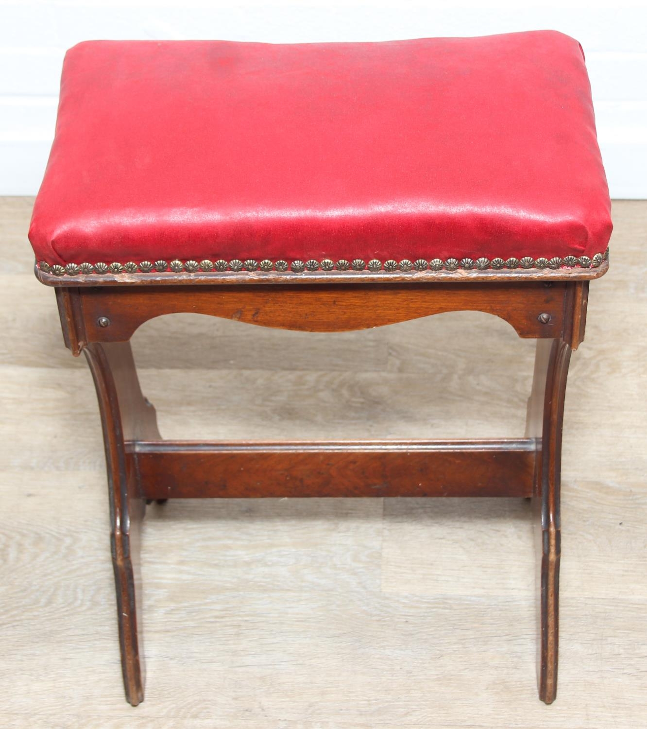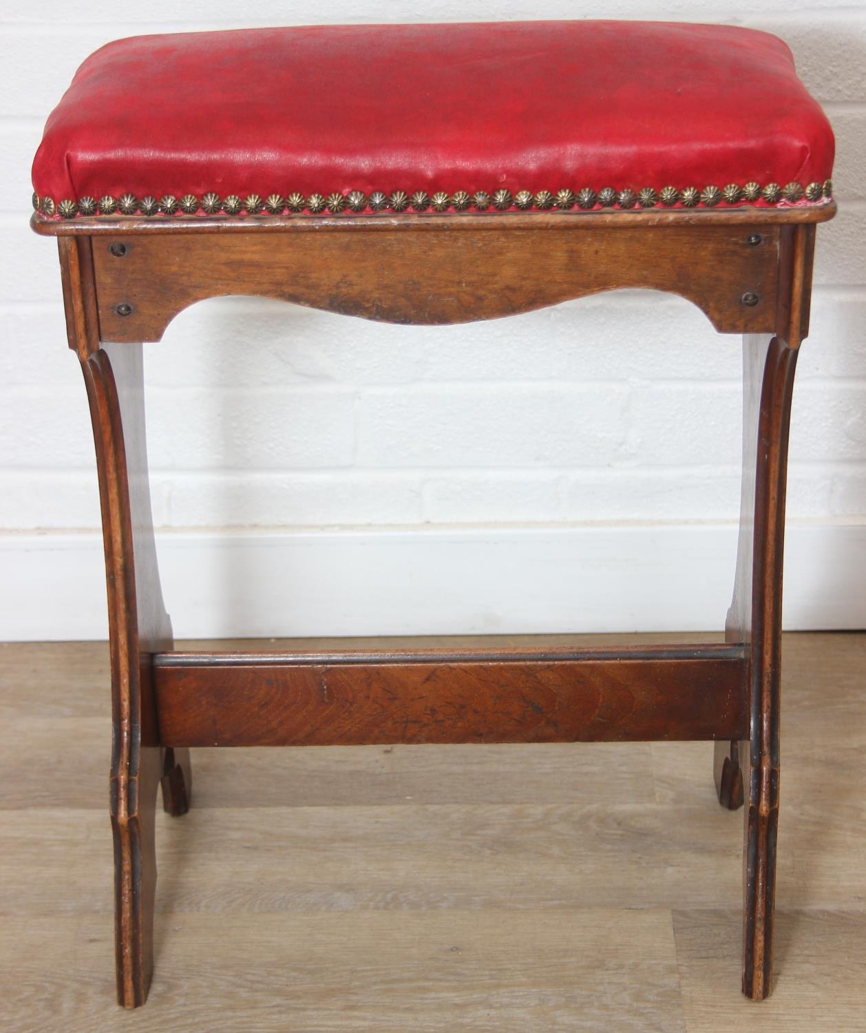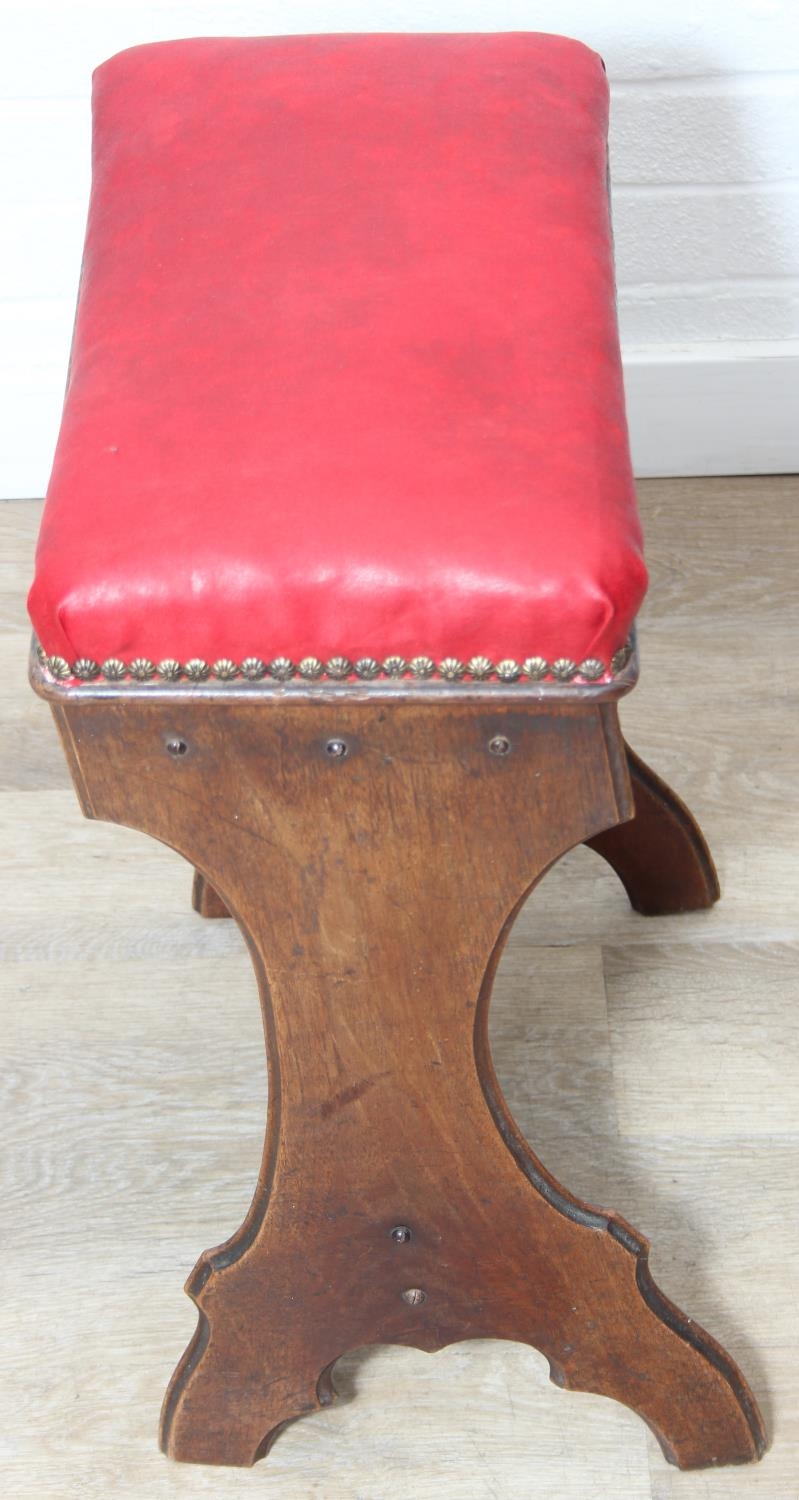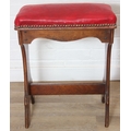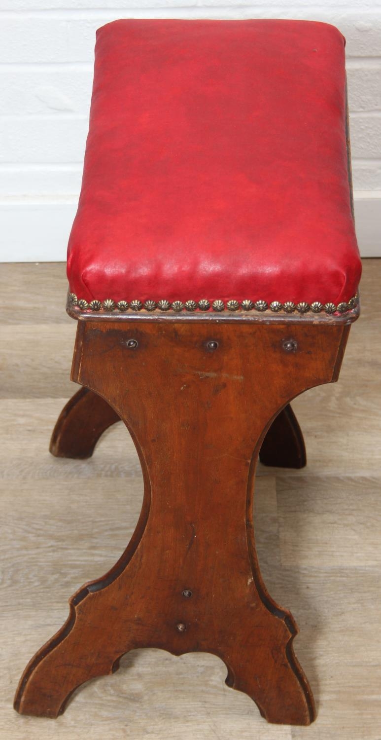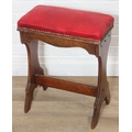 An antique piano or organ stool with mahogany side and red upholstered top, 44cm x 26cm x 58cm