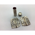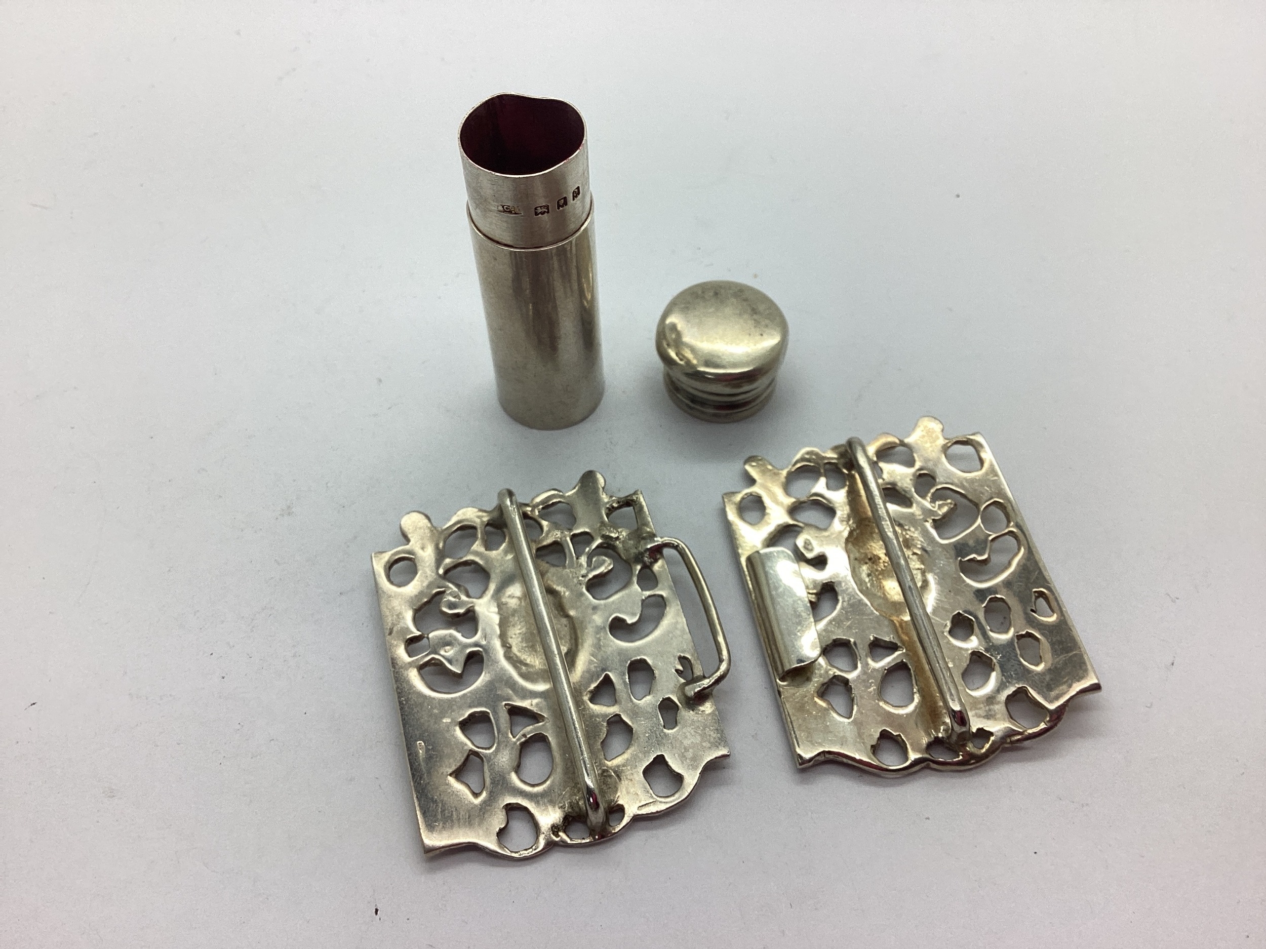 A Hallmarked Silver Nurse's Buckle, the oval centre panels bearing hallmarks, within ornate openwork rectangular surrounds, London 1975; Together with A Hallmarked Silver Lipstick Case, of plain design (dents), London 1919. (2)