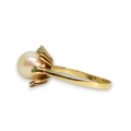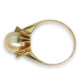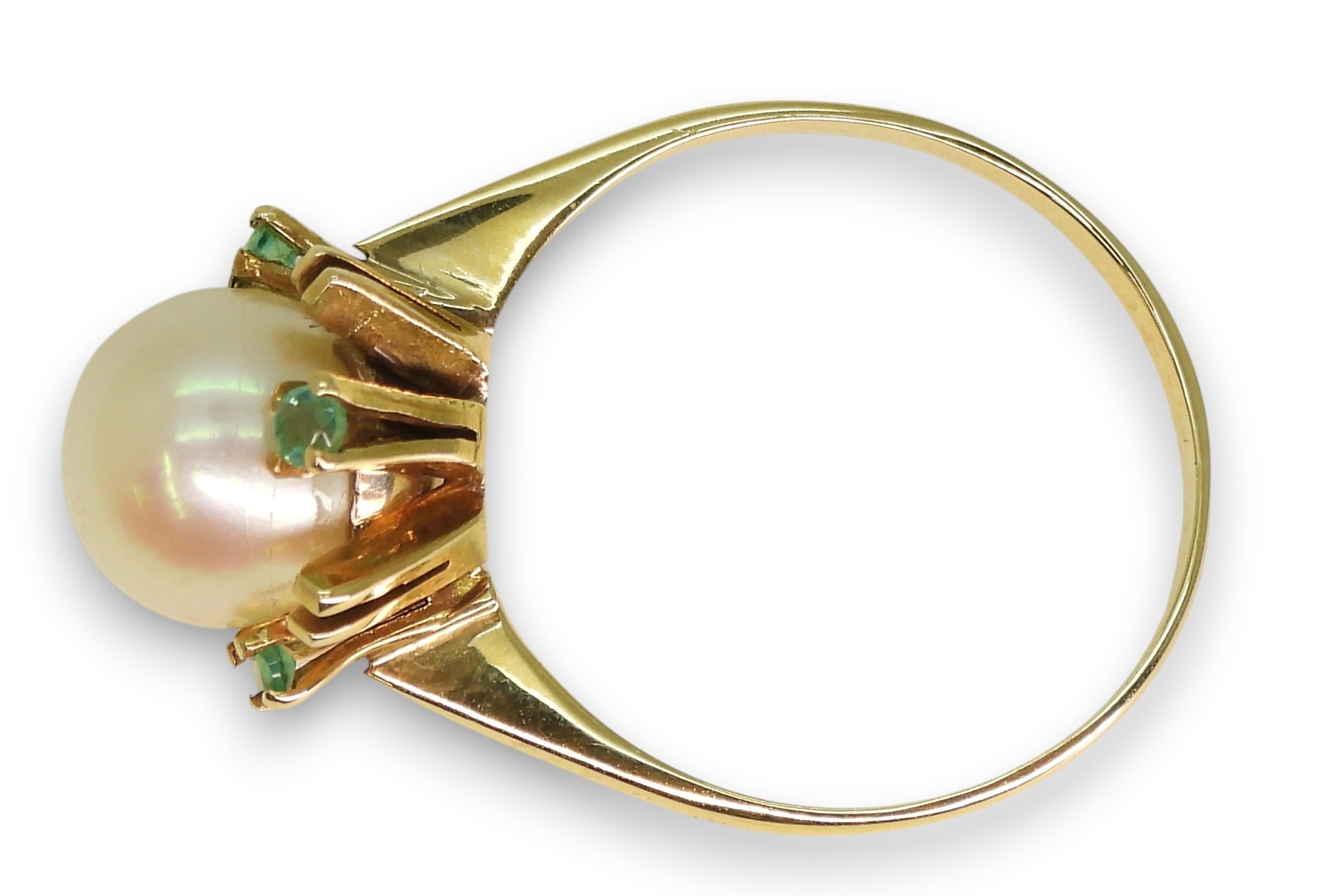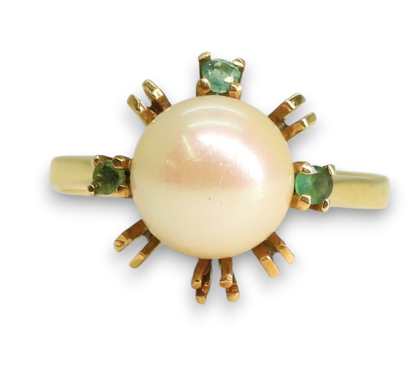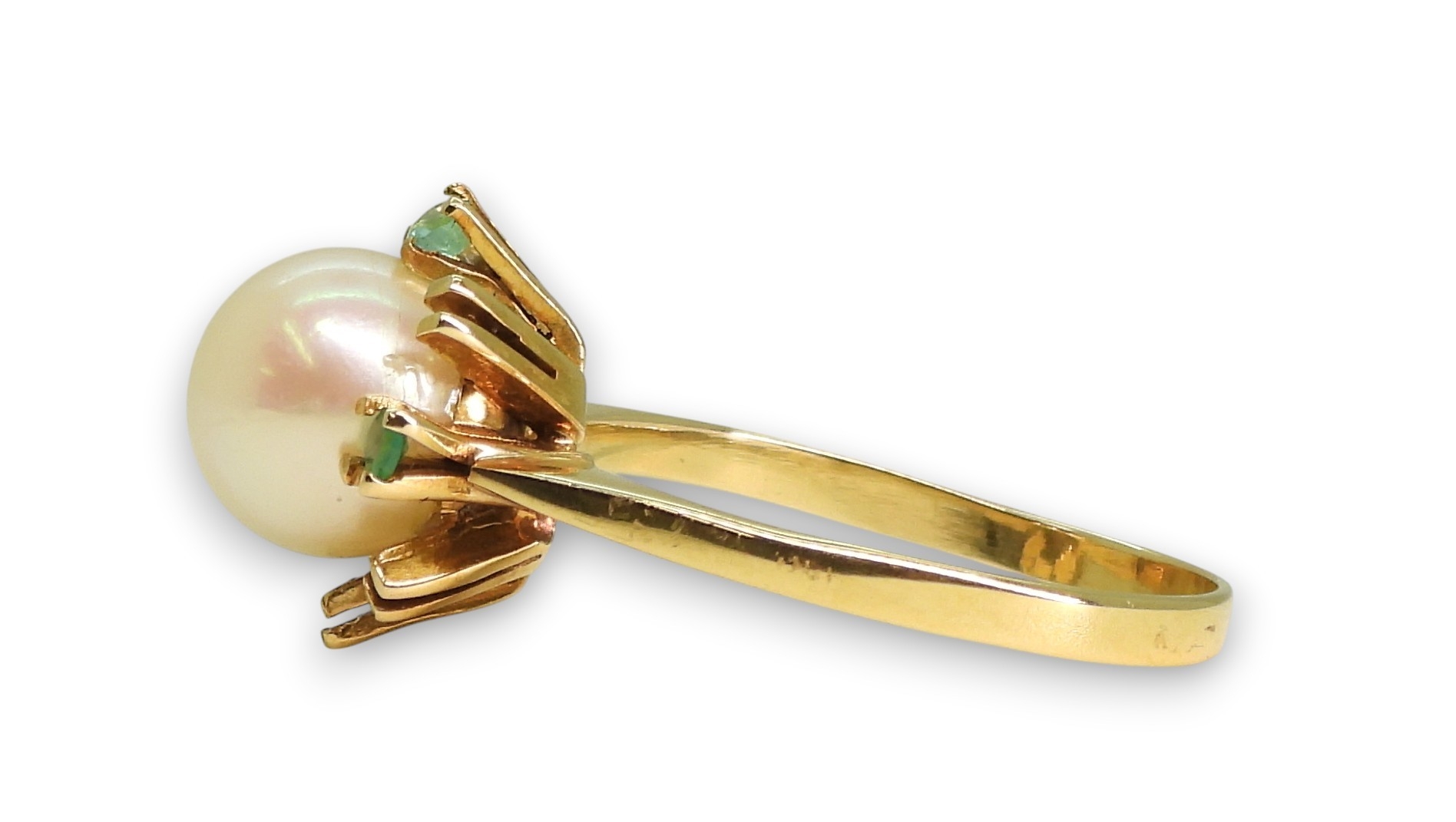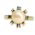 A bright yellow metal pearl and emerald retro ring, (one emerald missing) size N1/2, weight 3.4gms