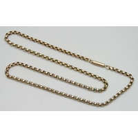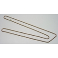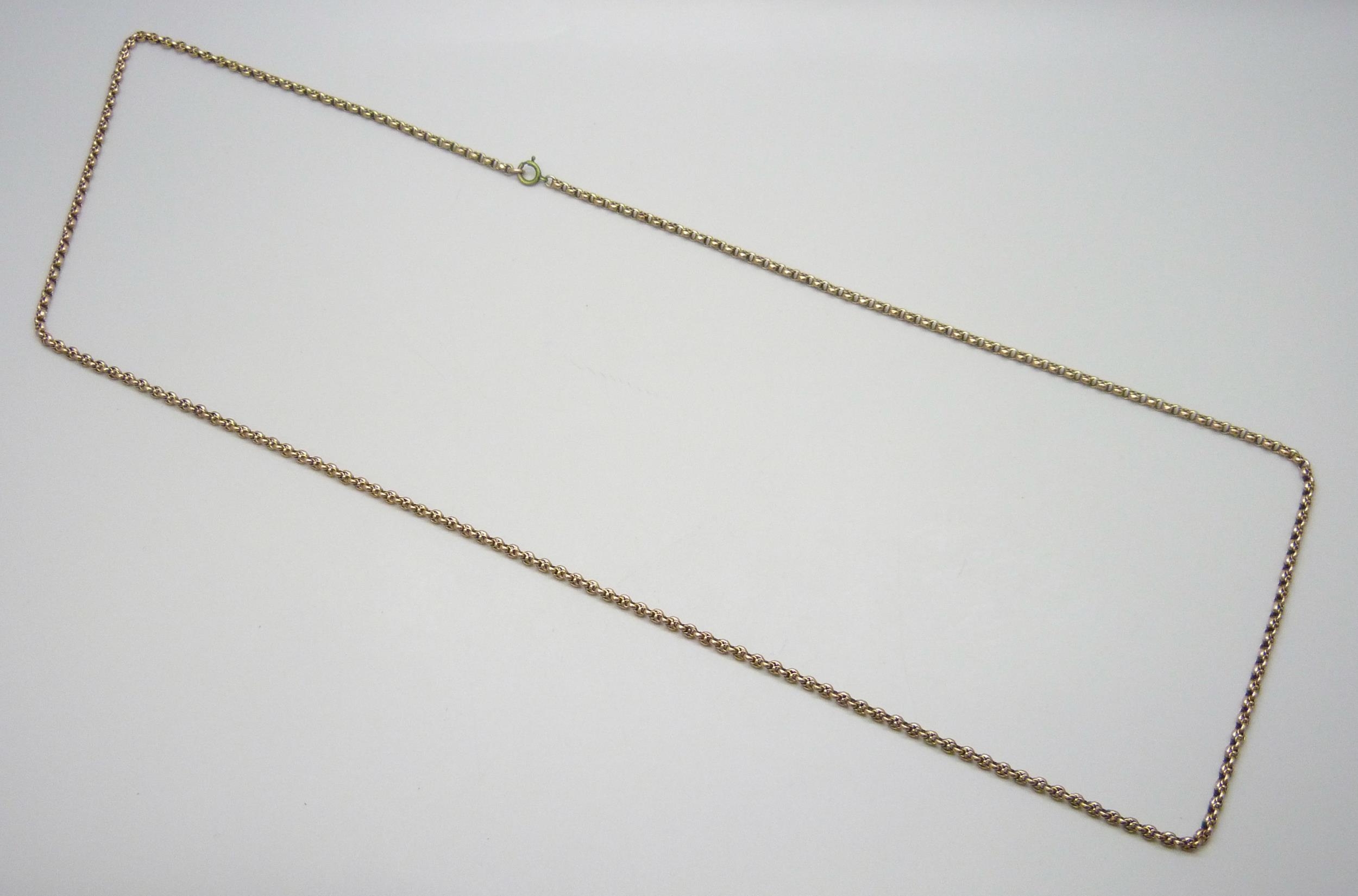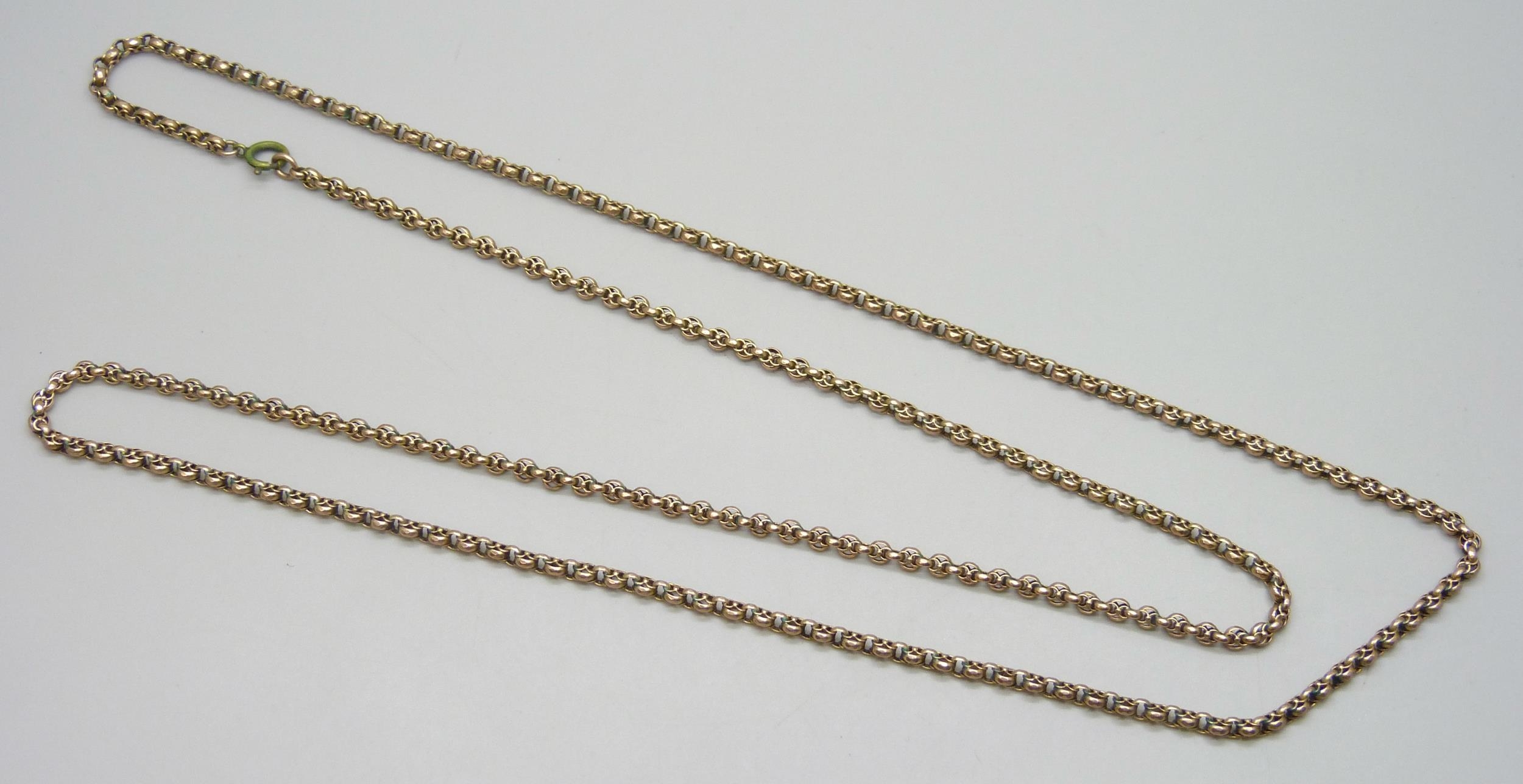 A yellow metal long guard chain, with a base metal replacement clasp, 20.2g, 98.5cm