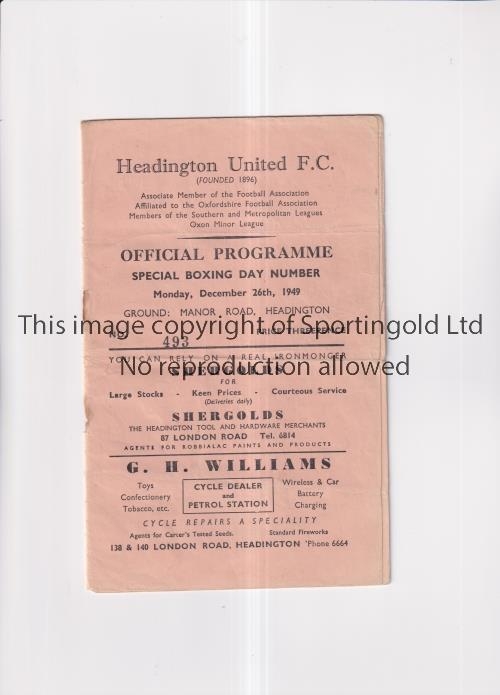 HEADINGTON UNITED V CHELMSFORD 1949 Programme for the match at Headington Oxford on 26/12/1949. Rust marks and piece off the edge of page 3/4. Fair
