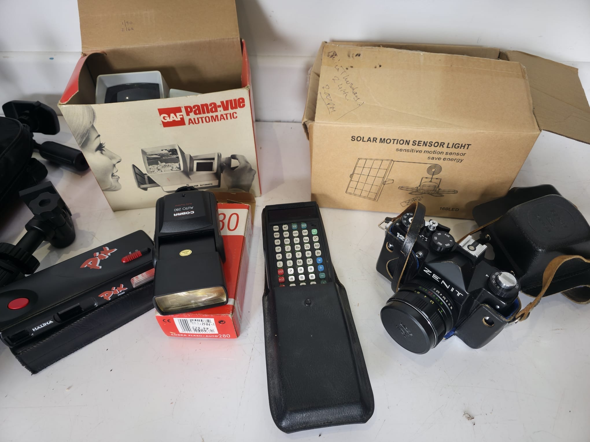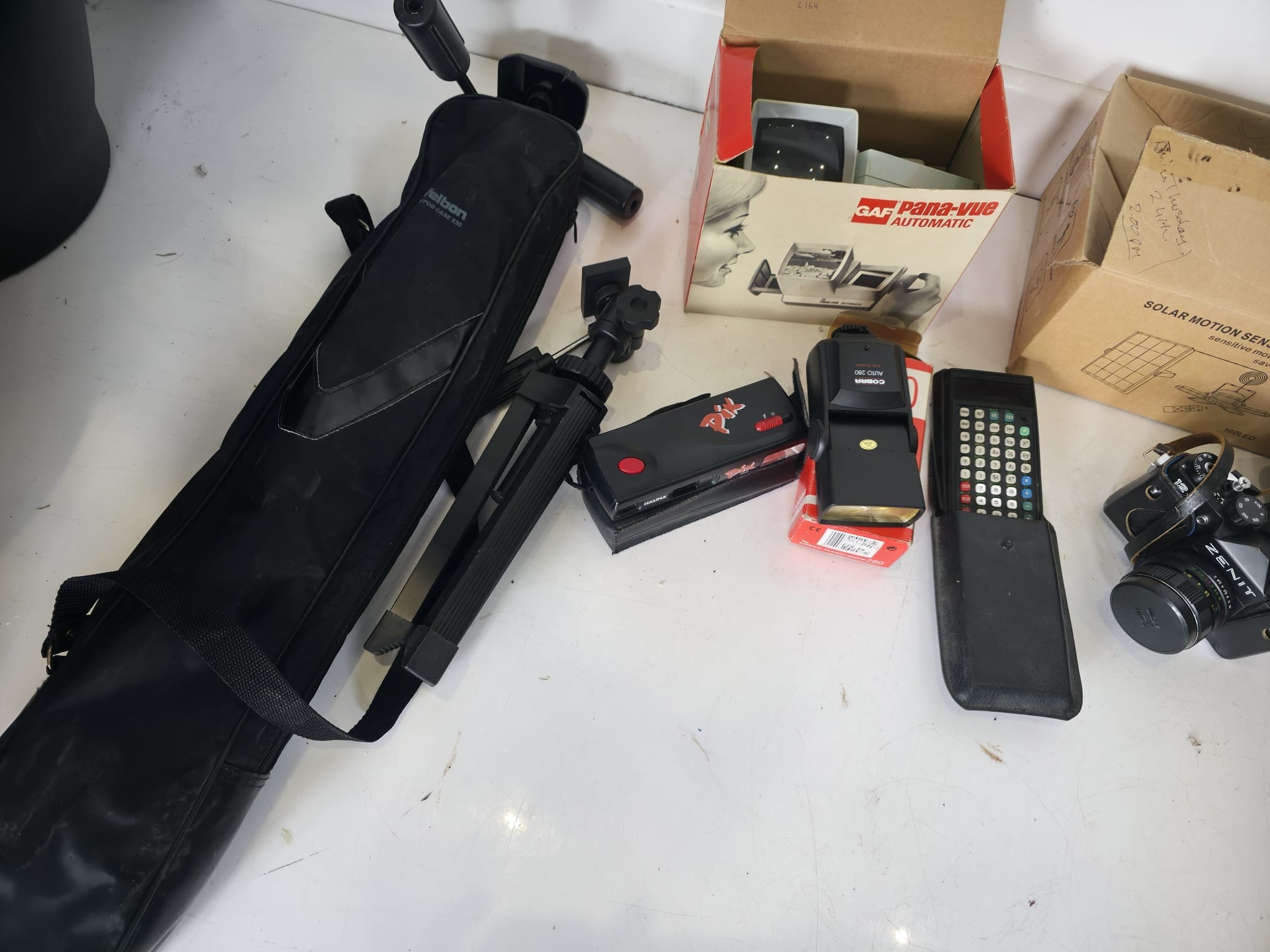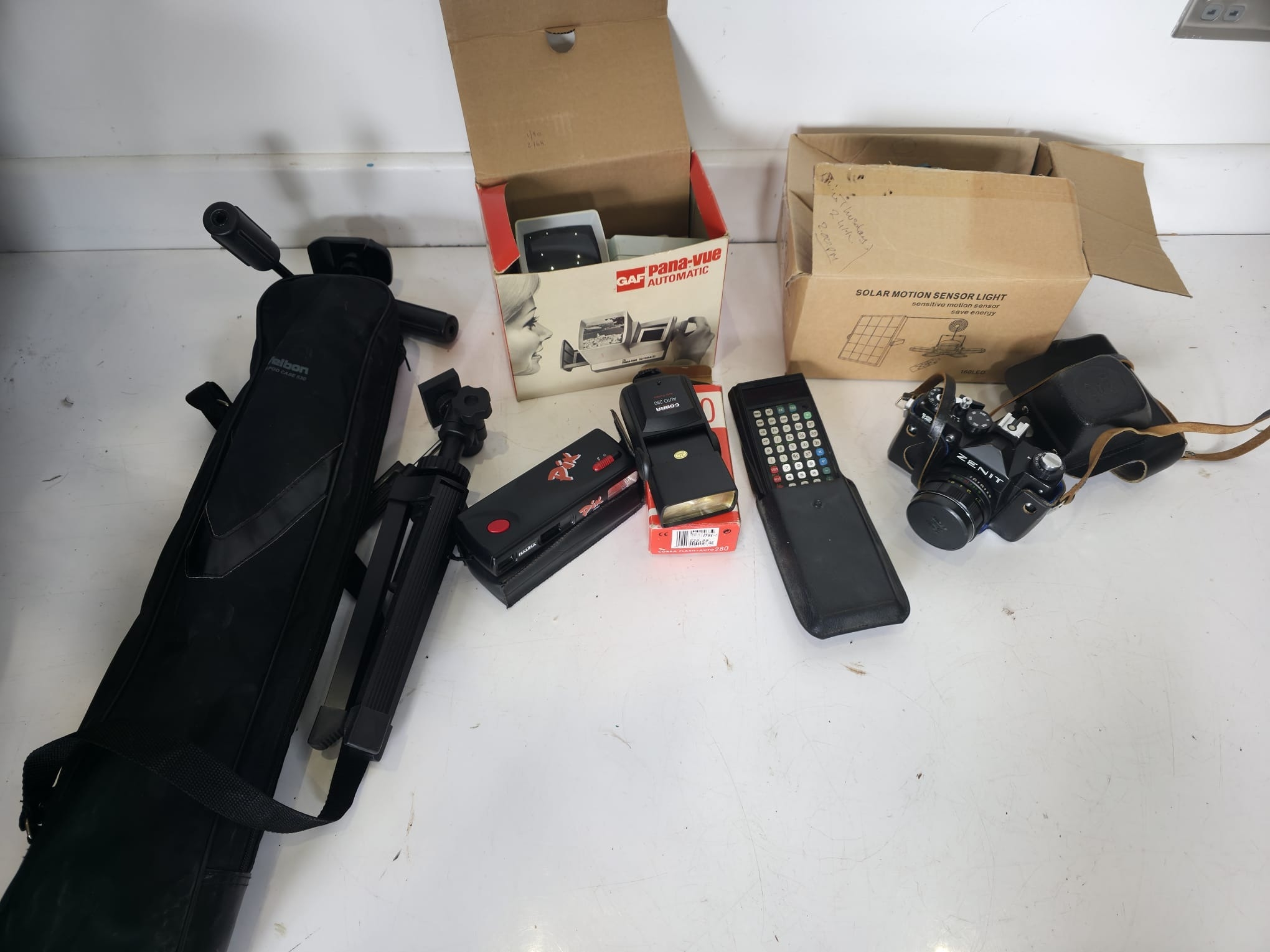 A mixed lot including a Zenit SLR camera with lens and case, GAF Pana-Vue slide viewer in original box, Cobra Auto 280 flash unit, Pix film viewer, remote control unit, tripod with carry case, and a boxed solar motion sensor light, along with additional accessories.
