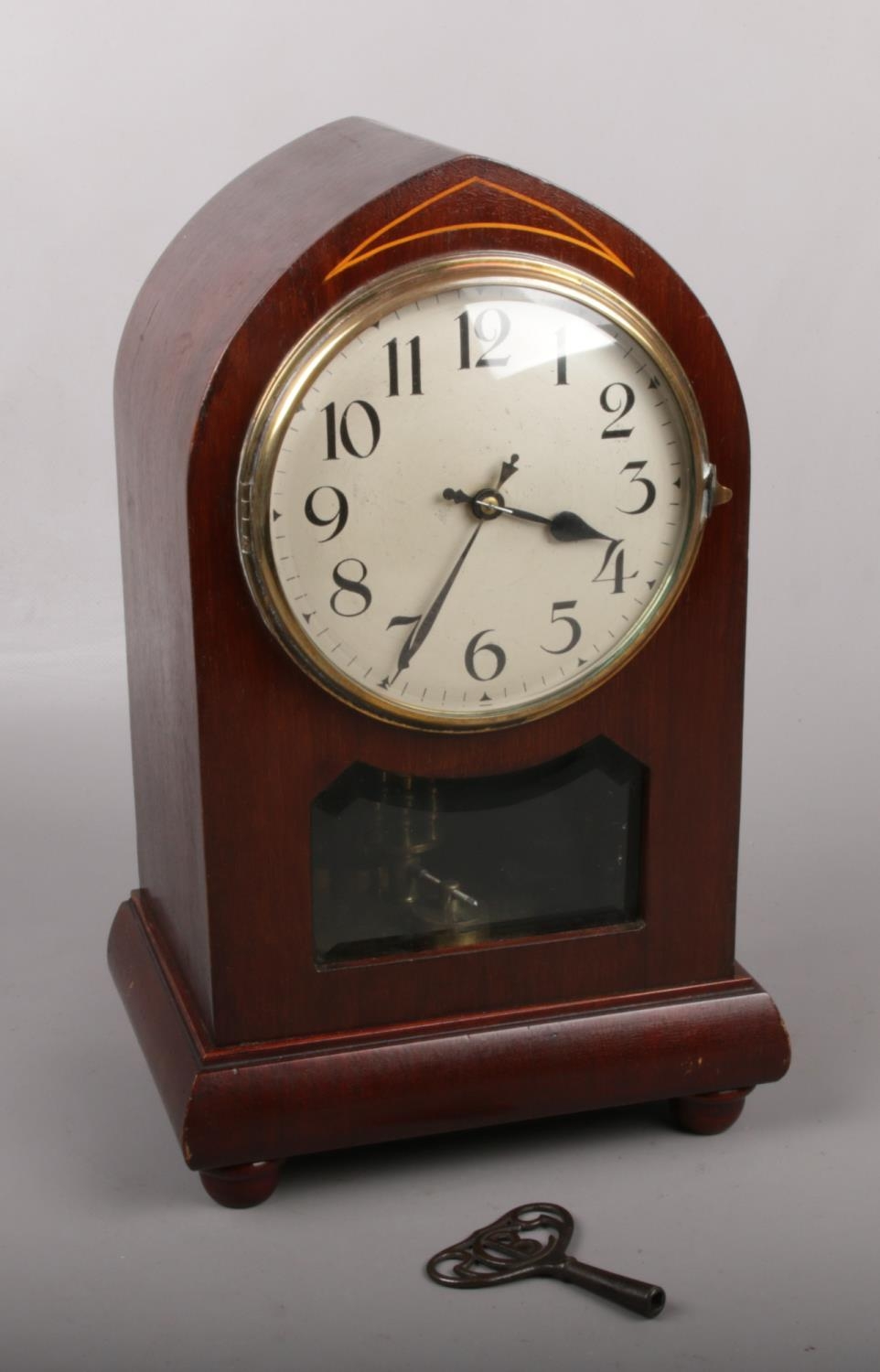 A mahogany cased lancet torsion clock. With silvered dial having Arabic numeral markers, 31cm high.