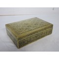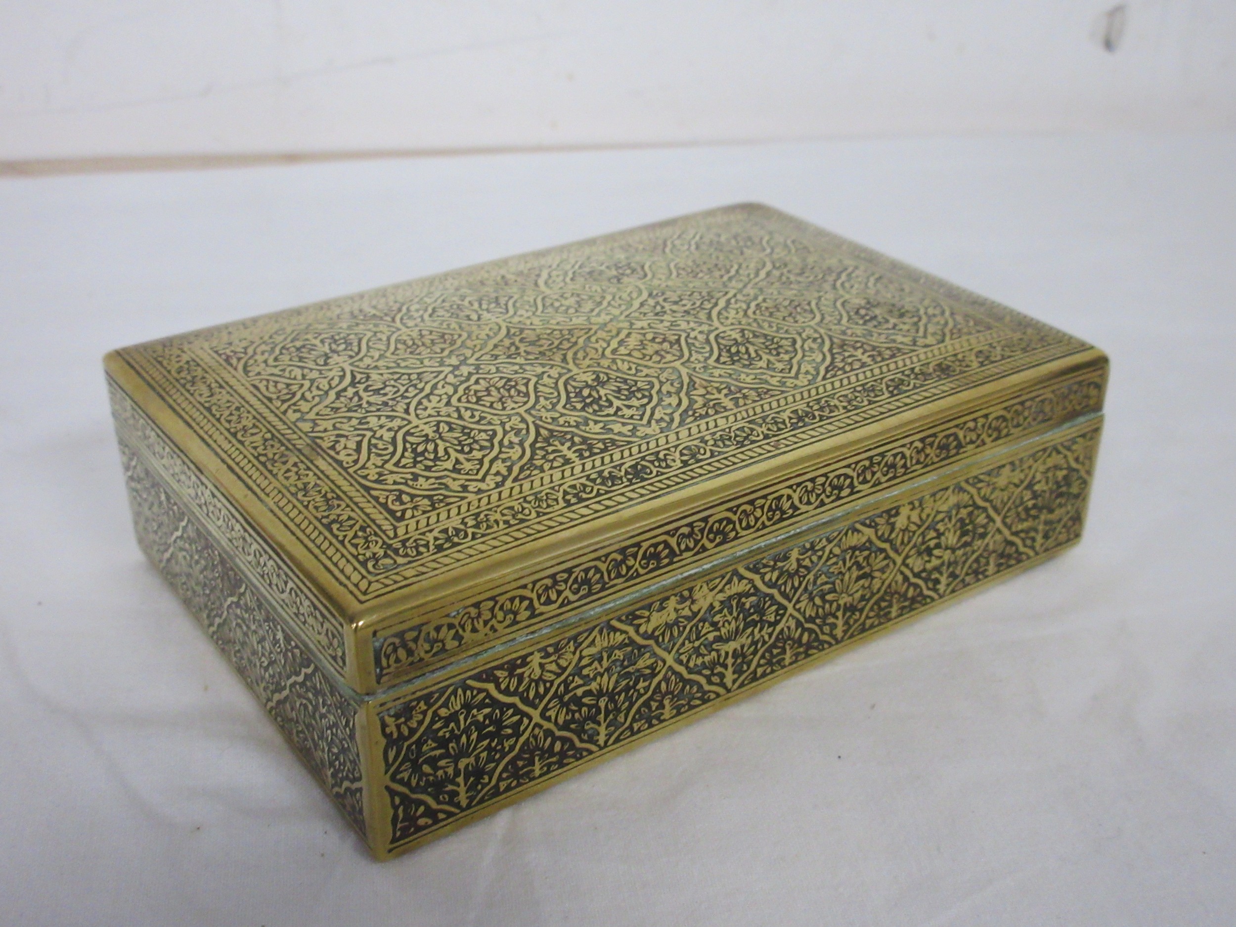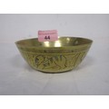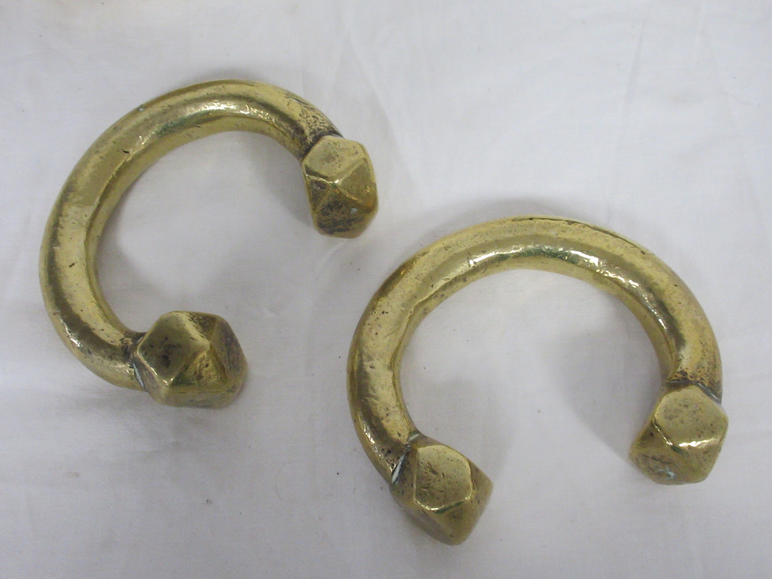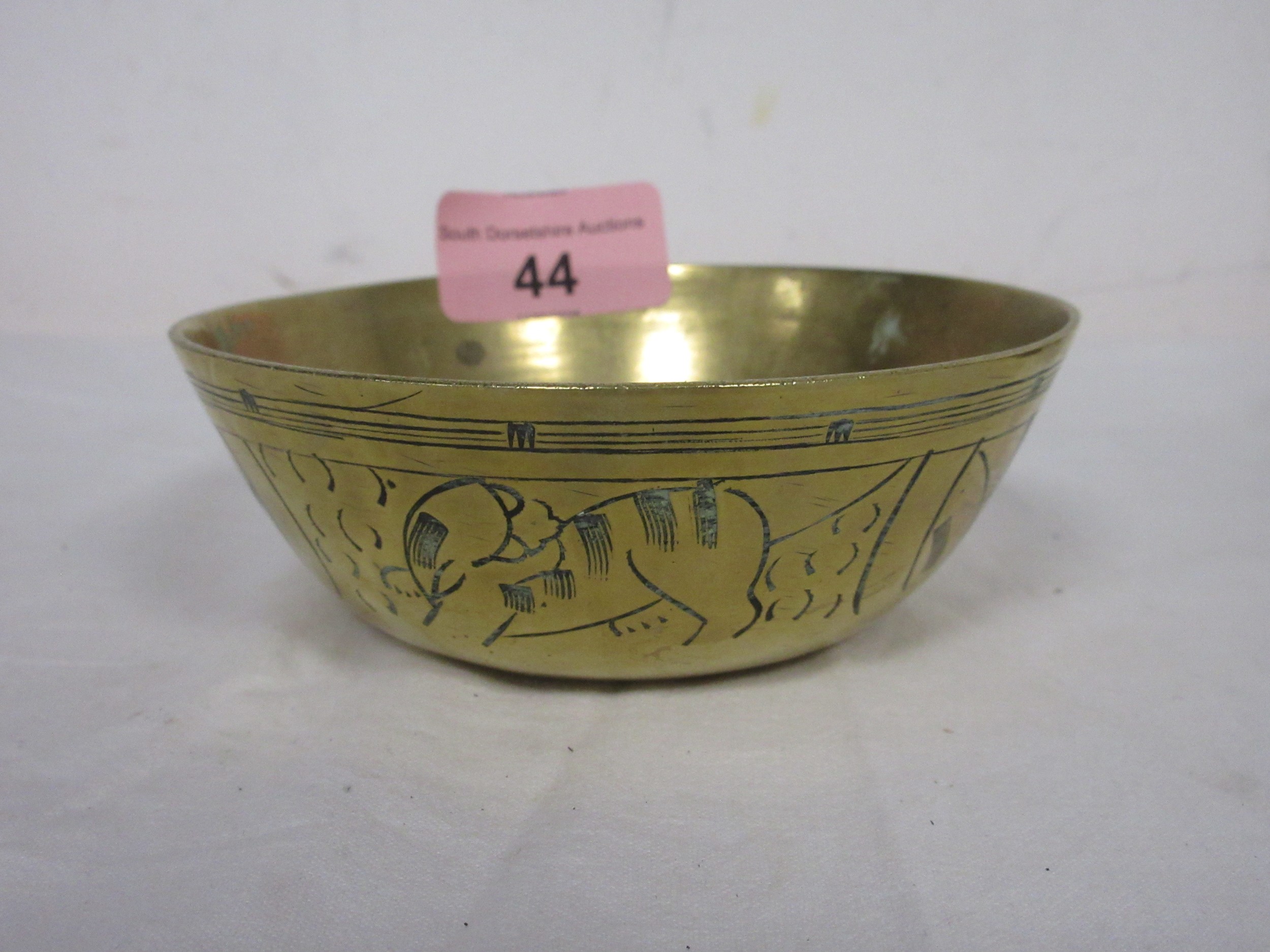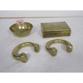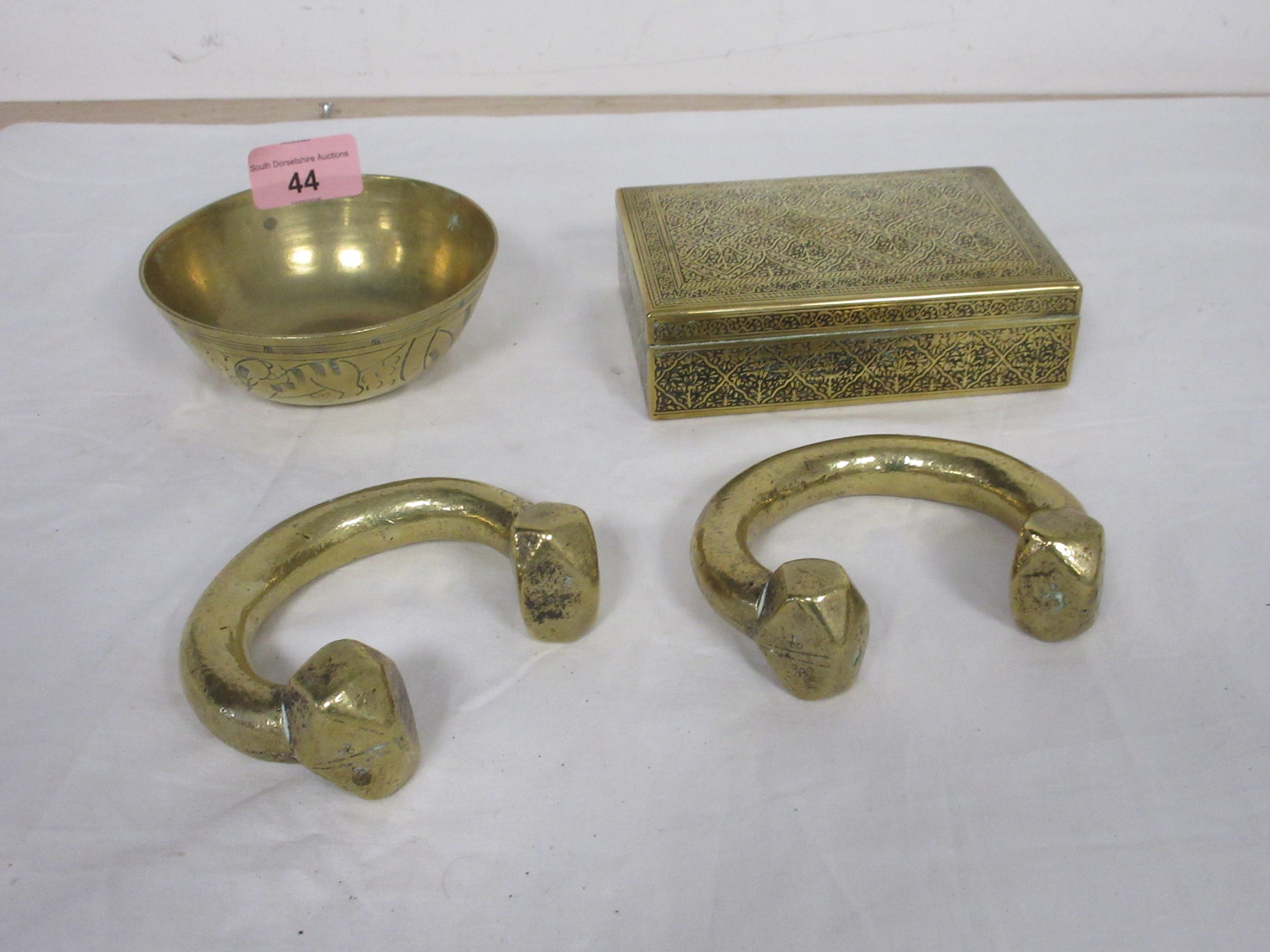 Two heavy brass manillas, an engraved brass cigarette box marked Kinco, and a small brass bowl (diameter 11cm) engraved with stylized elephants
