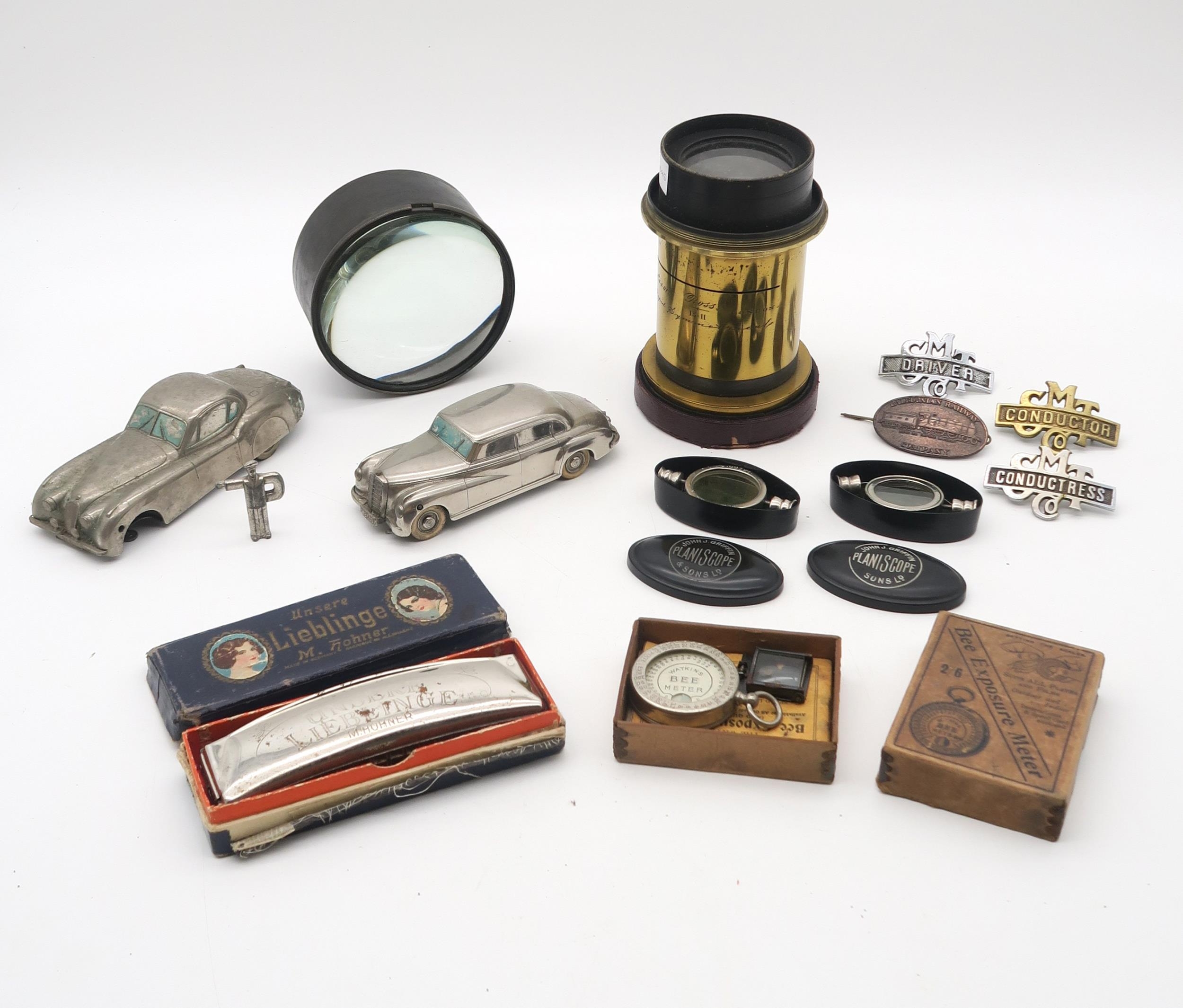 A 13x11 Rapid Symmetrical Lens by Ross, London, no. 44015, a further large lens stamped No. 518209, two cased John J. Griffin Planiscopes, a boxed Watkins' Bee Exposure Meter, boxed Hohner Unsere Lieblinge harmonica, assorted public transport workers' cap badges, two clockwork Kolner Automodelle cars (Jaguar XK 120 and Mercedes-Benz 300) and a bowler hat by Christy's of London (small size - approx. 6 7/8) in box