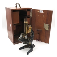 The brass Ross lenses shows fungus, though this would be easily cleaned as both unscrew from the main barrel. Otherwise, they appear to be free from any noticeable damage. There is pitting/corrosion to the lacquered brass finish and wear to the painted edge of the inner lens casing. The Morocco leather outer lens cap is heavily worn and separating at the joint between the side and end pieces. There is no means of adjusting the aperture of the lens.