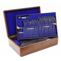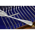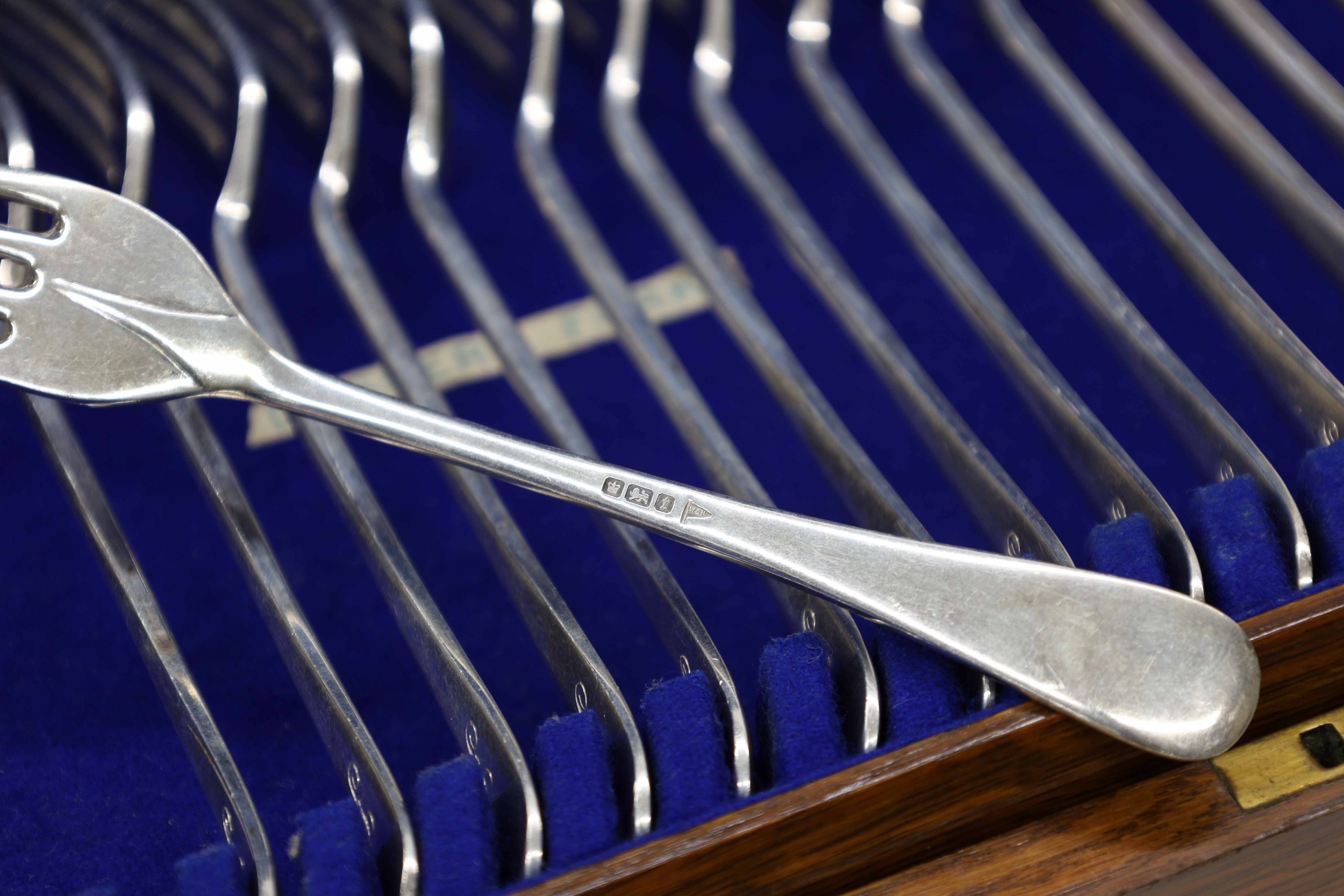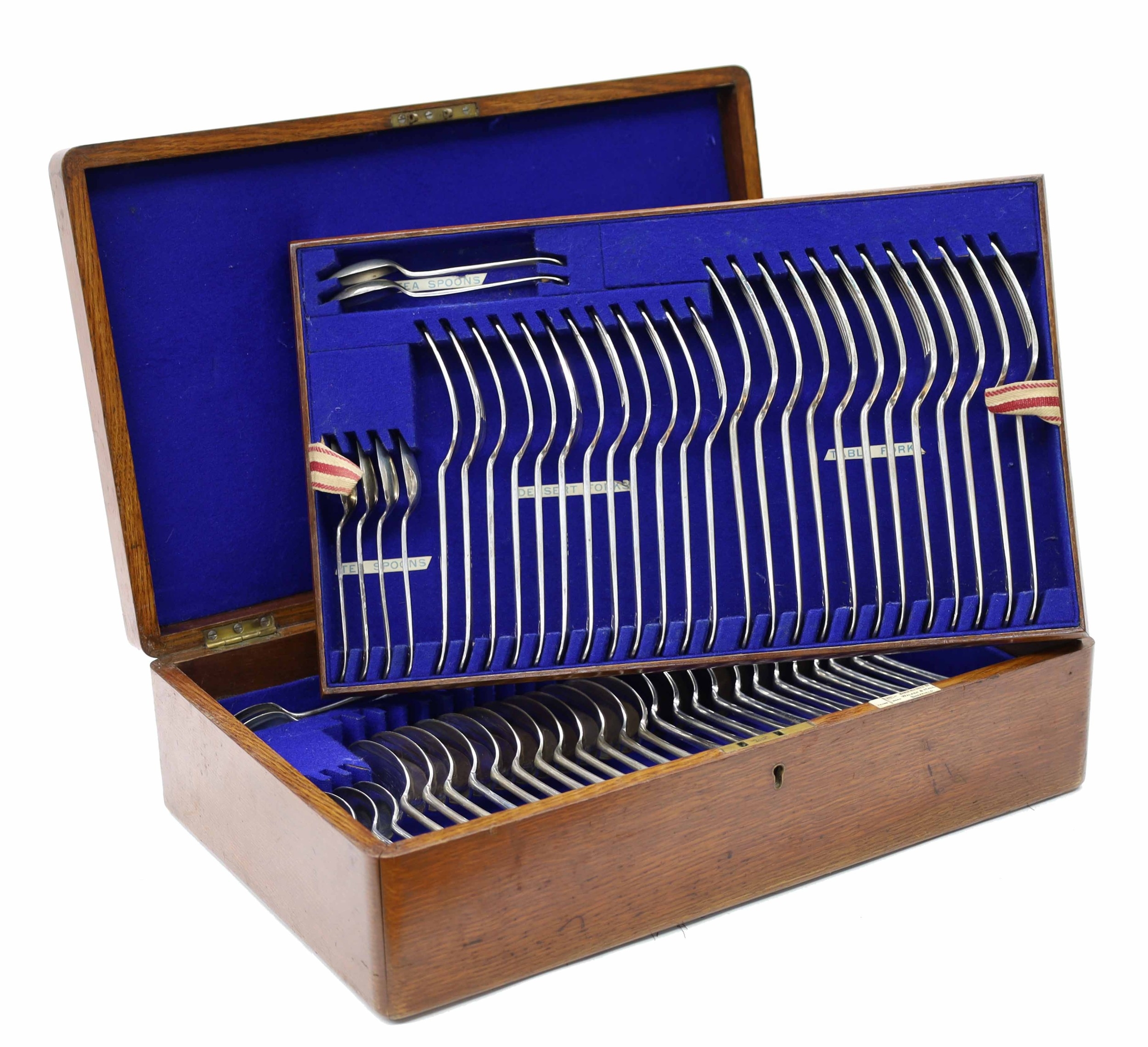Oak cased canteen of Walker & Hall silver rat tailed cutlery, comprising twelve table forks 7.75", dessert forks 7", table spoons 8.25" dessert spoons 7" and tea spoons 5", all having a script monogram K to the handles, hallmarks for Sheffield 1911, 107oz t total, the oak case cover with inset shield cartouche, enclosing a tiered interior, 16" wide, 10" deep, 4.5" high